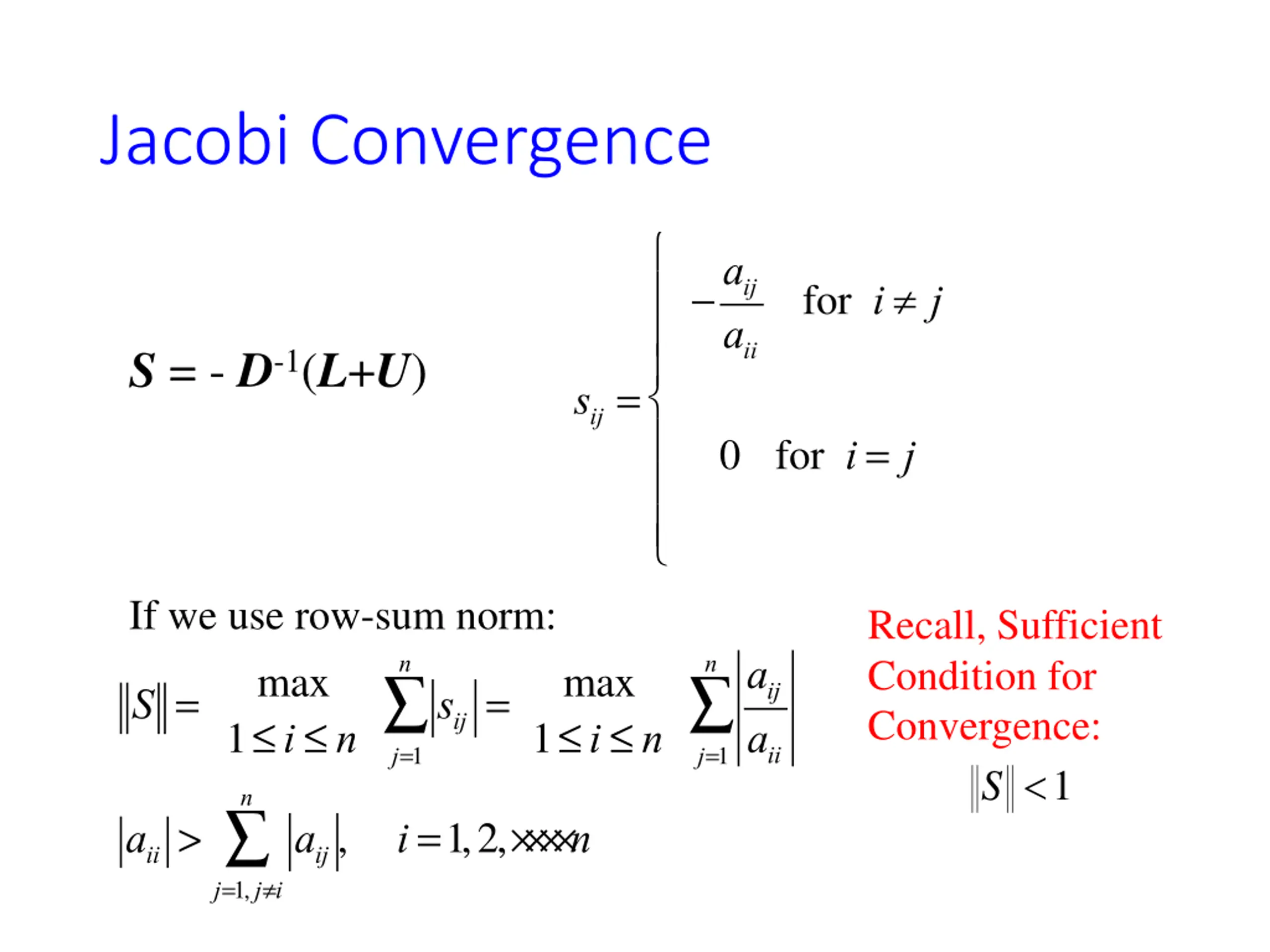 Jacobi Convergence -aij aii for i j S = - D-1(L+U) sij= 0 for i = j If we use row-sum norm: max 1 i n Recall, Sufficient Condition for Convergence: S n n aij aii max 1 i n S = sij= j=1 j=1 1 n aii> , i =1,2, n aij j=1,j i