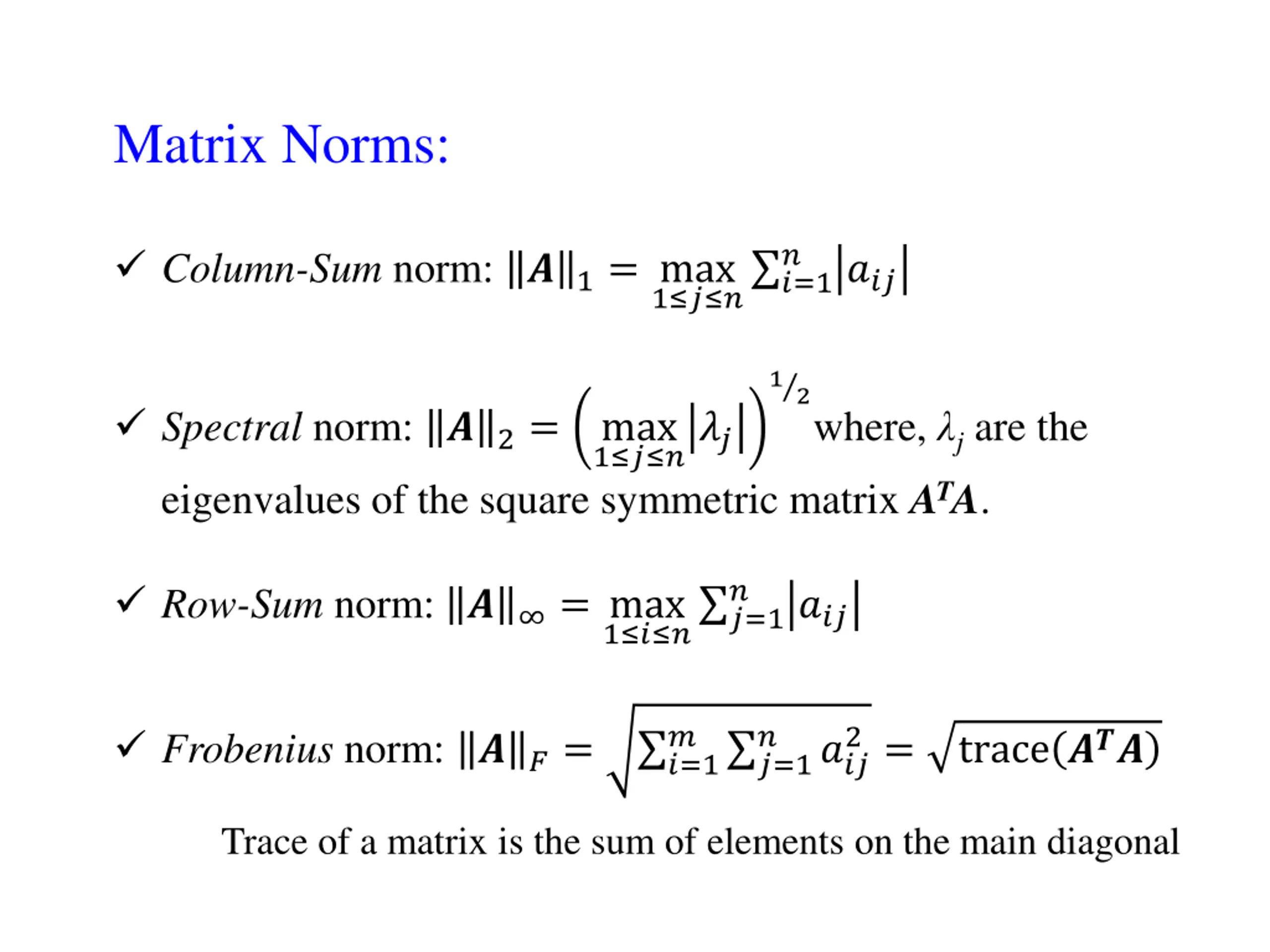 Matrix Norms: ? Column-Sum norm: ?1= max 1 ? ? ?=1 ??? 12where, j are the Spectral norm: ?2= eigenvalues of the square symmetric matrix ATA. max 1 ? ??? ? Row-Sum norm: ? = max 1 ? ? ?=1 ??? ? ?=1 ? 2= Frobenius norm: ??= trace ??? ?=1 ??? Trace of a matrix is the sum of elements on the main diagonal