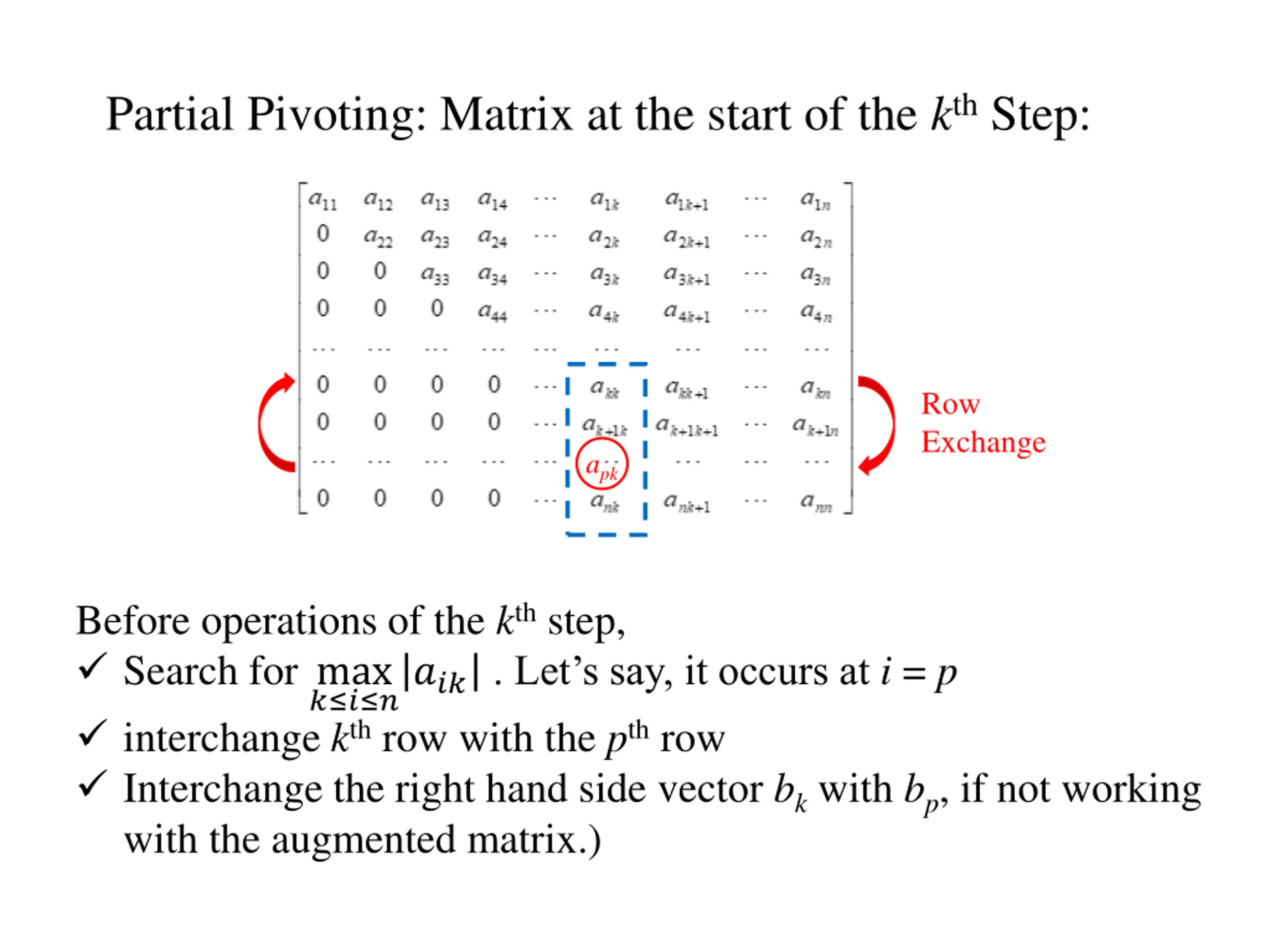 Partial Pivoting: Matrix at the start of the kth Step: Row Exchange apk Before operations of the kth step, Search for max interchange kth row with the pth row Interchange the right hand side vector bk with bp, if not working with the augmented matrix.) ? ? ????. Let s say, it occurs at i = p