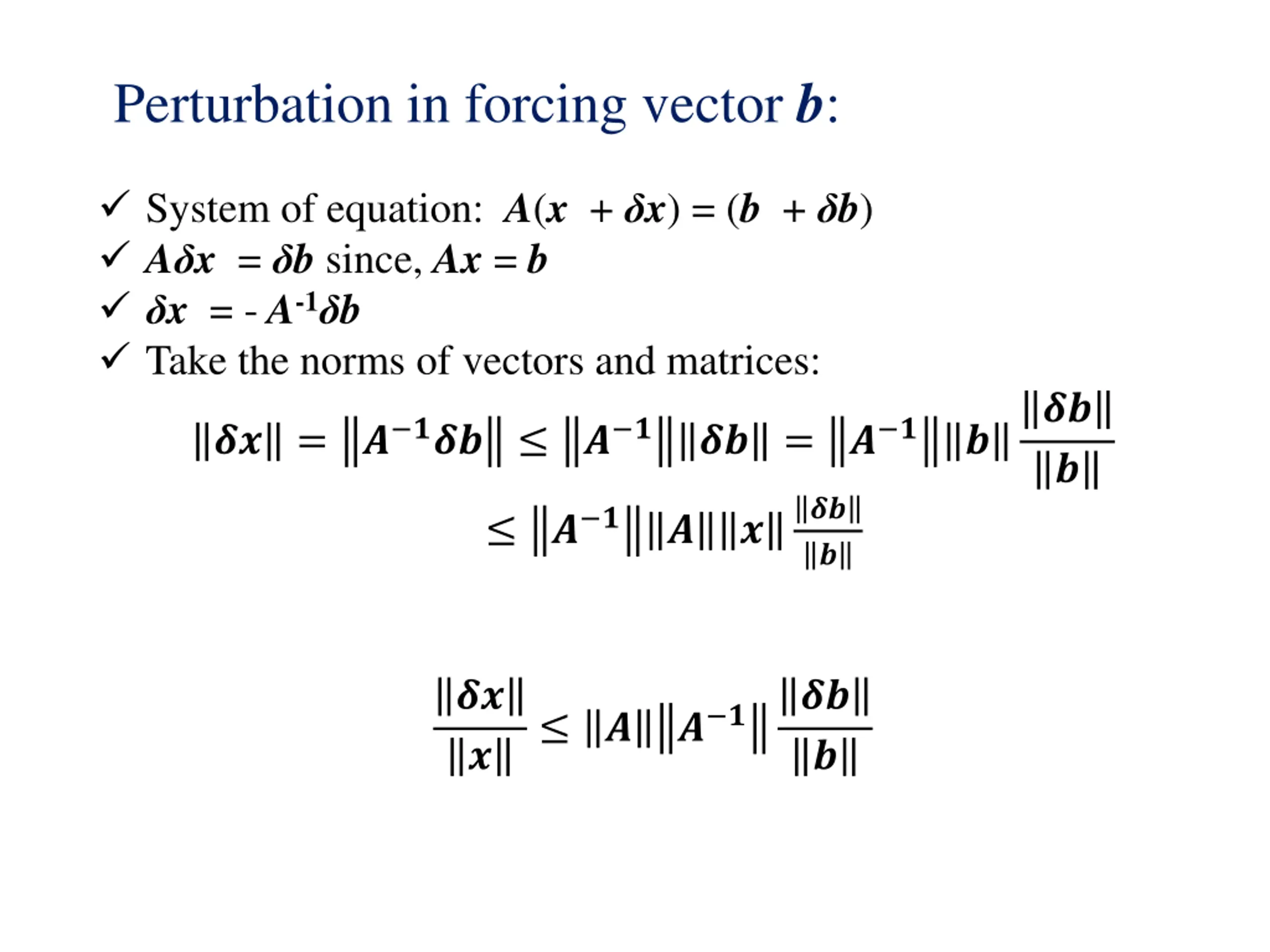 Perturbation in forcing vector b: System of equation: A(x + x)=(b + b) A x = b since, Ax = b x =- A-1 b Take the norms of vectors and matrices: ?? ? ?? = ? ??? ? ? ?? = ? ? ? ?? ? ? ? ? ? ?? ? ?? ? ? ? ?