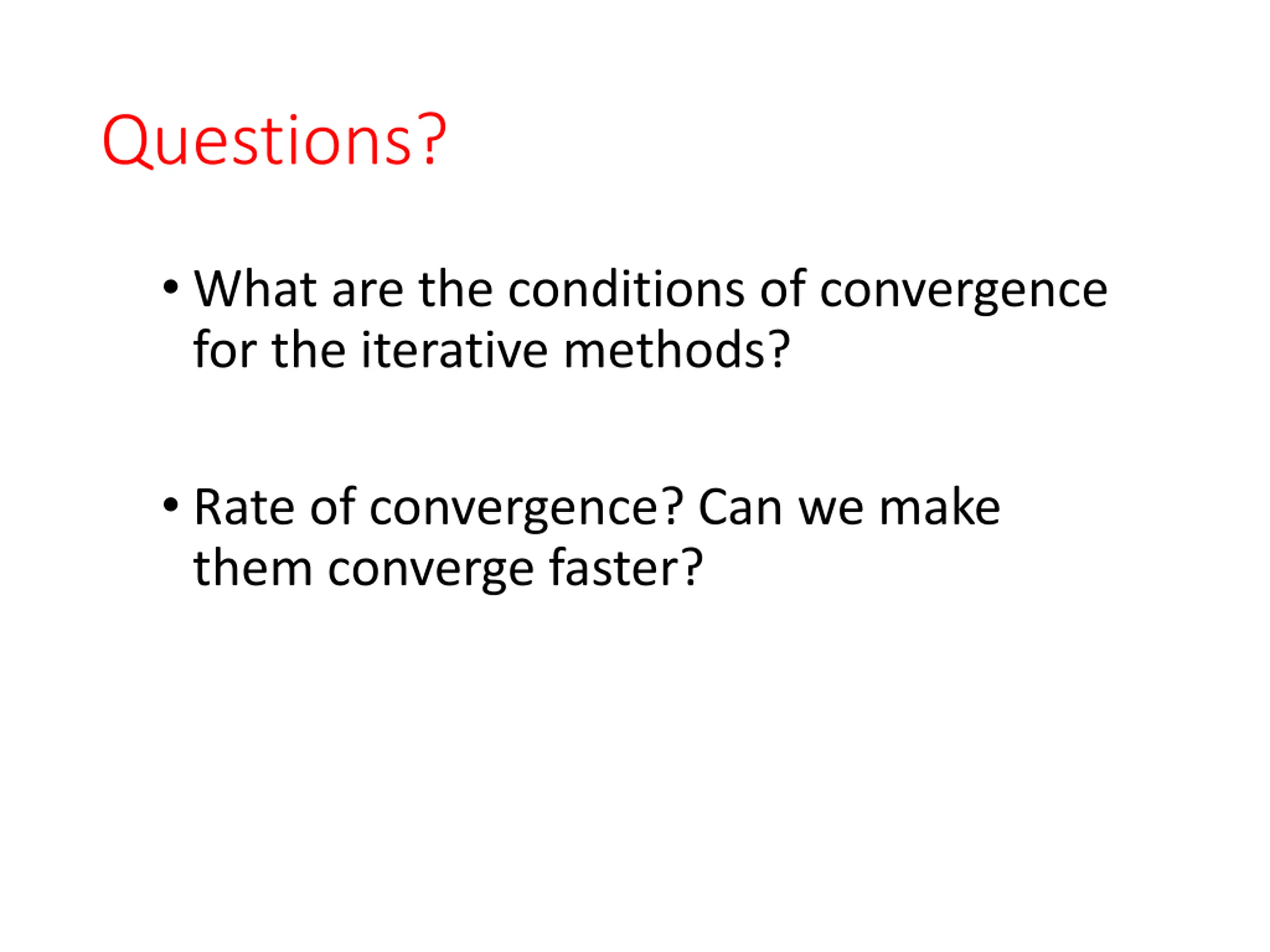 Questions? What are the conditions of convergence for the iterative methods? Rate of convergence? Can we make them converge faster?