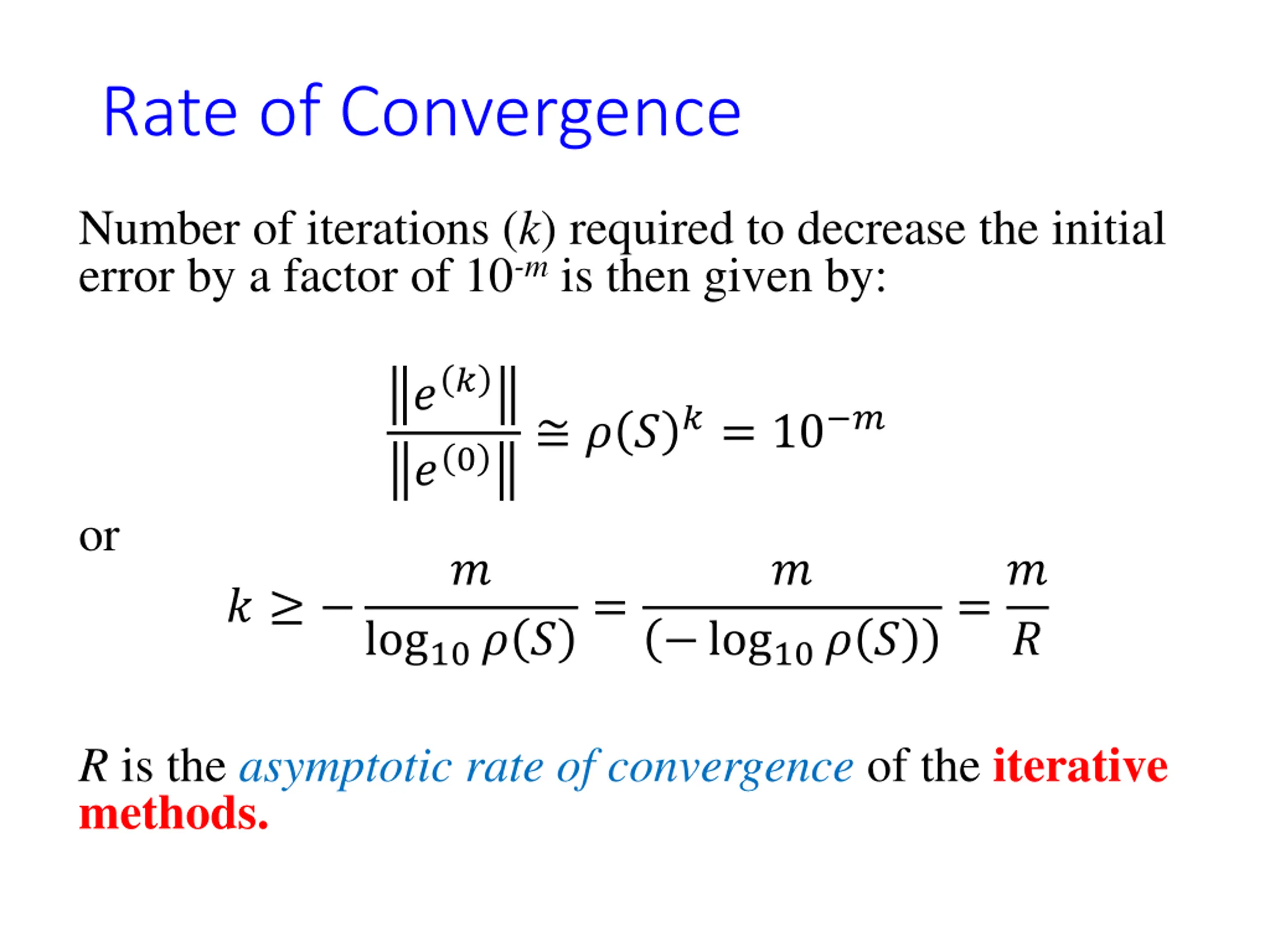 Rate of Convergence Number of iterations (k) required to decrease the initial error by a factor of 10-m is then given by: ?? ?0 ? ??= 10 ? or ? ? =? ? = log10? ? log10? ? ? R is the asymptotic rate of convergence of the iterative methods.