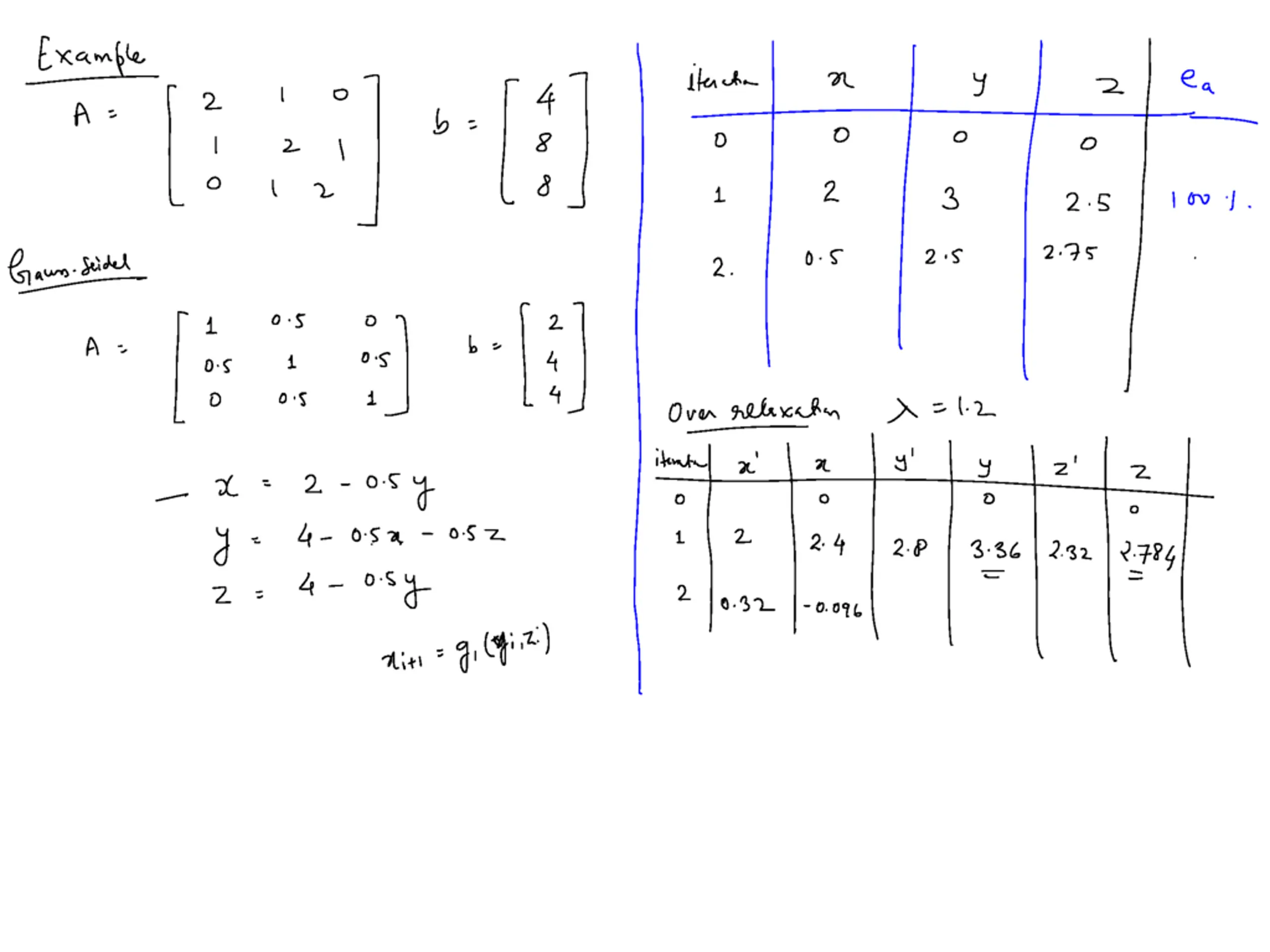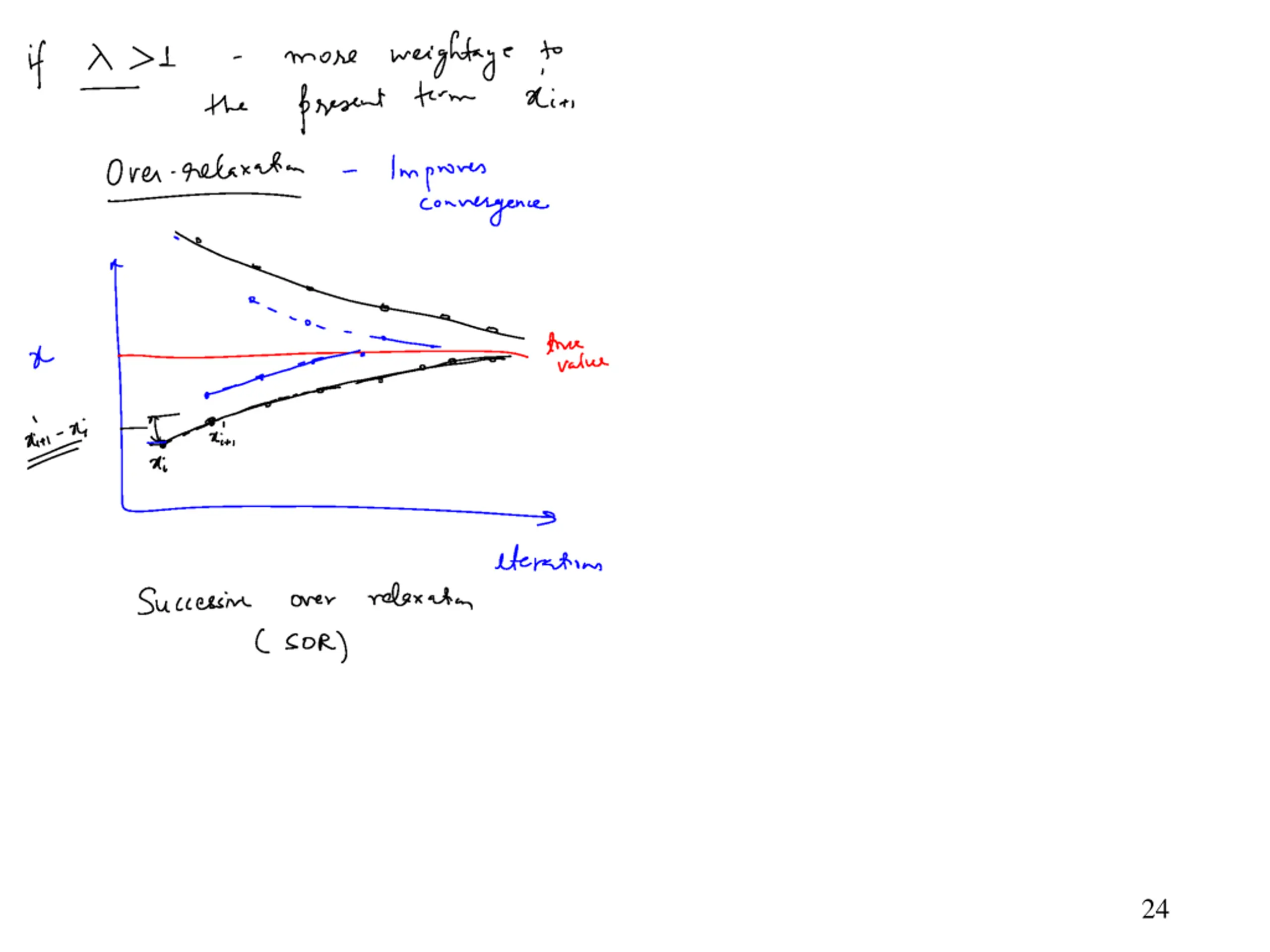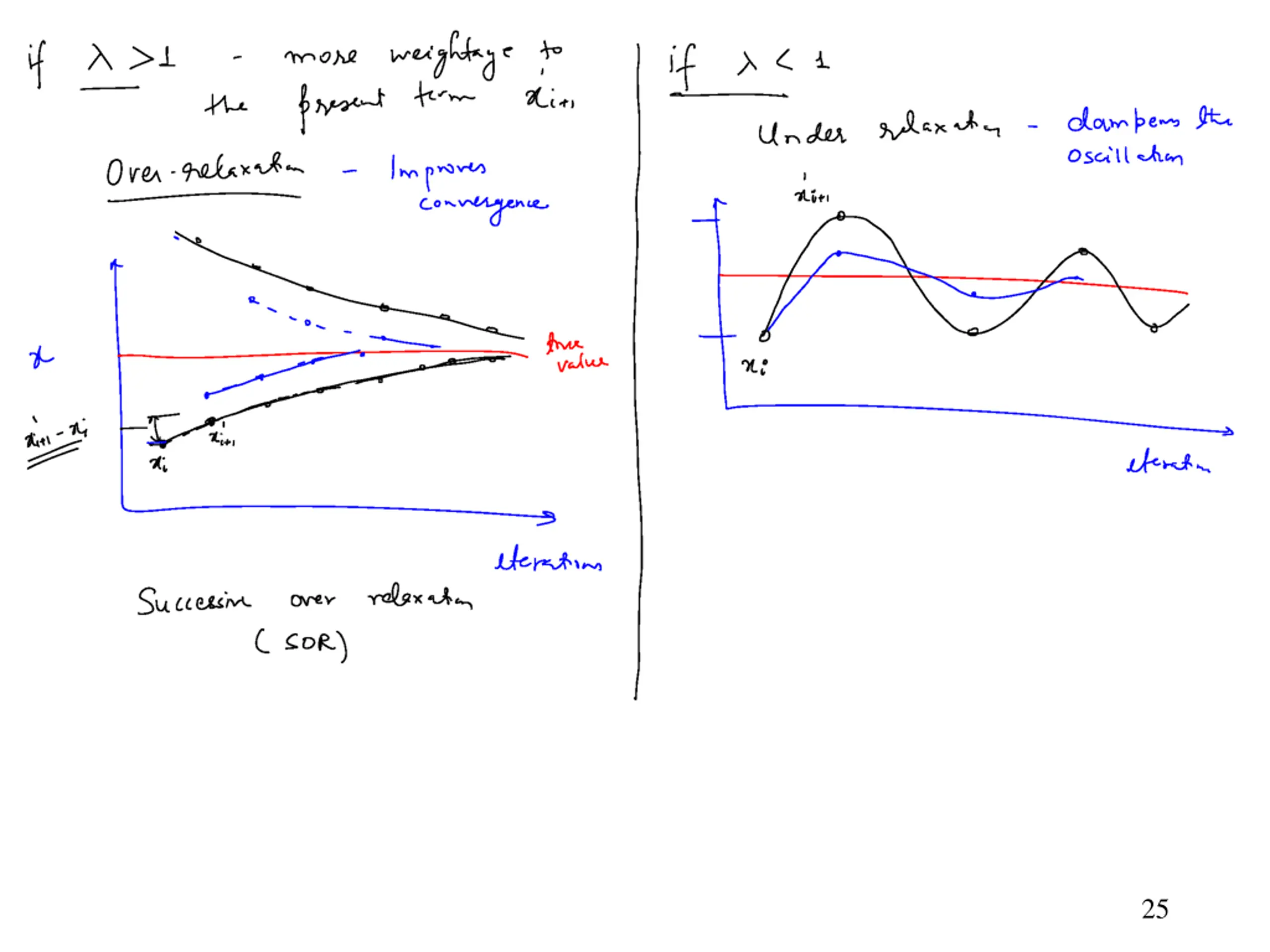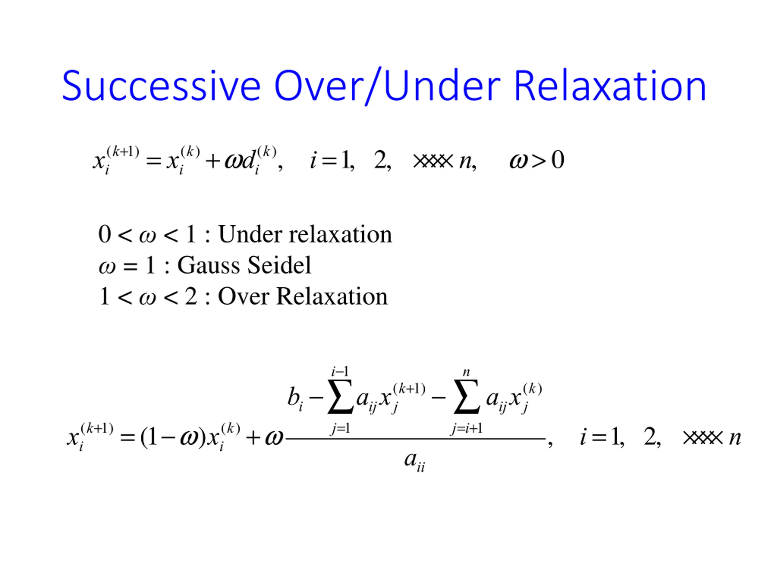 Successive Over/Under Relaxation (k+1)= xi (k)+wdi (k), i=1, 2, n, w >0 xi 0 < < 1 : Under relaxation = 1 : Gauss Seidel 1 < < 2 : Over Relaxation i-1 n (k+1)- bi- (k) aijxj aijxj j=1 j=i+1 (k+1)=(1-w)xi (k)+w , i =1, 2, n xi aii