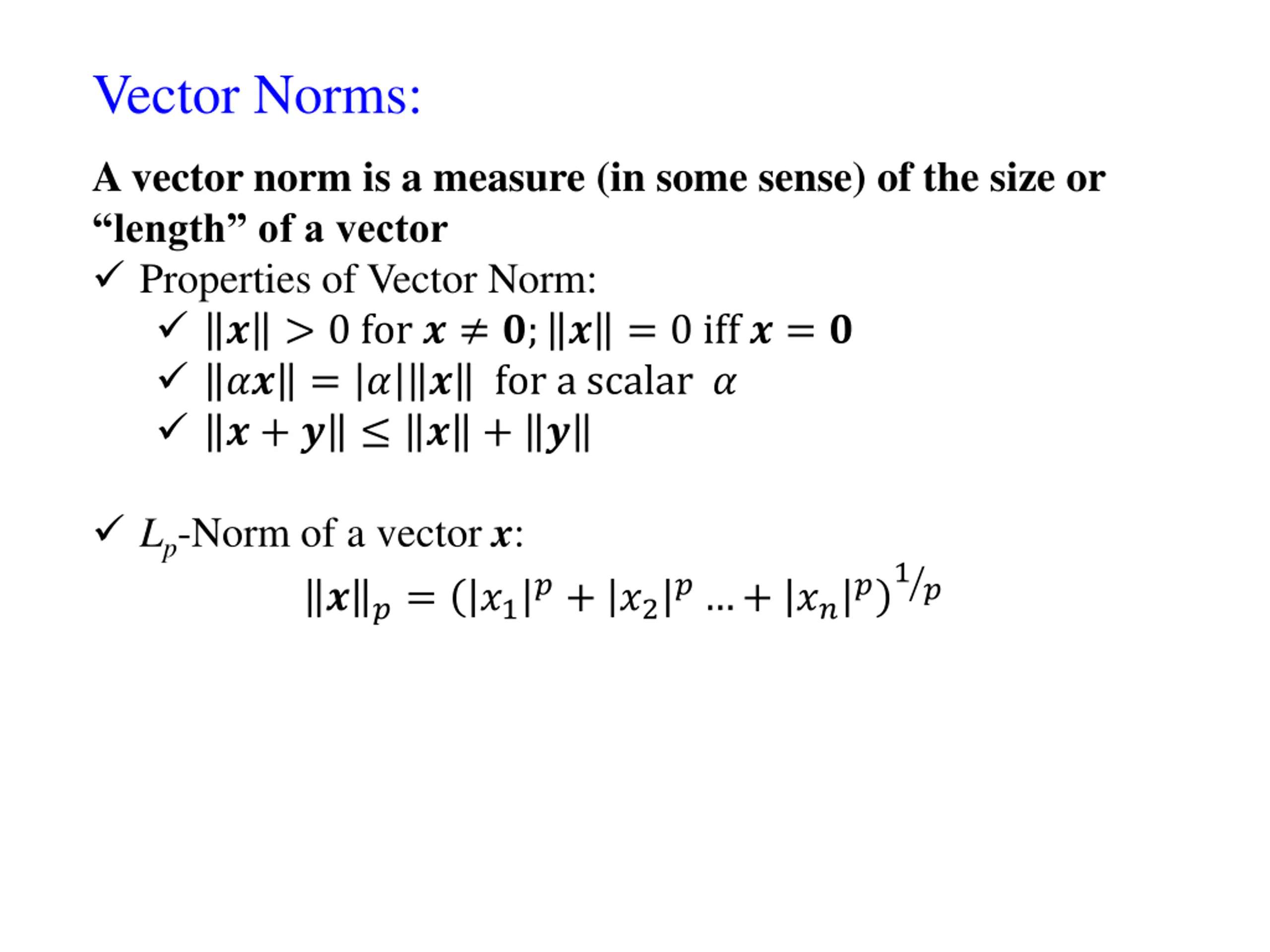 Vector Norms: A vector norm is a measure (in some sense) of the size or length of a vector Properties of Vector Norm: ? > 0 for ? ?; ? = 0 iff ? = ? ?? = ? ? for a scalar ? ? + ? ? + ? Lp-Norm of a vector x: 1? ?+ ?2 ? + ?? ? ??= ?1