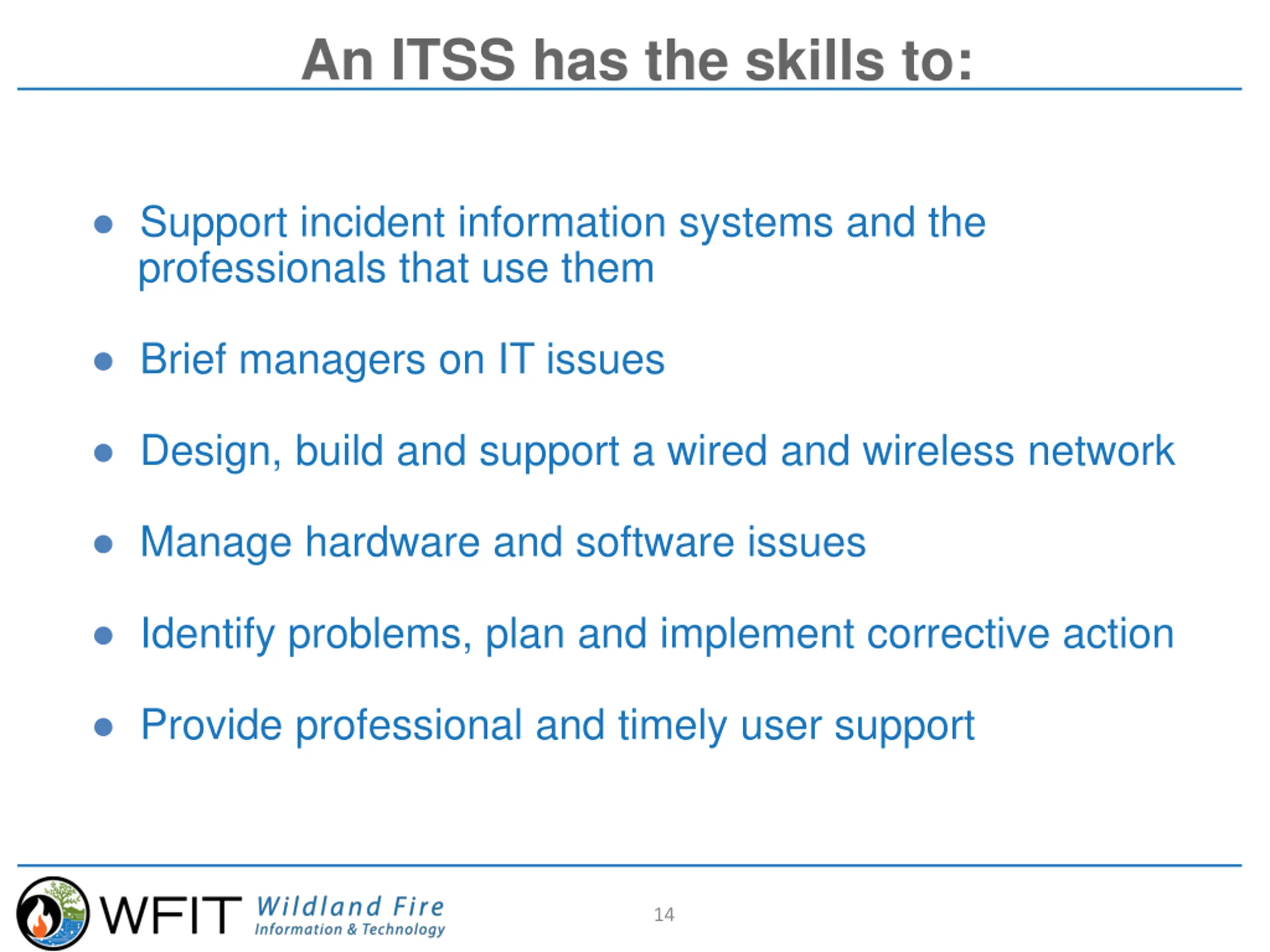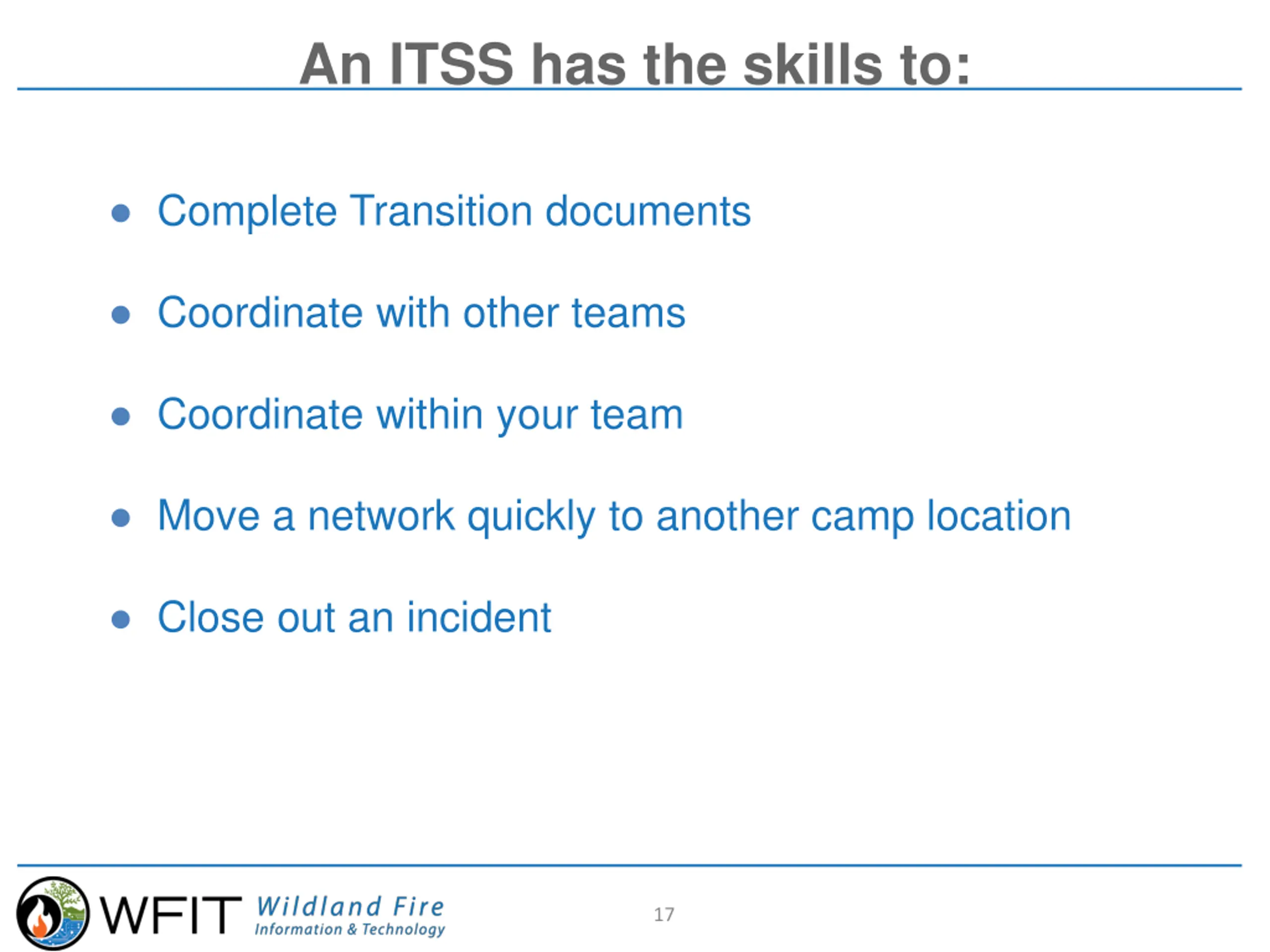 An ITSS has the skills to: Complete Transition documents Coordinate with other teams Coordinate within your team Move a network quickly to another camp location Close out an incident 17