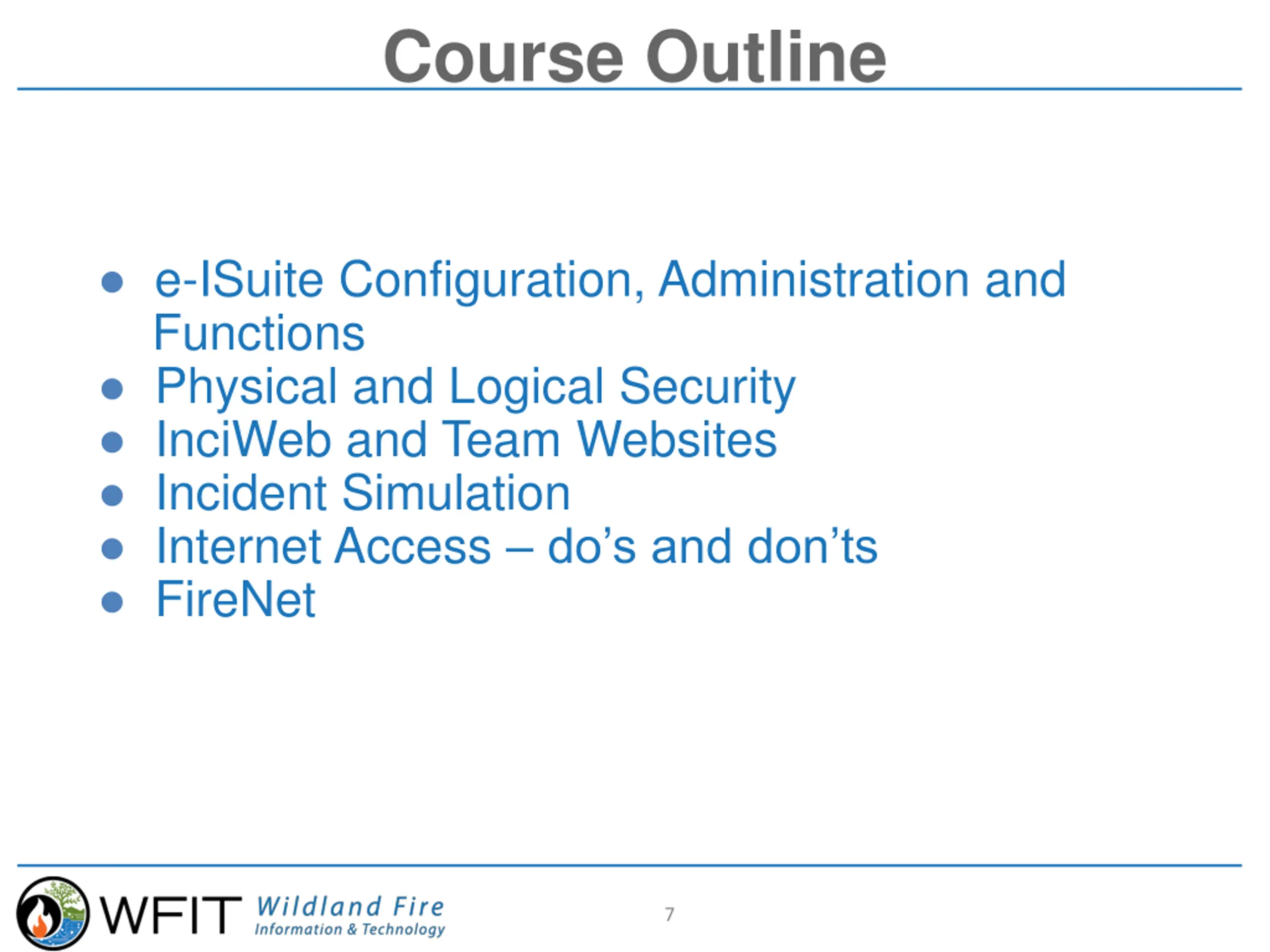 Course Outline e-ISuite Configuration, Administration and Functions Physical and Logical Security InciWeb and Team Websites Incident Simulation Internet Access do s and don ts FireNet 7