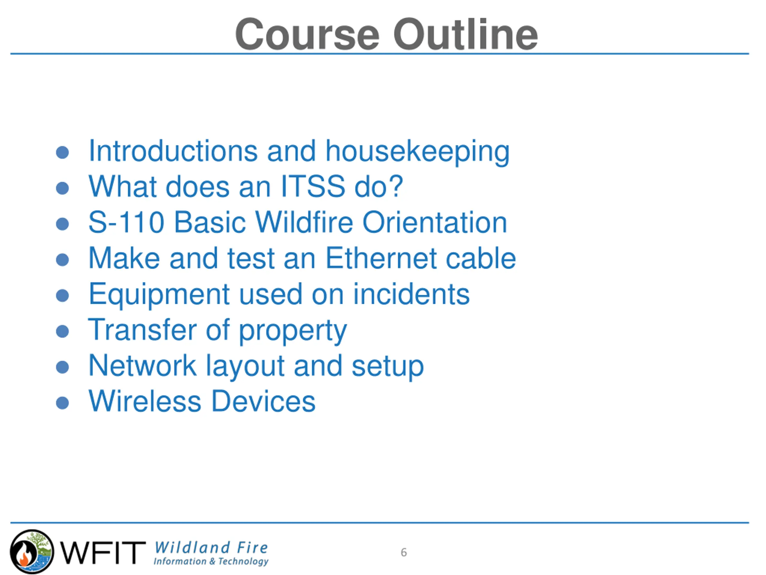 Course Outline Introductions and housekeeping What does an ITSS do? S-110 Basic Wildfire Orientation Make and test an Ethernet cable Equipment used on incidents Transfer of property Network layout and setup Wireless Devices 6
