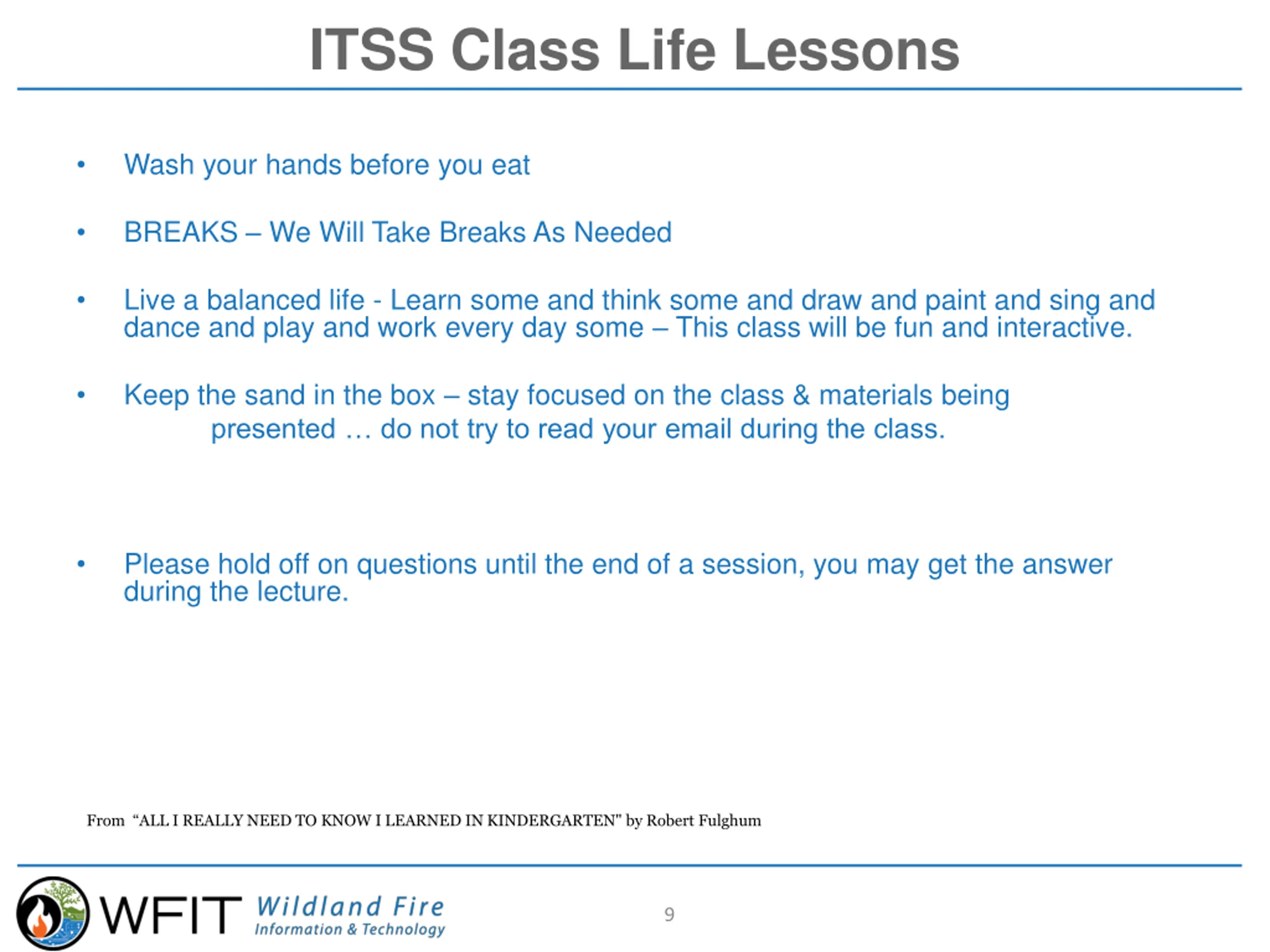 ITSS Class Life Lessons Wash your hands before you eat BREAKS We Will Take Breaks As Needed Live a balanced life - Learn some and think some and draw and paint and sing and dance and play and work every day some This class will be fun and interactive. Keep the sand in the box stay focused on the class & materials being presented do not try to read your email during the class. Please hold off on questions until the end of a session, you may get the answer during the lecture. From ALL I REALLY NEED TO KNOW I LEARNED IN KINDERGARTEN" by Robert Fulghum 9