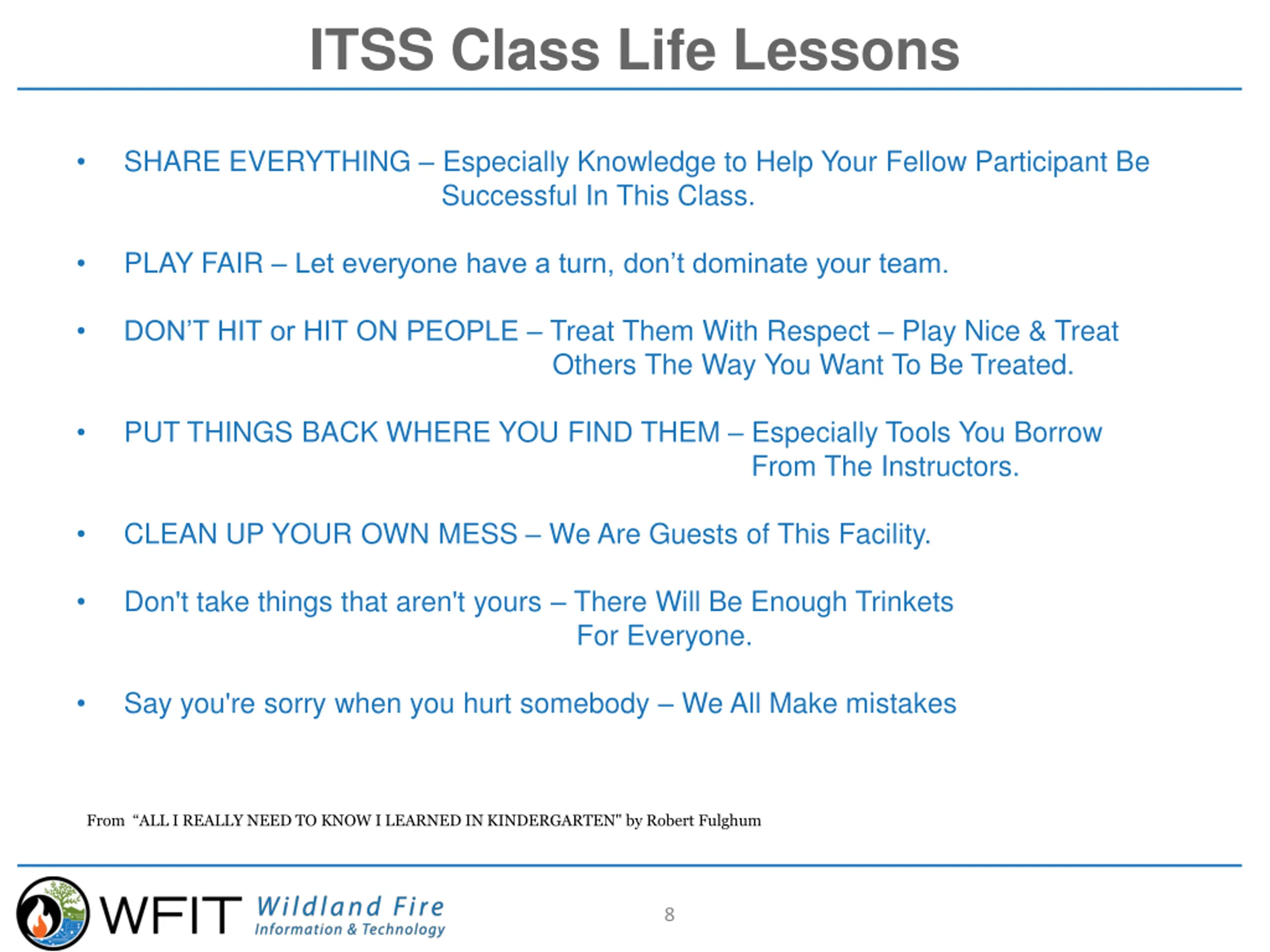 ITSS Class Life Lessons SHARE EVERYTHING Especially Knowledge to Help Your Fellow Participant Be Successful In This Class. PLAY FAIR Let everyone have a turn, don t dominate your team. DON T HIT or HIT ON PEOPLE Treat Them With Respect Play Nice & Treat Others The Way You Want To Be Treated. PUT THINGS BACK WHERE YOU FIND THEM Especially Tools You Borrow From The Instructors. CLEAN UP YOUR OWN MESS We Are Guests of This Facility. Don't take things that aren't yours There Will Be Enough Trinkets For Everyone. Say you're sorry when you hurt somebody We All Make mistakes From ALL I REALLY NEED TO KNOW I LEARNED IN KINDERGARTEN" by Robert Fulghum 8