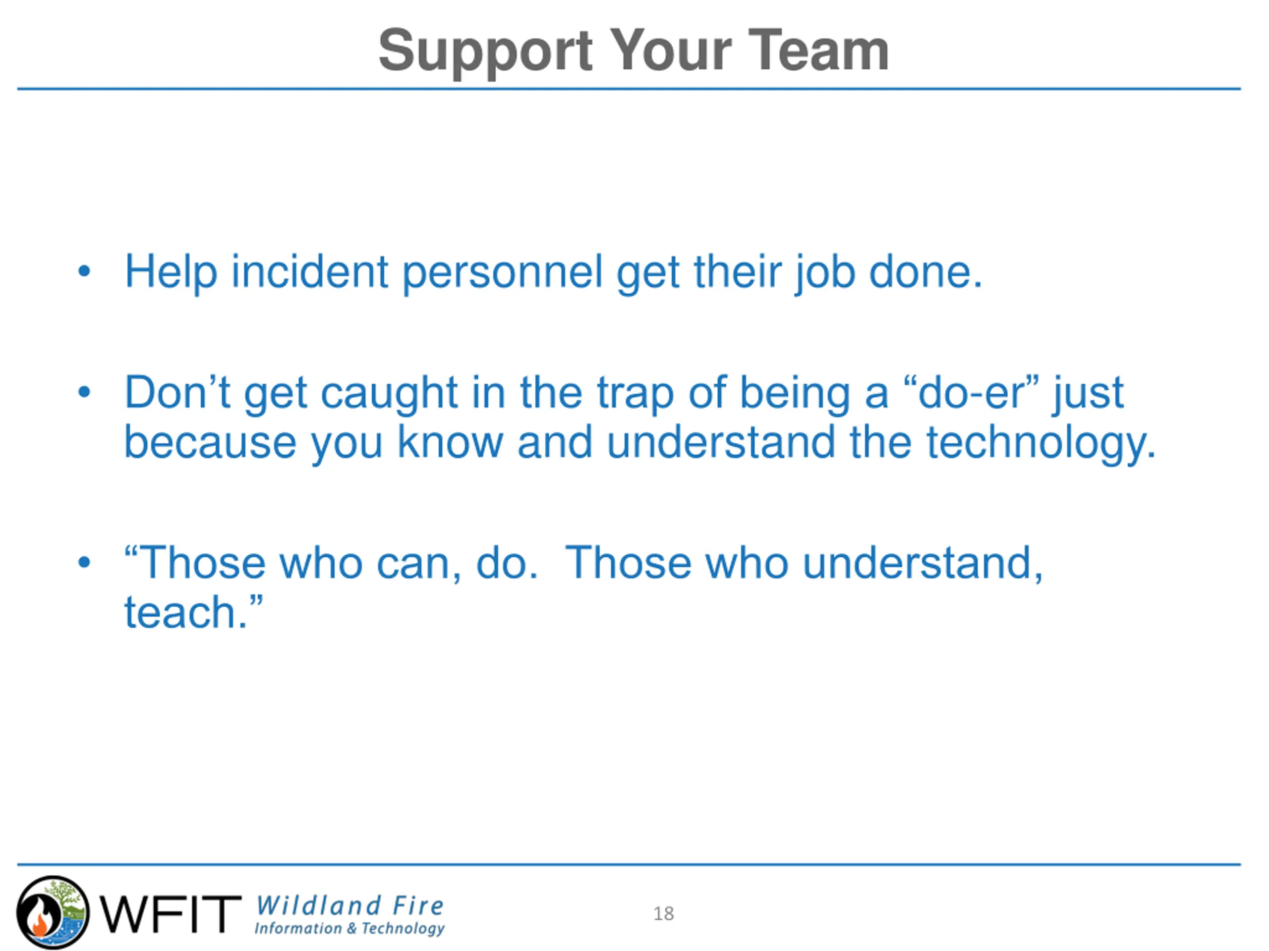 Support Your Team Help incident personnel get their job done. Don t get caught in the trap of being a do-er just because you know and understand the technology. Those who can, do. Those who understand, teach. 18