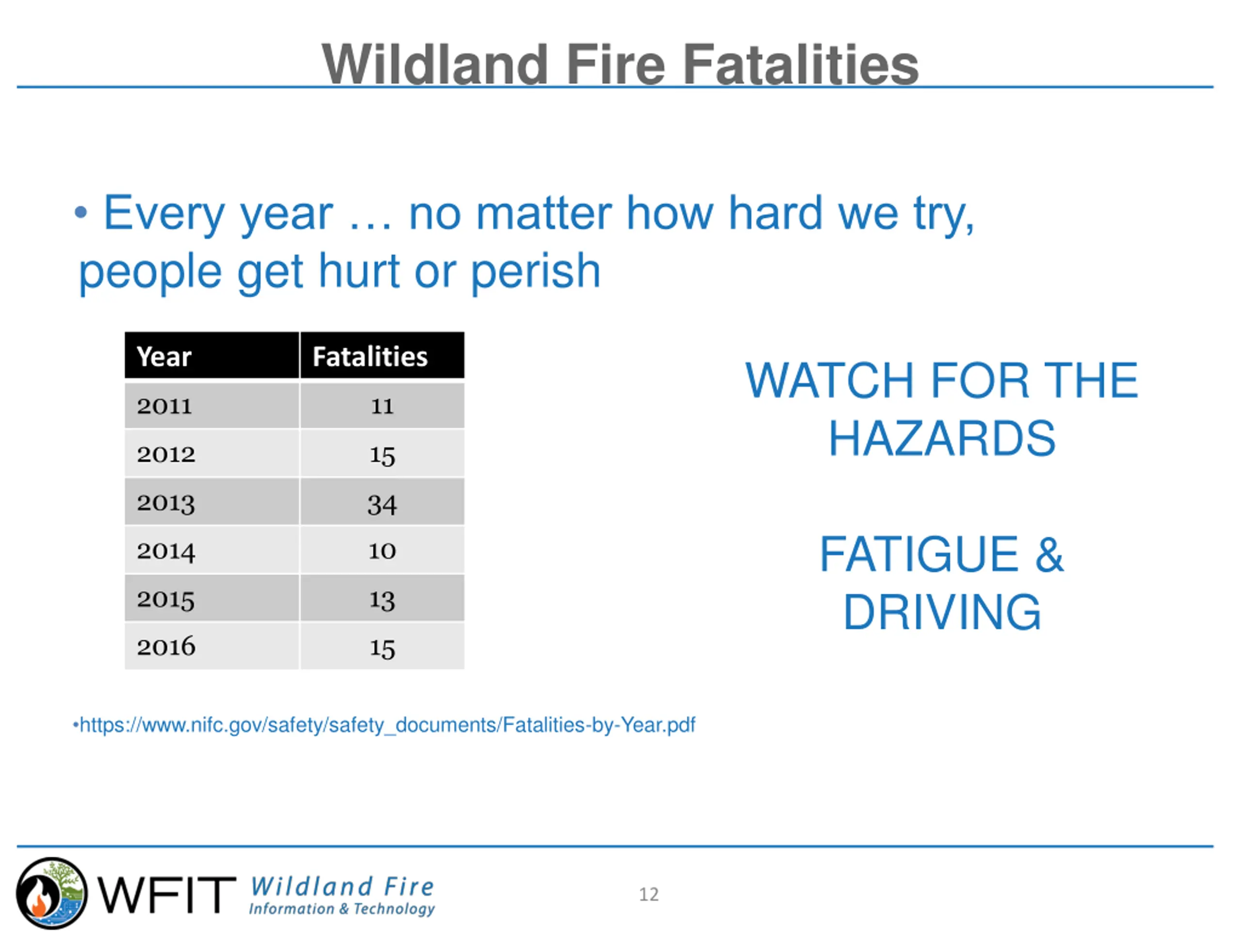 Wildland Fire Fatalities Every year no matter how hard we try, people get hurt or perish Year Fatalities WATCH FOR THE HAZARDS 2011 11 2012 15 2013 34 FATIGUE & DRIVING 2014 10 2015 13 2016 15 https://www.nifc.gov/safety/safety_documents/Fatalities-by-Year.pdf 12
