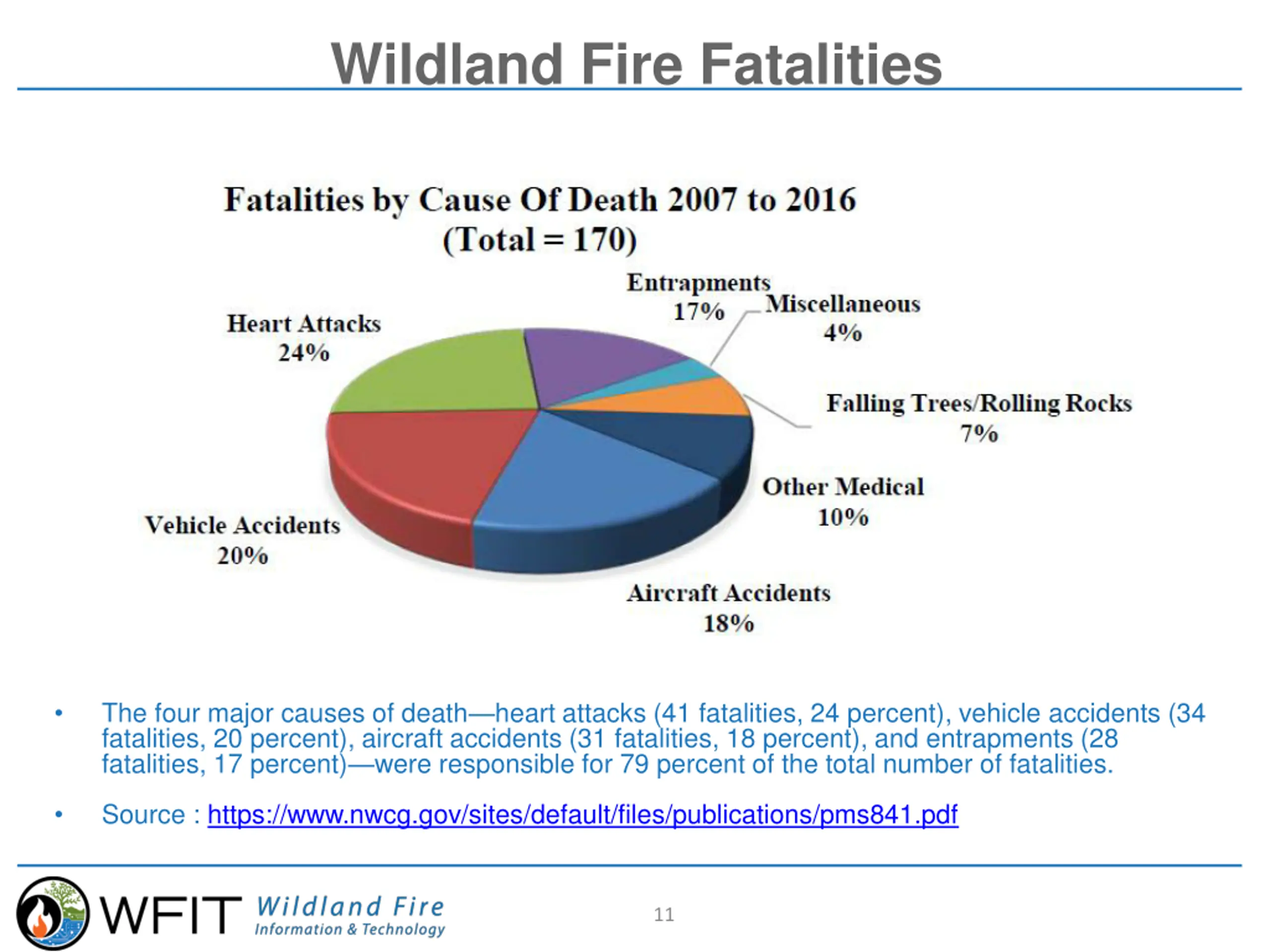 Wildland Fire Fatalities The four major causes of death heart attacks (41 fatalities, 24 percent), vehicle accidents (34 fatalities, 20 percent), aircraft accidents (31 fatalities, 18 percent), and entrapments (28 fatalities, 17 percent) were responsible for 79 percent of the total number of fatalities. Source : https://www.nwcg.gov/sites/default/files/publications/pms841.pdf 11