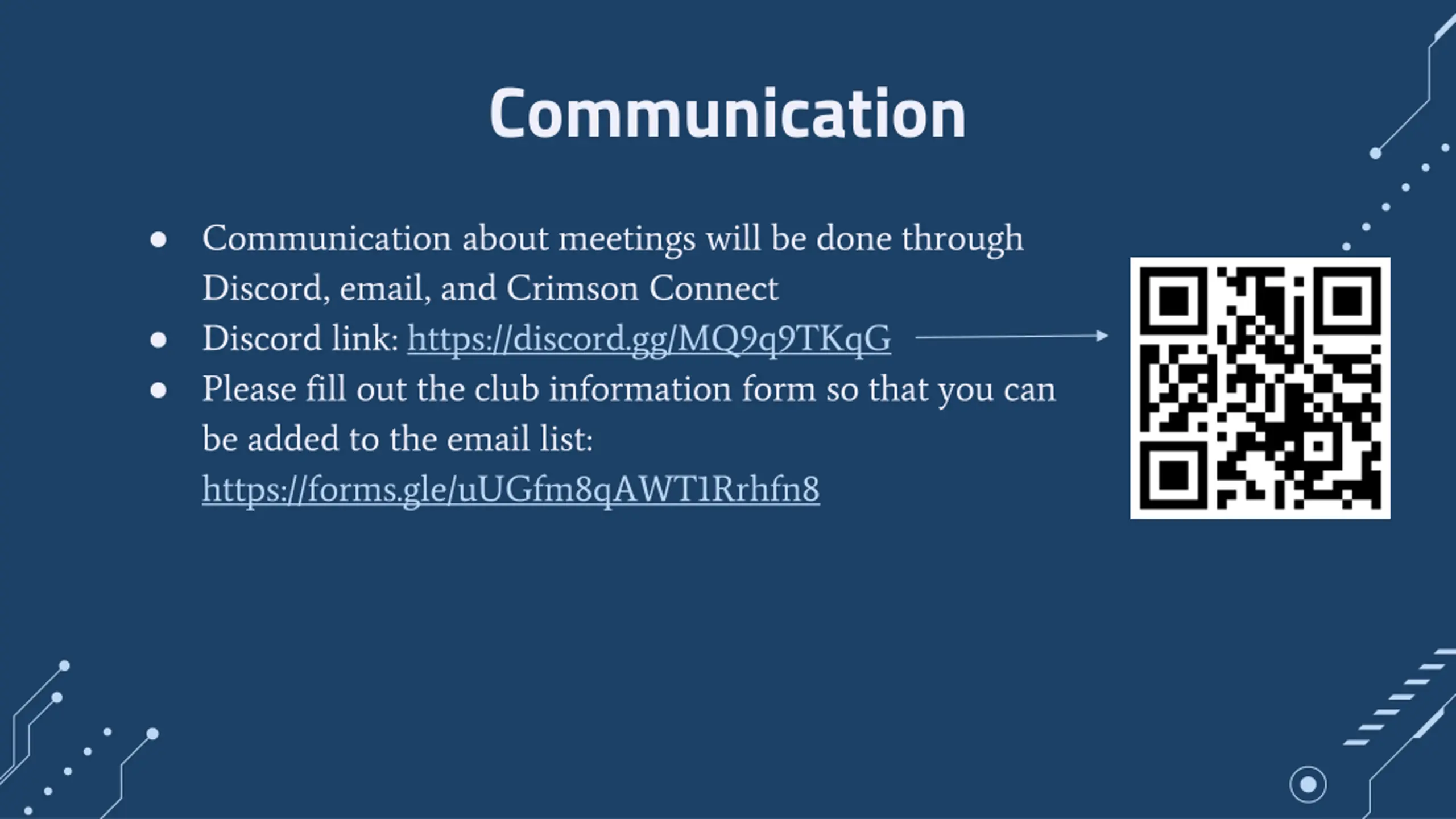 Communication Communication about meetings will be done through Discord, email, and Crimson Connect Discord link: https://discord.gg/MQ9q9TKqG Please fill out the club information form so that you can be added to the email list: https://forms.gle/uUGfm8qAWT1Rrhfn8