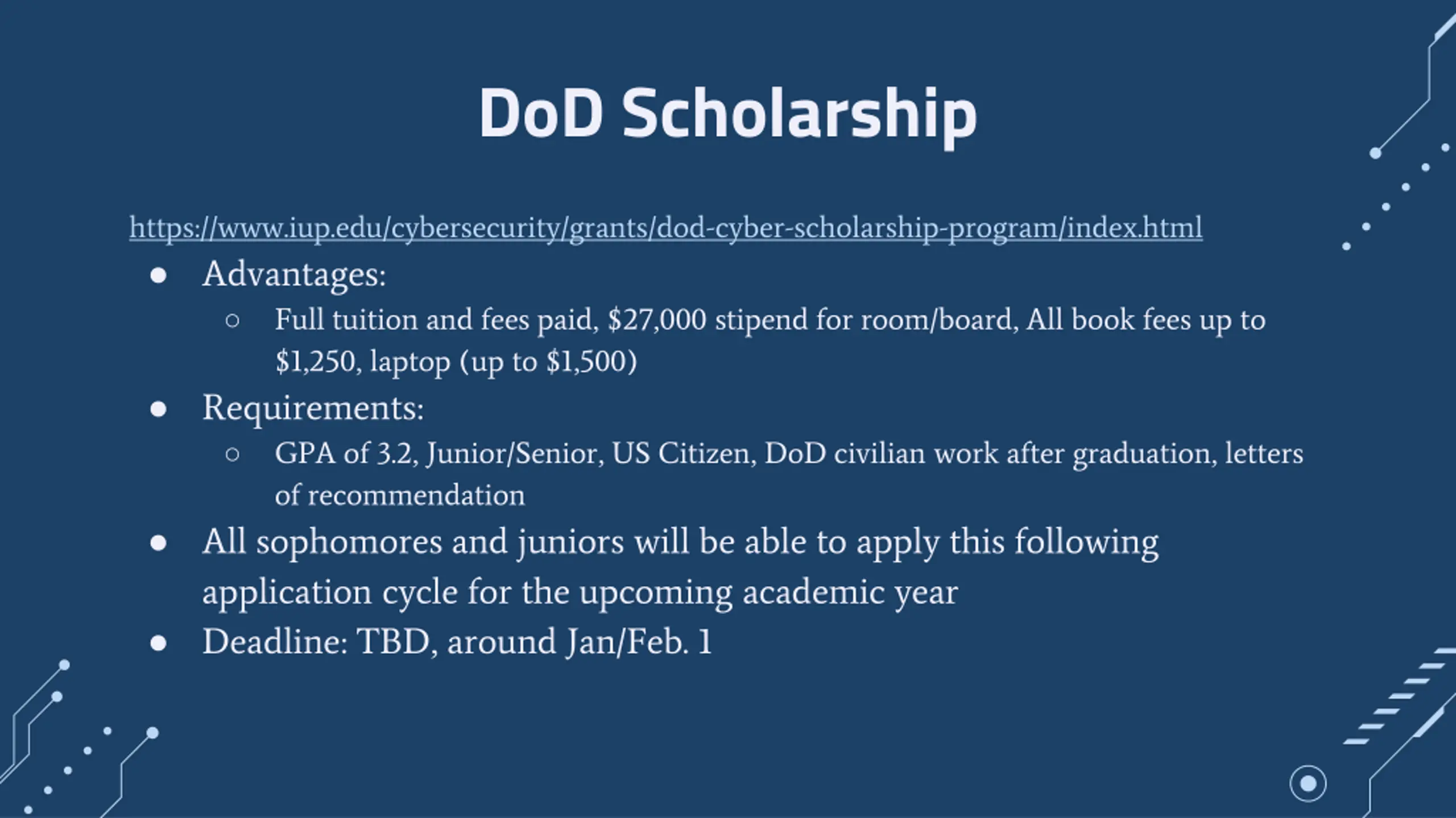 DoD Scholarship https://www.iup.edu/cybersecurity/grants/dod-cyber-scholarship-program/index.html Advantages: Full tuition and fees paid, $27,000 stipend for room/board, All book fees up to $1,250, laptop (up to $1,500) Requirements: GPA of 3.2, Junior/Senior, US Citizen, DoD civilian work after graduation, letters of recommendation All sophomores and juniors will be able to apply this following application cycle for the upcoming academic year Deadline: TBD, around Jan/Feb. 1