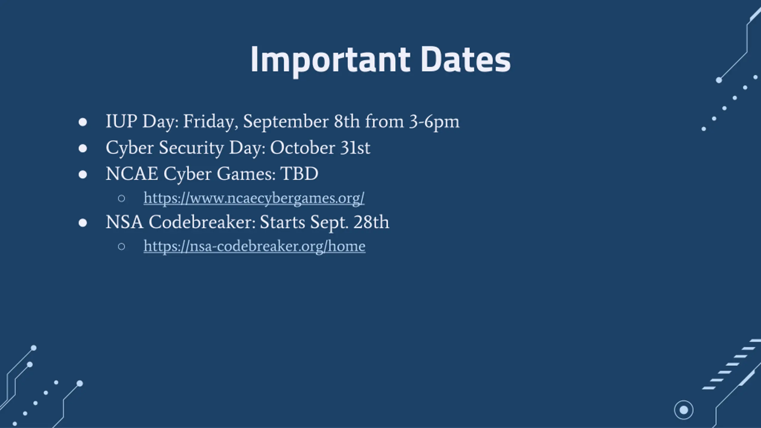 Important Dates IUP Day: Friday, September 8th from 3-6pm Cyber Security Day: October 31st NCAE Cyber Games: TBD https://www.ncaecybergames.org/ NSA Codebreaker: Starts Sept. 28th https://nsa-codebreaker.org/home