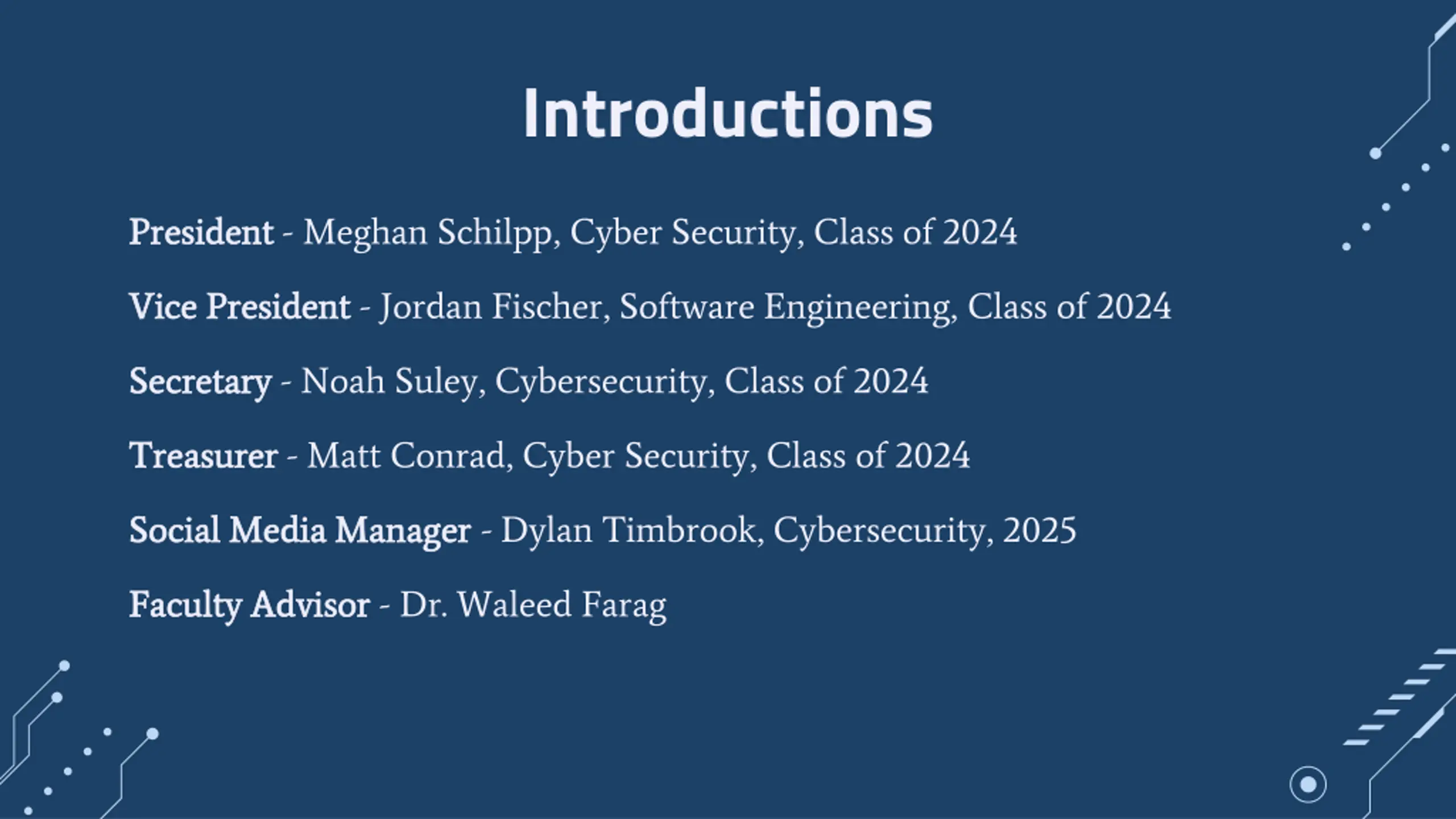 Introductions President President - Meghan Schilpp, Cyber Security, Class of 2024 Vice President Vice President - Jordan Fischer, Software Engineering, Class of 2024 Secretary Secretary - Noah Suley, Cybersecurity, Class of 2024 Treasurer Treasurer - Matt Conrad, Cyber Security, Class of 2024 Social Media Manager Social Media Manager - Dylan Timbrook, Cybersecurity, 2025 Faculty Advisor Faculty Advisor - Dr. Waleed Farag