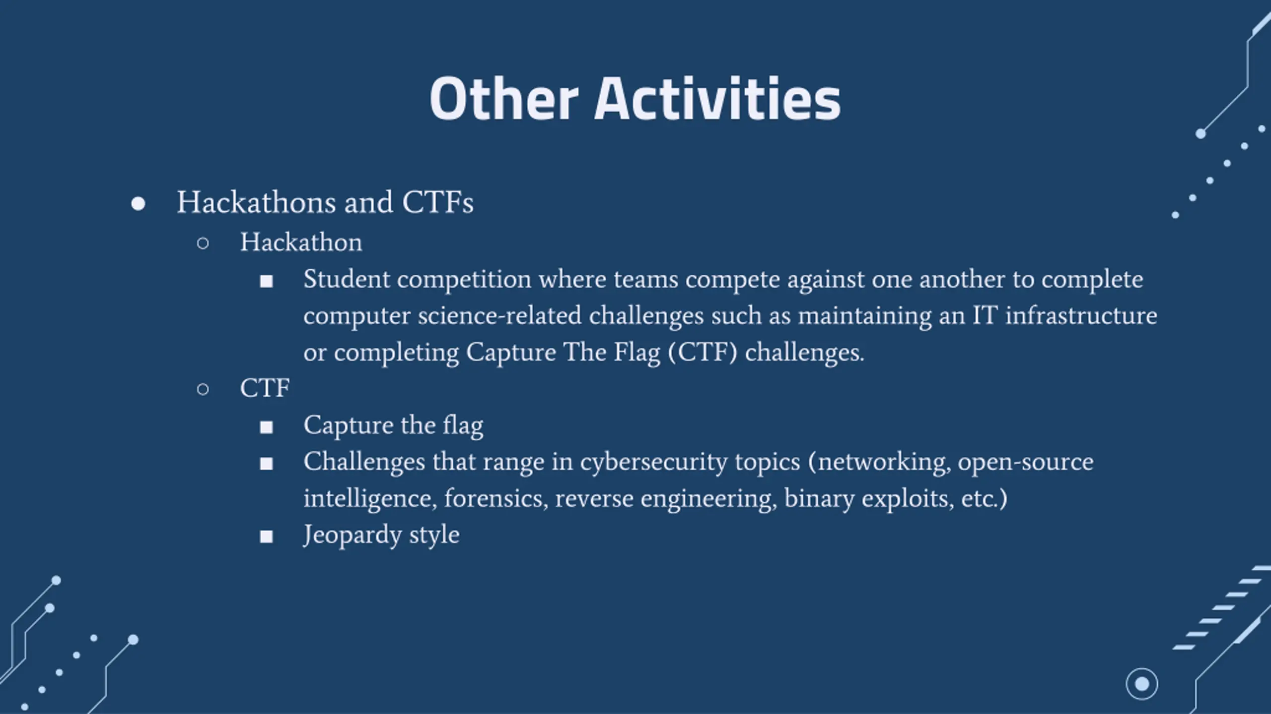 Other Activities Hackathons and CTFs Hackathon Student competition where teams compete against one another to complete computer science-related challenges such as maintaining an IT infrastructure or completing Capture The Flag (CTF) challenges. CTF Capture the flag Challenges that range in cybersecurity topics (networking, open-source intelligence, forensics, reverse engineering, binary exploits, etc.) Jeopardy style