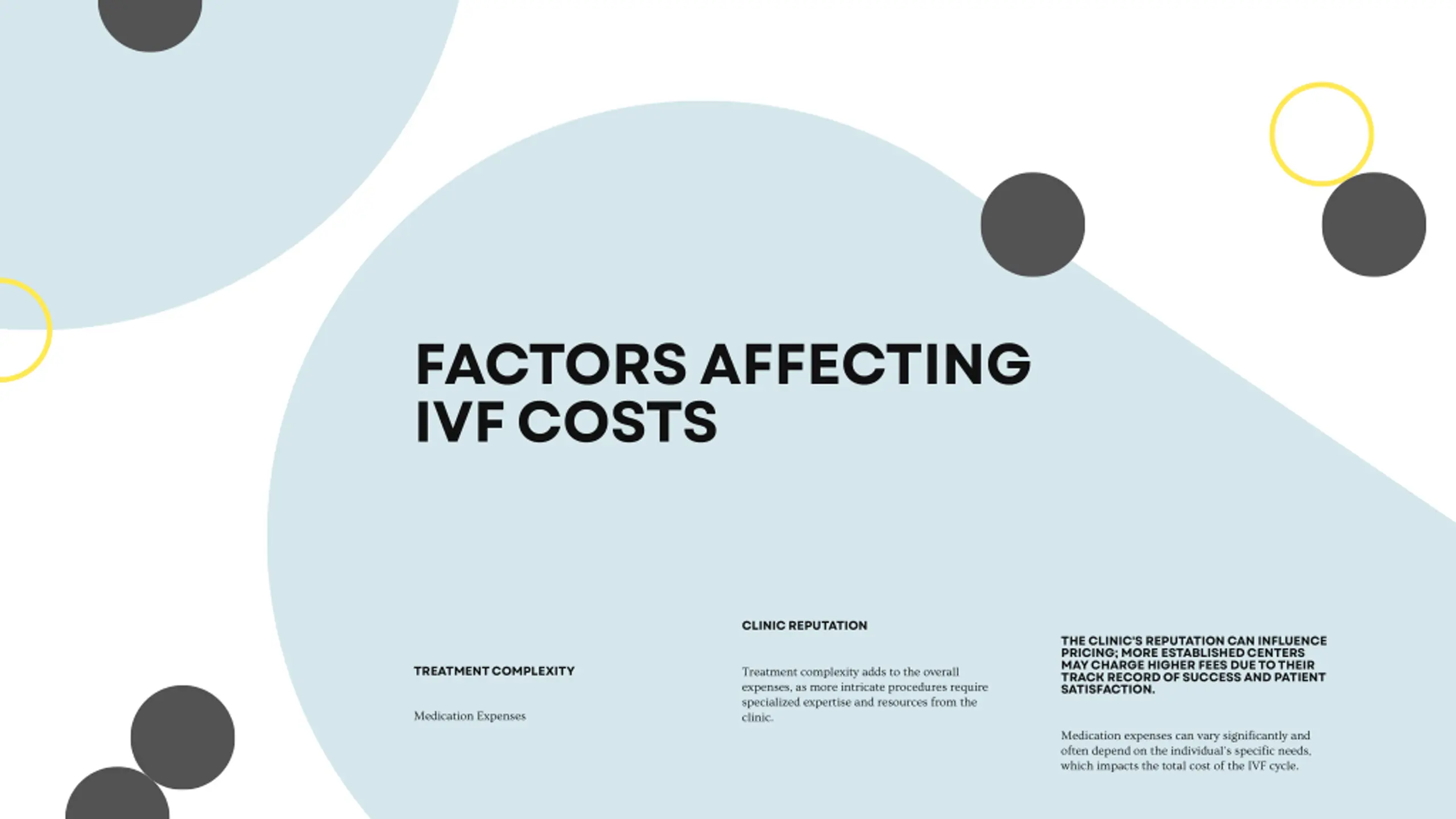 FACTORS AFFECTING IVF COSTS CLINIC REPUTATION THE CLINIC'S REPUTATION CAN INFLUENCE PRICING; MORE ESTABLISHED CENTERS MAY CHARGE HIGHER FEES DUE TO THEIR TRACK RECORD OF SUCCESS AND PATIENT SATISFACTION. TREATMENT COMPLEXITY Treatment complexity adds to the overall expenses, as more intricate procedures require specialized expertise and resources from the clinic. Medication Expenses Medication expenses can vary significantly and often depend on the individual's specific needs, which impacts the total cost of the IVF cycle.