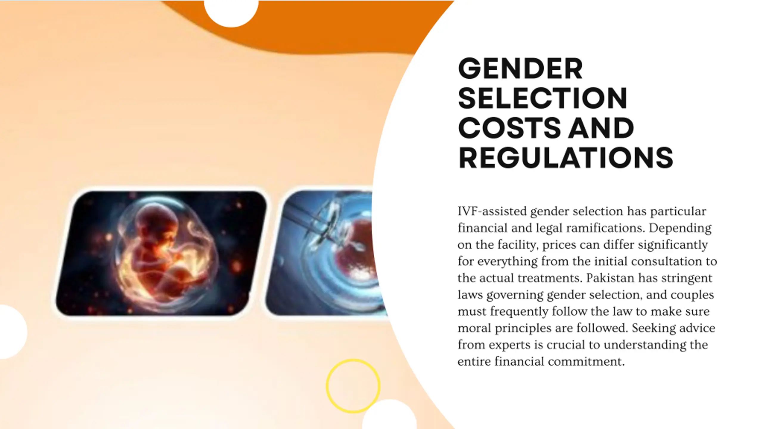 GENDER SELECTION COSTS AND REGULATIONS IVF-assisted gender selection has particular financial and legal ramifications. Depending on the facility, prices can differ significantly for everything from the initial consultation to the actual treatments. Pakistan has stringent laws governing gender selection, and couples must frequently follow the law to make sure moral principles are followed. Seeking advice from experts is crucial to understanding the entire financial commitment.