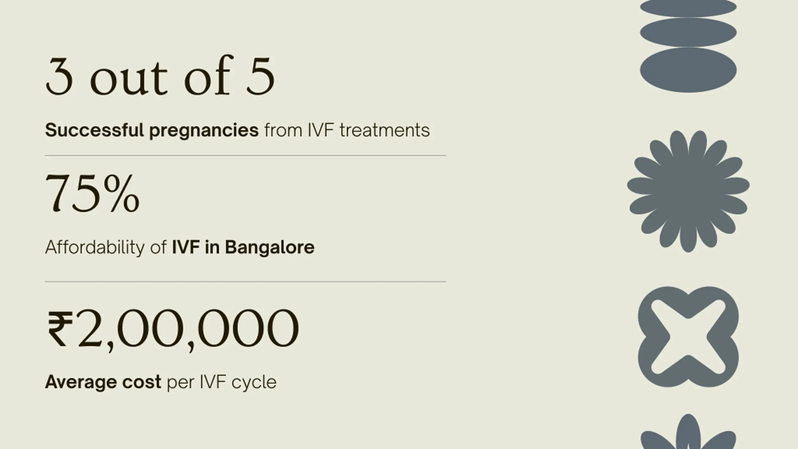 3 out of 5 Successful pregnancies from IVF treatments 75% Affordability of IVF in Bangalore 2,00,000 Average cost per IVF cycle