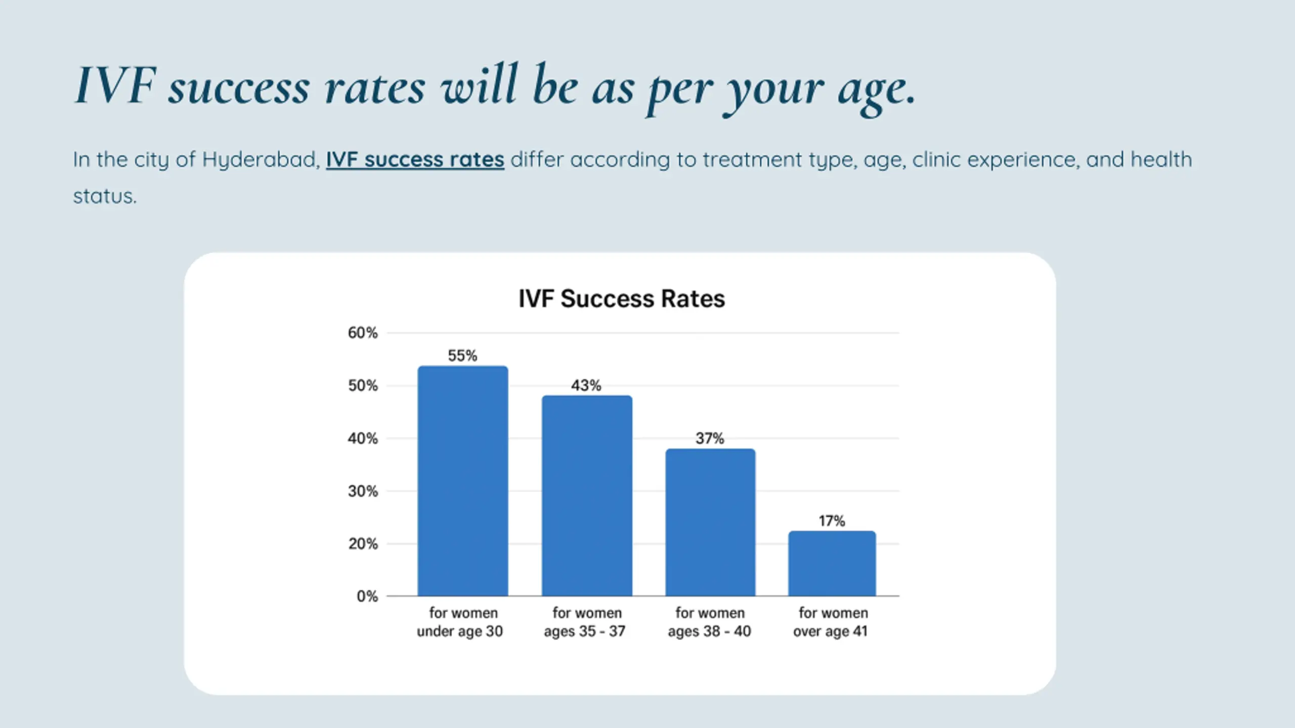 IVF success rates will be as per your age. In the city of Hyderabad, IVF success rates differ according to treatment type, age, clinic experience, and health status.