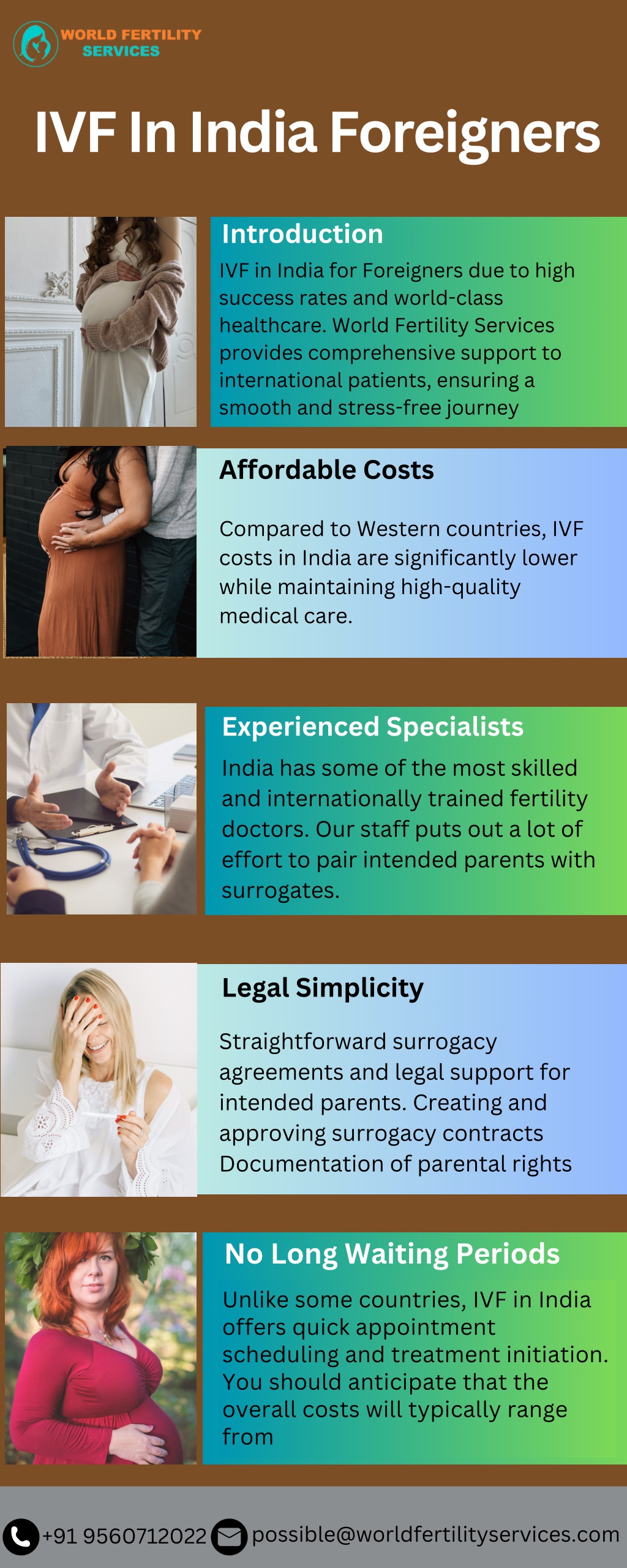 IVF In India Foreigners Introduction IVF in India for Foreigners due to high success rates and world-class healthcare. World Fertility Services provides comprehensive support to international patients, ensuring a smooth and stress-free journey Affordable Costs Compared to Western countries, IVF costs in India are significantly lower while maintaining high-quality medical care. Experienced Specialists India has some of the most skilled and internationally trained fertility doctors. Our staff puts out a lot of effort to pair intended parents with surrogates. Legal Simplicity Straightforward surrogacy agreements and legal support for intended parents. Creating and approving surrogacy contracts Documentation of parental rights No Long Waiting Periods Unlike some countries, IVF in India offers quick appointment scheduling and treatment initiation. You should anticipate that the overall costs will typically range from possible@worldfertilityservices.com +91 9560712022 +91- 9560712022 info@surrogatemotherkenya.com