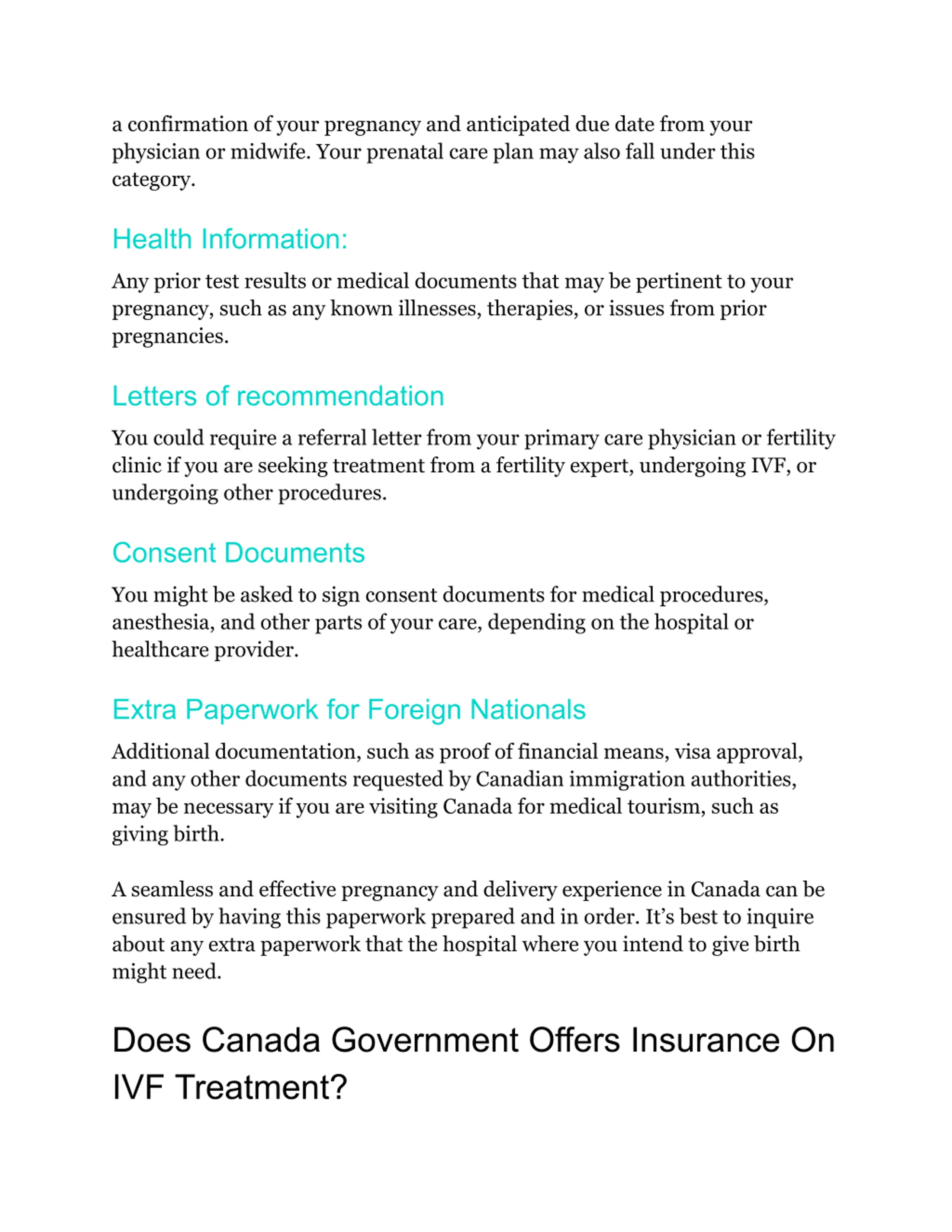 a confirmation of your pregnancy and anticipated due date from your physician or midwife. Your prenatal care plan may also fall under this category. Health Information: Any prior test results or medical documents that may be pertinent to your pregnancy, such as any known illnesses, therapies, or issues from prior pregnancies. Letters of recommendation You could require a referral letter from your primary care physician or fertility clinic if you are seeking treatment from a fertility expert, undergoing IVF, or undergoing other procedures. Consent Documents You might be asked to sign consent documents for medical procedures, anesthesia, and other parts of your care, depending on the hospital or healthcare provider. Extra Paperwork for Foreign Nationals Additional documentation, such as proof of financial means, visa approval, and any other documents requested by Canadian immigration authorities, may be necessary if you are visiting Canada for medical tourism, such as giving birth. A seamless and effective pregnancy and delivery experience in Canada can be ensured by having this paperwork prepared and in order. It s best to inquire about any extra paperwork that the hospital where you intend to give birth might need. Does Canada Government Offers Insurance On IVF Treatment?