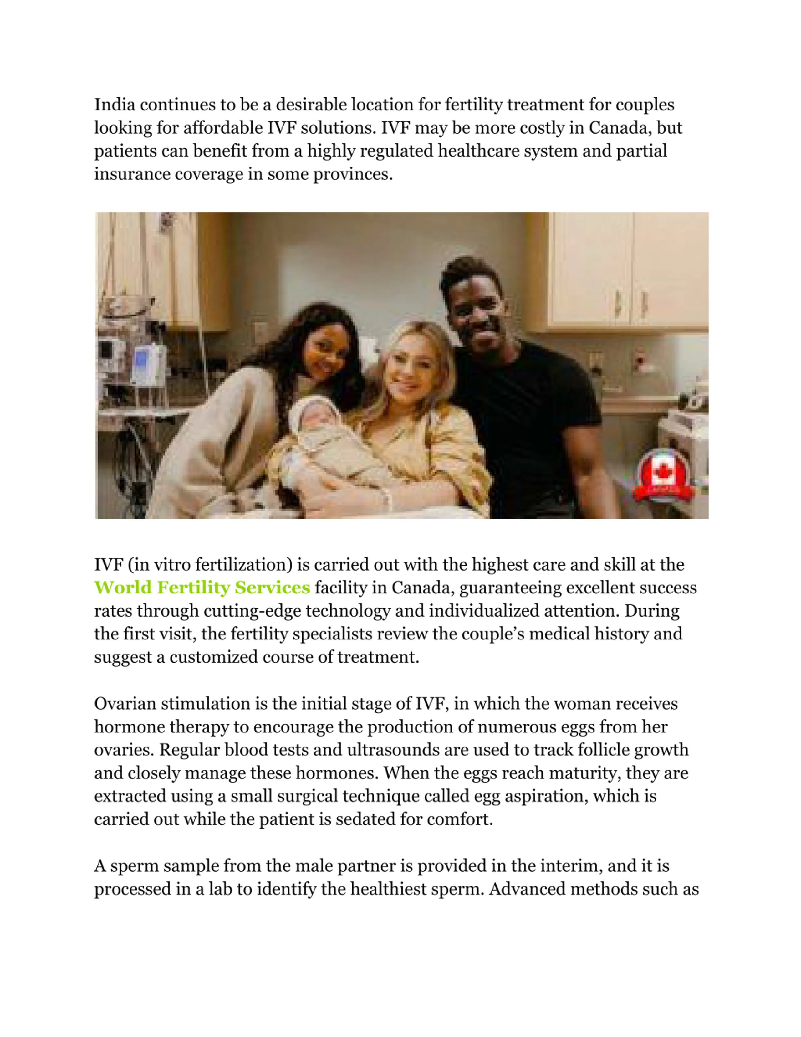 India continues to be a desirable location for fertility treatment for couples looking for affordable IVF solutions. IVF may be more costly in Canada, but patients can benefit from a highly regulated healthcare system and partial insurance coverage in some provinces. IVF (in vitro fertilization) is carried out with the highest care and skill at the World Fertility Services facility in Canada, guaranteeing excellent success rates through cutting-edge technology and individualized attention. During the first visit, the fertility specialists review the couple s medical history and suggest a customized course of treatment. Ovarian stimulation is the initial stage of IVF, in which the woman receives hormone therapy to encourage the production of numerous eggs from her ovaries. Regular blood tests and ultrasounds are used to track follicle growth and closely manage these hormones. When the eggs reach maturity, they are extracted using a small surgical technique called egg aspiration, which is carried out while the patient is sedated for comfort. A sperm sample from the male partner is provided in the interim, and it is processed in a lab to identify the healthiest sperm. Advanced methods such as