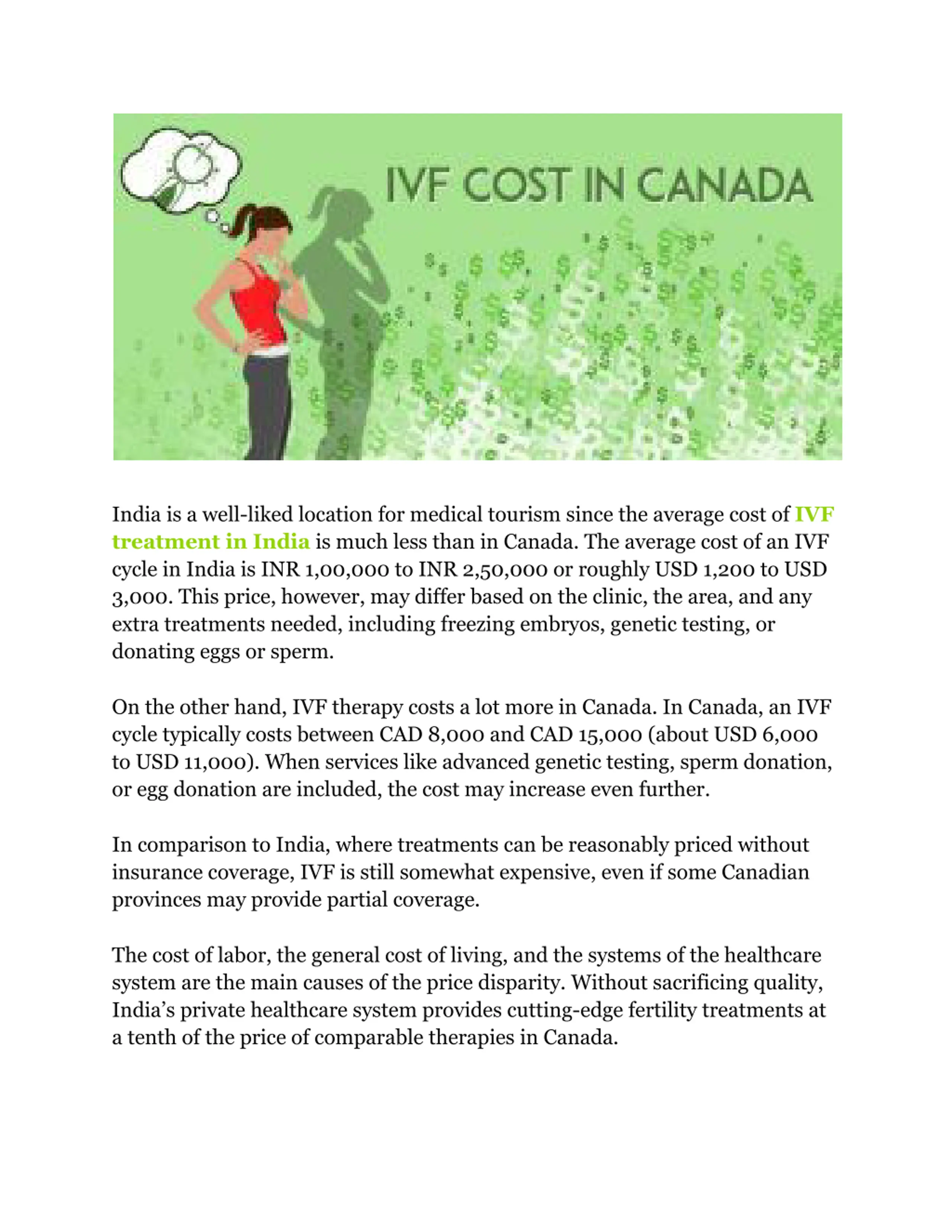 individualized care, guaranteeing that foreign couples receive the same caliber of care and knowledge as local patients. Depending on the patient s age and health, many prestigious facilities in India tout success rates of 40% to 60% per cycle, which is comparable to international norms for IVF therapy. The success of IVF procedures is also influenced by the availability of highly skilled fertility specialists and the application of state-of-the-art technologies. IVF therapy is becoming more widely available as India s healthcare system develops, and the nation s fertility clinics continue to be a well-liked option for those looking for successful, reasonably priced, and high-quality reproductive care. Canadian IVF therapy is renowned for its cutting-edge technology, high standards of care, and emphasis on patient-centered care. Modern fertility therapies, ethical procedures, and all-encompassing care during the IVF process are hallmarks of Canadian IVF clinics. The success of therapy is increased by the fact that many clinics have highly qualified fertility doctors on staff and are connected to prestigious medical institutes. With explicit laws governing genetic testing, surrogacy, and the donation of eggs and sperm, Canada is renowned for its open and encouraging attitude to IVF. All contribution processes are handled properly, and donor identity is guaranteed by law. Based on variables like the patient s age, health, and the clinic s experience, IVF success rates in Canada range from 35% to 45%, which is an amazing rate. Let s start the conversation in the furthermore headings or paragraphs to deliver information to enhance knowledge in the medical industry. What Is The Average Cost Of IVF Treatment In India Compared To Canada?