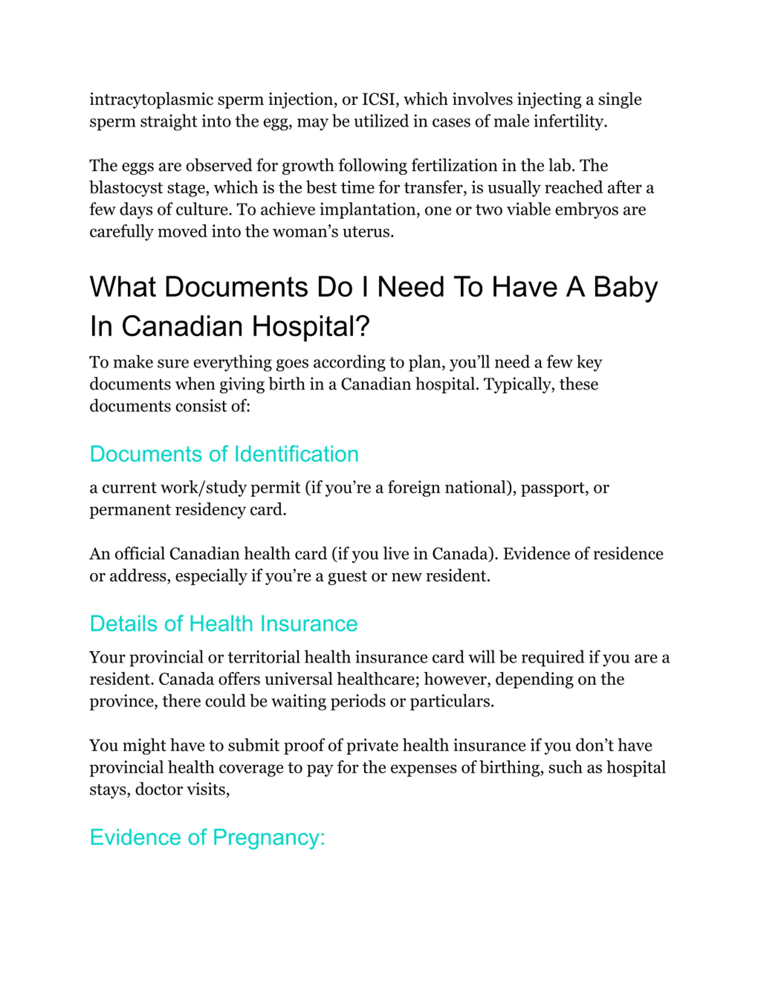 intracytoplasmic sperm injection, or ICSI, which involves injecting a single sperm straight into the egg, may be utilized in cases of male infertility. The eggs are observed for growth following fertilization in the lab. The blastocyst stage, which is the best time for transfer, is usually reached after a few days of culture. To achieve implantation, one or two viable embryos are carefully moved into the woman s uterus. What Documents Do I Need To Have A Baby In Canadian Hospital? To make sure everything goes according to plan, you ll need a few key documents when giving birth in a Canadian hospital. Typically, these documents consist of: Documents of Identification a current work/study permit (if you re a foreign national), passport, or permanent residency card. An official Canadian health card (if you live in Canada). Evidence of residence or address, especially if you re a guest or new resident. Details of Health Insurance Your provincial or territorial health insurance card will be required if you are a resident. Canada offers universal healthcare; however, depending on the province, there could be waiting periods or particulars. You might have to submit proof of private health insurance if you don t have provincial health coverage to pay for the expenses of birthing, such as hospital stays, doctor visits, Evidence of Pregnancy:
