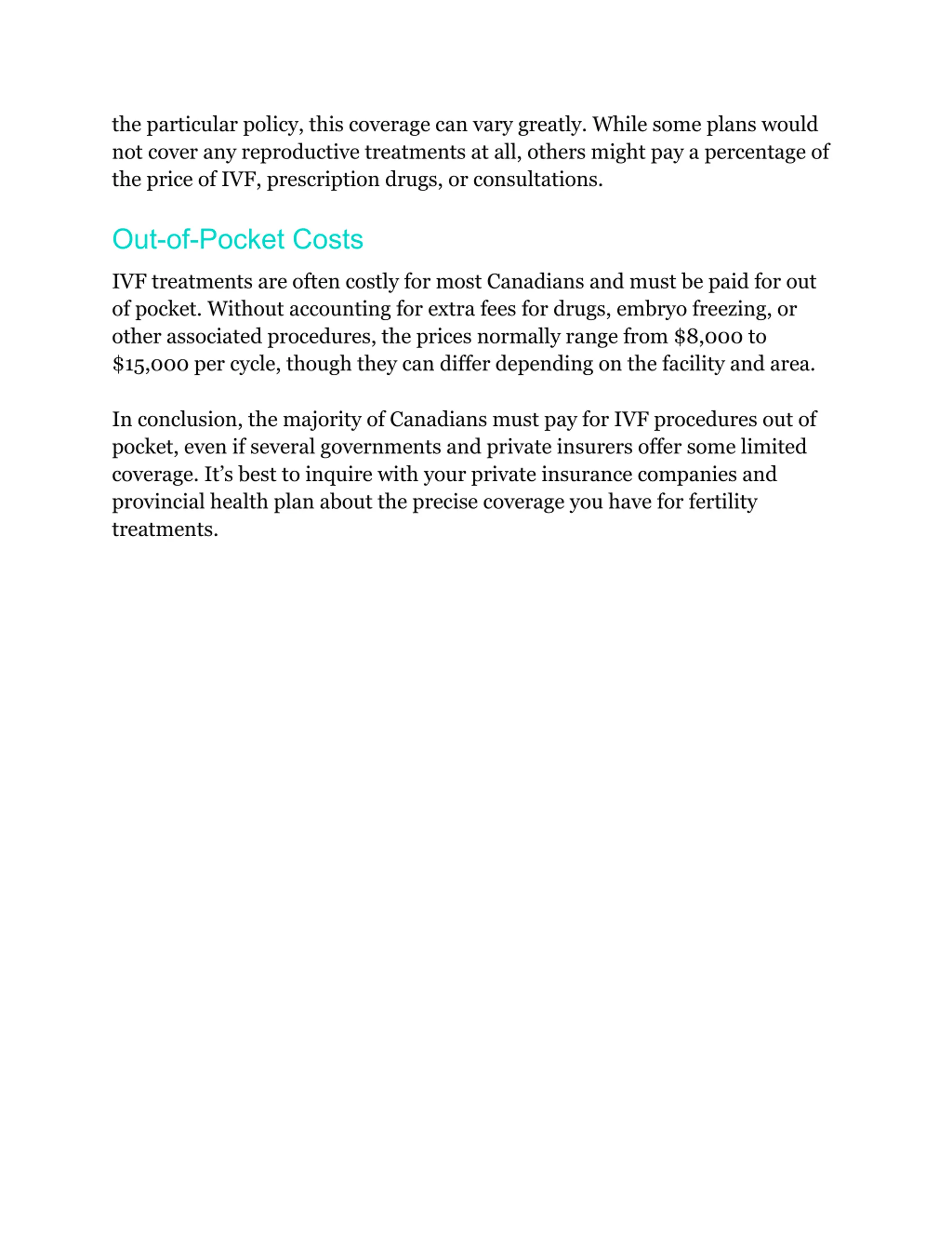 the particular policy, this coverage can vary greatly. While some plans would not cover any reproductive treatments at all, others might pay a percentage of the price of IVF, prescription drugs, or consultations. Out-of-Pocket Costs IVF treatments are often costly for most Canadians and must be paid for out of pocket. Without accounting for extra fees for drugs, embryo freezing, or other associated procedures, the prices normally range from $8,000 to $15,000 per cycle, though they can differ depending on the facility and area. In conclusion, the majority of Canadians must pay for IVF procedures out of pocket, even if several governments and private insurers offer some limited coverage. It s best to inquire with your private insurance companies and provincial health plan about the precise coverage you have for fertility treatments.