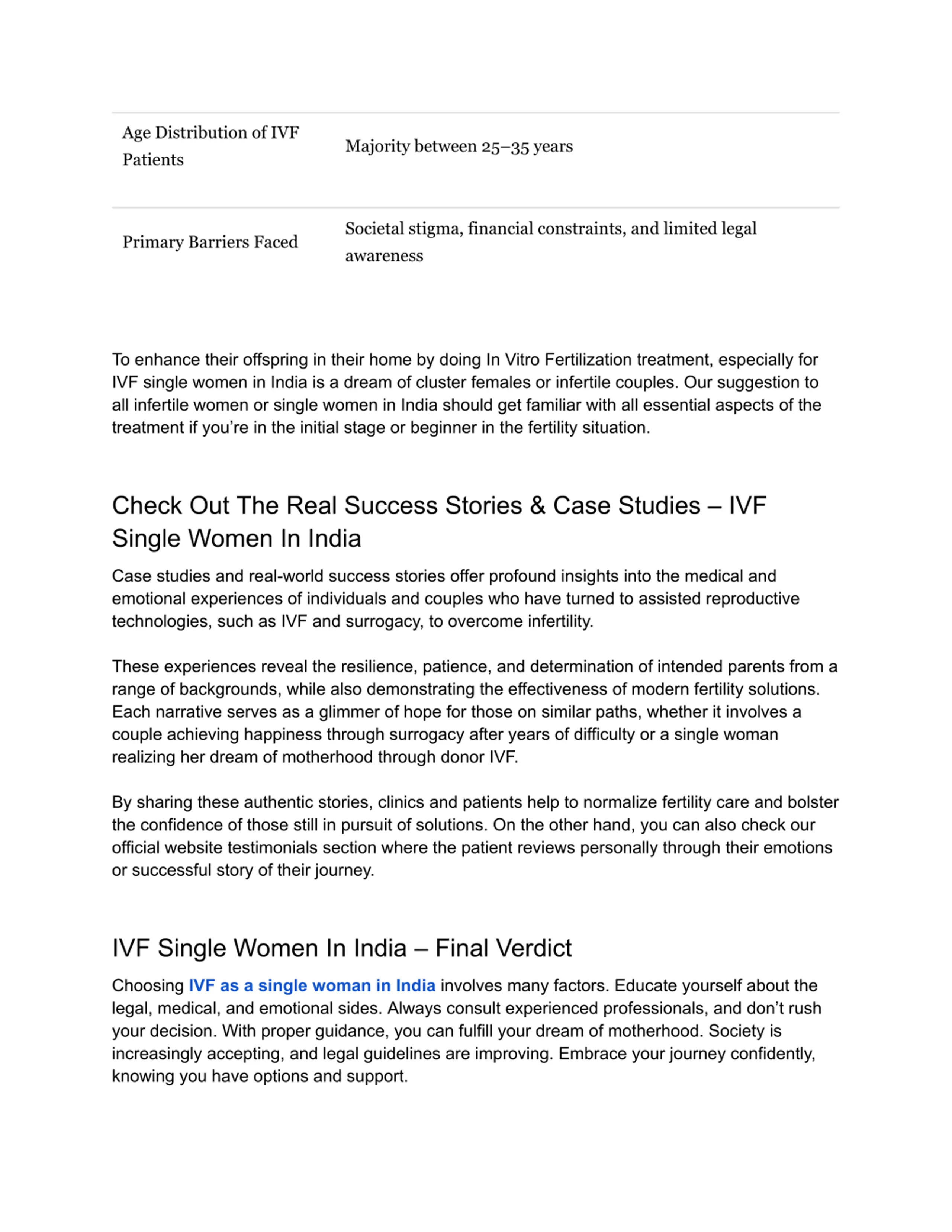 Age Distribution of IVF Patients Majority between 25 35 years Societal stigma, financial constraints, and limited legal awareness Primary Barriers Faced To enhance their offspring in their home by doing In Vitro Fertilization treatment, especially for IVF single women in India is a dream of cluster females or infertile couples. Our suggestion to all infertile women or single women in India should get familiar with all essential aspects of the treatment if you re in the initial stage or beginner in the fertility situation. Check Out The Real Success Stories & Case Studies IVF Single Women In India Case studies and real-world success stories offer profound insights into the medical and emotional experiences of individuals and couples who have turned to assisted reproductive technologies, such as IVF and surrogacy, to overcome infertility. These experiences reveal the resilience, patience, and determination of intended parents from a range of backgrounds, while also demonstrating the effectiveness of modern fertility solutions. Each narrative serves as a glimmer of hope for those on similar paths, whether it involves a couple achieving happiness through surrogacy after years of difficulty or a single woman realizing her dream of motherhood through donor IVF. By sharing these authentic stories, clinics and patients help to normalize fertility care and bolster the confidence of those still in pursuit of solutions. On the other hand, you can also check our official website testimonials section where the patient reviews personally through their emotions or successful story of their journey. IVF Single Women In India Final Verdict ChoosingIVF as a single woman in India involves many factors. Educate yourself about the legal, medical, and emotional sides. Always consult experienced professionals, and don t rush your decision. With proper guidance, you can fulfill your dream of motherhood. Society is increasingly accepting, and legal guidelines are improving. Embrace your journey confidently, knowing you have options and support.