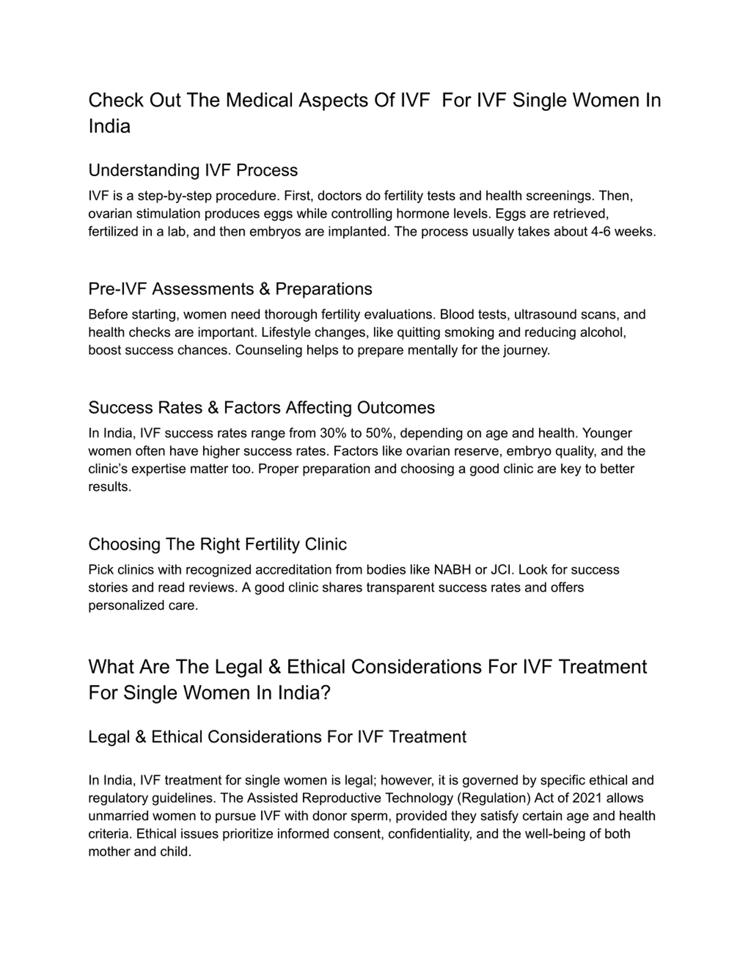 Check Out The Medical Aspects Of IVF For IVF Single Women In India Understanding IVF Process IVF is a step-by-step procedure. First, doctors do fertility tests and health screenings. Then, ovarian stimulation produces eggs while controlling hormone levels. Eggs are retrieved, fertilized in a lab, and then embryos are implanted. The process usually takes about 4-6 weeks. Pre-IVF Assessments & Preparations Before starting, women need thorough fertility evaluations. Blood tests, ultrasound scans, and health checks are important. Lifestyle changes, like quitting smoking and reducing alcohol, boost success chances. Counseling helps to prepare mentally for the journey. Success Rates & Factors Affecting Outcomes In India, IVF success rates range from 30% to 50%, depending on age and health. Younger women often have higher success rates. Factors like ovarian reserve, embryo quality, and the clinic s expertise matter too. Proper preparation and choosing a good clinic are key to better results. Choosing The Right Fertility Clinic Pick clinics with recognized accreditation from bodies like NABH or JCI. Look for success stories and read reviews. A good clinic shares transparent success rates and offers personalized care. What Are The Legal & Ethical Considerations For IVF Treatment For Single Women In India? Legal & Ethical Considerations For IVF Treatment In India, IVF treatment for single women is legal; however, it is governed by specific ethical and regulatory guidelines. The Assisted Reproductive Technology (Regulation) Act of 2021 allows unmarried women to pursue IVF with donor sperm, provided they satisfy certain age and health criteria. Ethical issues prioritize informed consent, confidentiality, and the well-being of both mother and child.