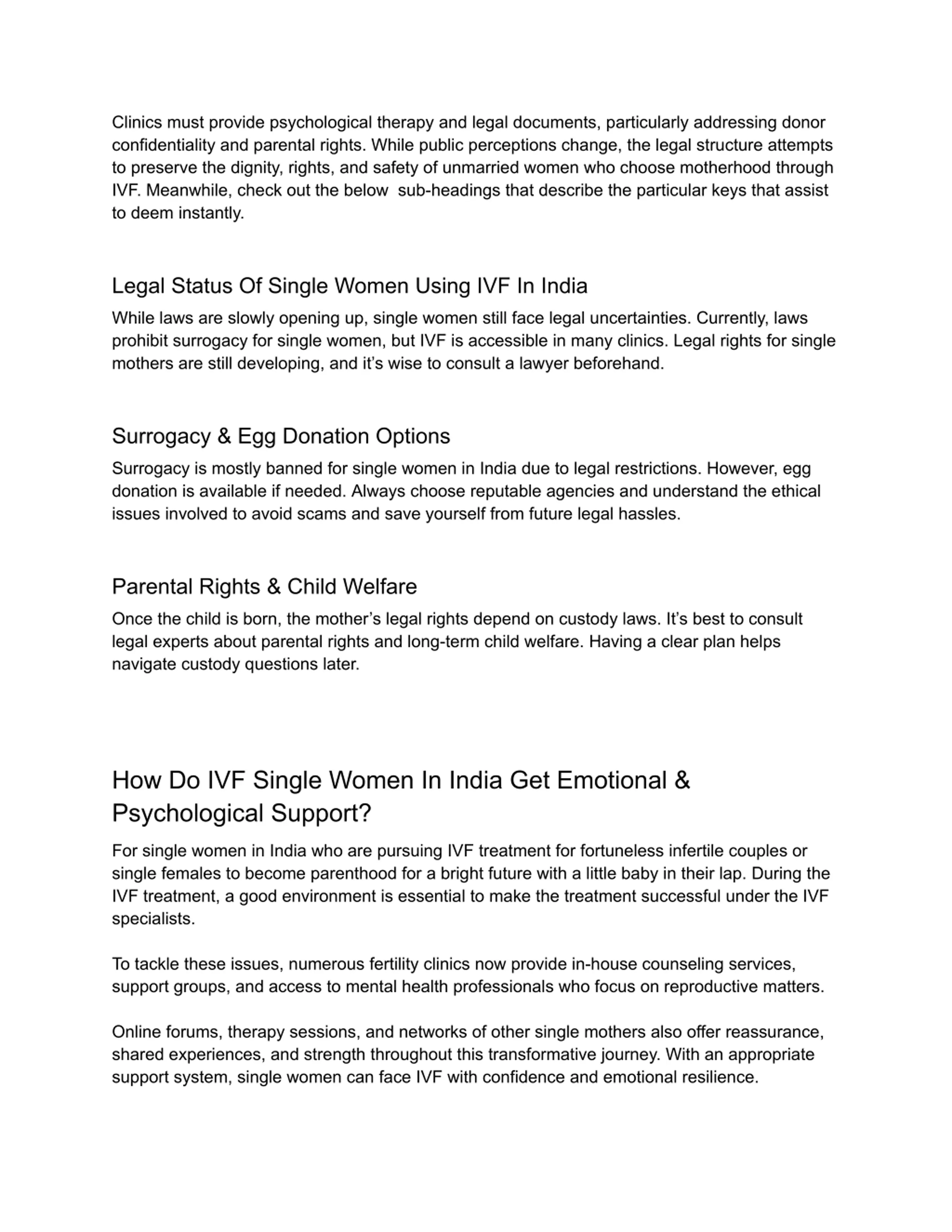 Clinics must provide psychological therapy and legal documents, particularly addressing donor confidentiality and parental rights. While public perceptions change, the legal structure attempts to preserve the dignity, rights, and safety of unmarried women who choose motherhood through IVF. Meanwhile, check out the below sub-headings that describe the particular keys that assist to deem instantly. Legal Status Of Single Women Using IVF In India While laws are slowly opening up, single women still face legal uncertainties. Currently, laws prohibit surrogacy for single women, but IVF is accessible in many clinics. Legal rights for single mothers are still developing, and it s wise to consult a lawyer beforehand. Surrogacy & Egg Donation Options Surrogacy is mostly banned for single women in India due to legal restrictions. However, egg donation is available if needed. Always choose reputable agencies and understand the ethical issues involved to avoid scams and save yourself from future legal hassles. Parental Rights & Child Welfare Once the child is born, the mother s legal rights depend on custody laws. It s best to consult legal experts about parental rights and long-term child welfare. Having a clear plan helps navigate custody questions later. How Do IVF Single Women In India Get Emotional & Psychological Support? For single women in India who are pursuing IVF treatment for fortuneless infertile couples or single females to become parenthood for a bright future with a little baby in their lap. During the IVF treatment, a good environment is essential to make the treatment successful under the IVF specialists. To tackle these issues, numerous fertility clinics now provide in-house counseling services, support groups, and access to mental health professionals who focus on reproductive matters. Online forums, therapy sessions, and networks of other single mothers also offer reassurance, shared experiences, and strength throughout this transformative journey. With an appropriate support system, single women can face IVF with confidence and emotional resilience.