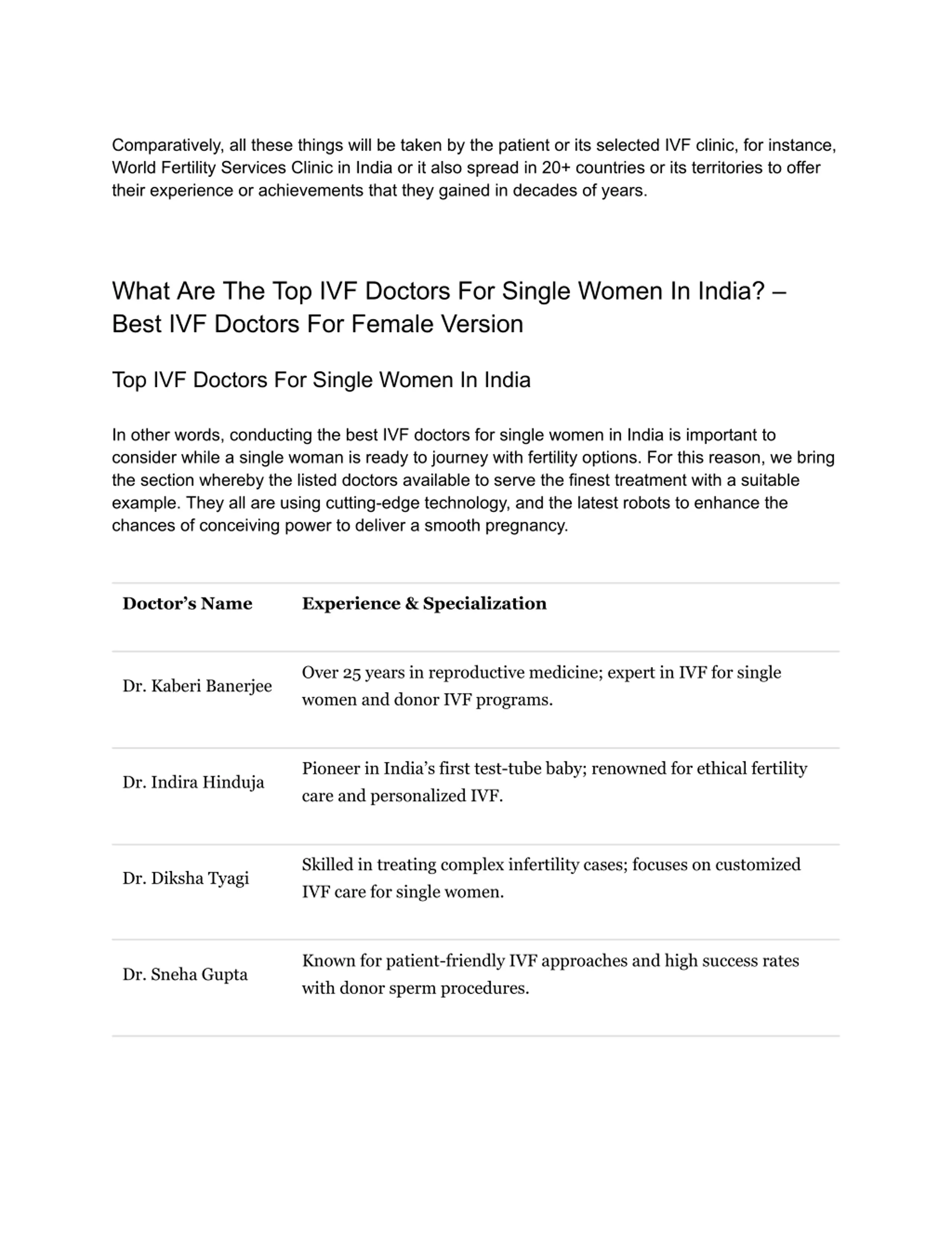 Comparatively, all these things will be taken by the patient or its selected IVF clinic, for instance, World Fertility Services Clinic in India or it also spread in 20+ countries or its territories to offer their experience or achievements that they gained in decades of years. What Are The Top IVF Doctors For Single Women In India? Best IVF Doctors For Female Version Top IVF Doctors For Single Women In India In other words, conducting the best IVF doctors for single women in India is important to consider while a single woman is ready to journey with fertility options. For this reason, we bring the section whereby the listed doctors available to serve the finest treatment with a suitable example. They all are using cutting-edge technology, and the latest robots to enhance the chances of conceiving power to deliver a smooth pregnancy. Doctor s Name Experience & Specialization Over 25 years in reproductive medicine; expert in IVF for single women and donor IVF programs. Dr. Kaberi Banerjee Pioneer in India s first test-tube baby; renowned for ethical fertility care and personalized IVF. Dr. Indira Hinduja Skilled in treating complex infertility cases; focuses on customized IVF care for single women. Dr. Diksha Tyagi Known for patient-friendly IVF approaches and high success rates with donor sperm procedures. Dr. Sneha Gupta