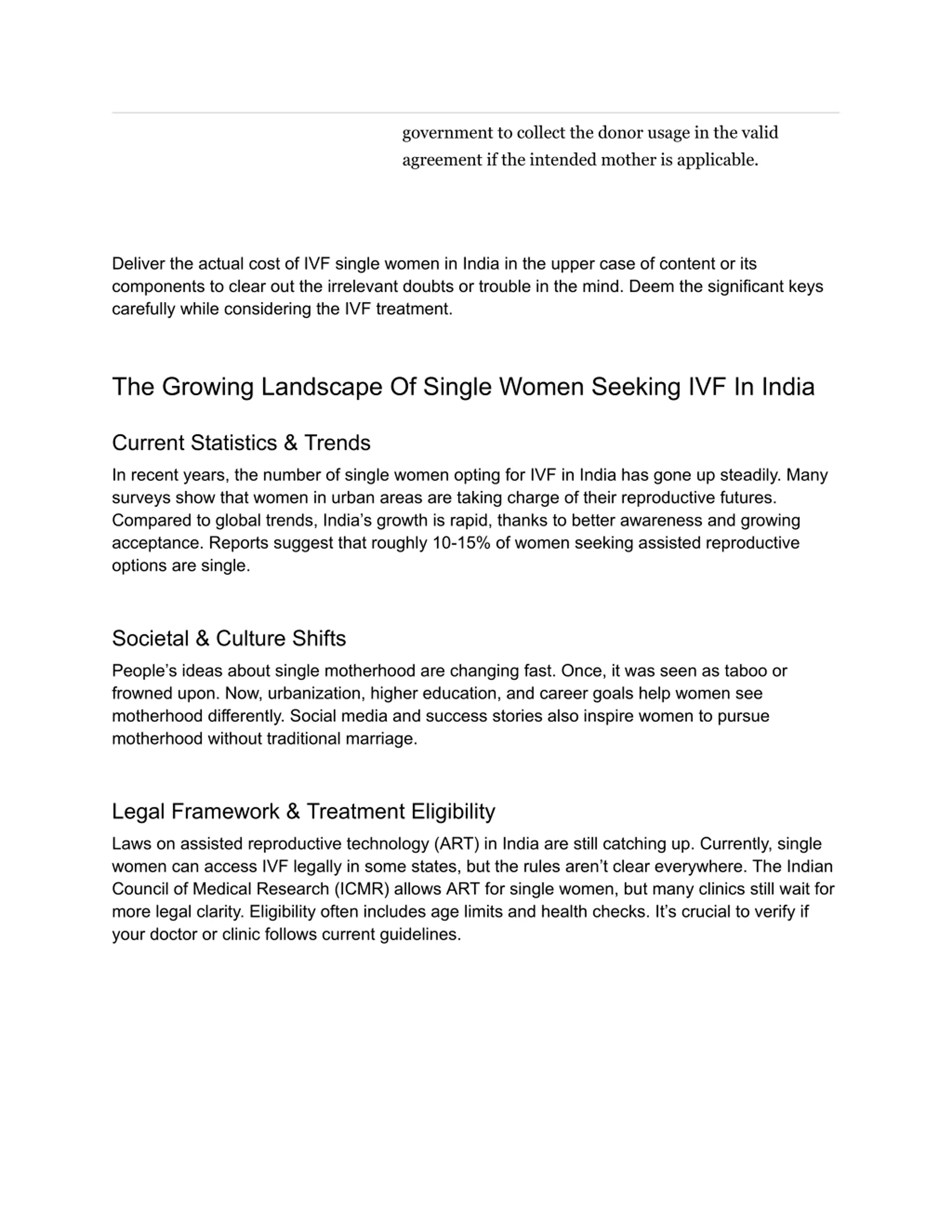 government to collect the donor usage in the valid agreement if the intended mother is applicable. Deliver the actual cost of IVF single women in India in the upper case of content or its components to clear out the irrelevant doubts or trouble in the mind. Deem the significant keys carefully while considering the IVF treatment. The Growing Landscape Of Single Women Seeking IVF In India Current Statistics & Trends In recent years, the number of single women opting for IVF in India has gone up steadily. Many surveys show that women in urban areas are taking charge of their reproductive futures. Compared to global trends, India s growth is rapid, thanks to better awareness and growing acceptance. Reports suggest that roughly 10-15% of women seeking assisted reproductive options are single. Societal & Culture Shifts People s ideas about single motherhood are changing fast. Once, it was seen as taboo or frowned upon. Now, urbanization, higher education, and career goals help women see motherhood differently. Social media and success stories also inspire women to pursue motherhood without traditional marriage. Legal Framework & Treatment Eligibility Laws on assisted reproductive technology (ART) in India are still catching up. Currently, single women can access IVF legally in some states, but the rules aren t clear everywhere. The Indian Council of Medical Research (ICMR) allows ART for single women, but many clinics still wait for more legal clarity. Eligibility often includes age limits and health checks. It s crucial to verify if your doctor or clinic follows current guidelines.