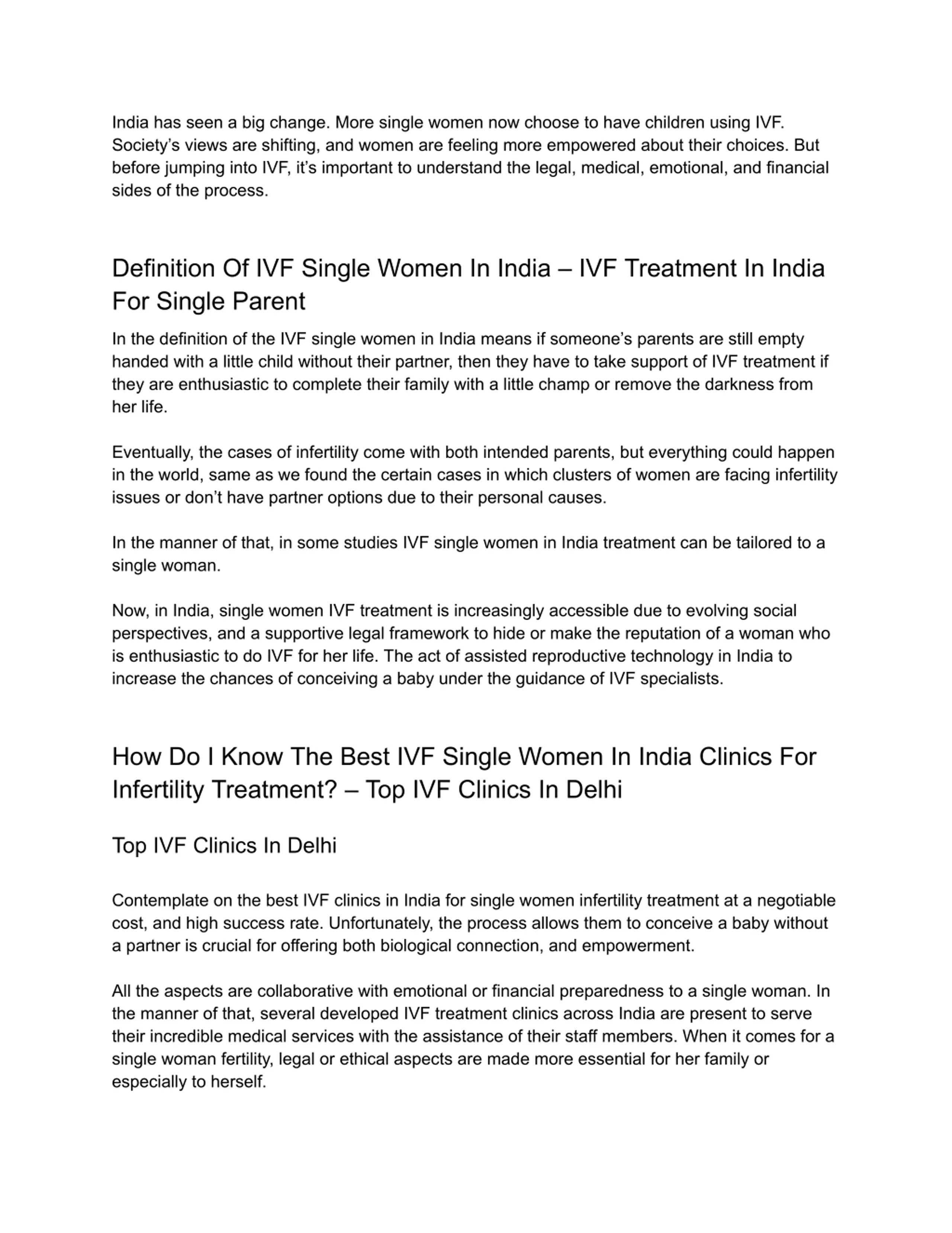 India has seen a big change. More single women now choose to have children using IVF. Society s views are shifting, and women are feeling more empowered about their choices. But before jumping into IVF, it s important to understand the legal, medical, emotional, and financial sides of the process. Definition Of IVF Single Women In India IVF Treatment In India For Single Parent In the definition of the IVF single women in India means if someone s parents are still empty handed with a little child without their partner, then they have to take support of IVF treatment if they are enthusiastic to complete their family with a little champ or remove the darkness from her life. Eventually, the cases of infertility come with both intended parents, but everything could happen in the world, same as we found the certain cases in which clusters of women are facing infertility issues or don t have partner options due to their personal causes. In the manner of that, in some studies IVF single women in India treatment can be tailored to a single woman. Now, in India, single women IVF treatment is increasingly accessible due to evolving social perspectives, and a supportive legal framework to hide or make the reputation of a woman who is enthusiastic to do IVF for her life. The act of assisted reproductive technology in India to increase the chances of conceiving a baby under the guidance of IVF specialists. How Do I Know The Best IVF Single Women In India Clinics For Infertility Treatment? Top IVF Clinics In Delhi Top IVF Clinics In Delhi Contemplate on the best IVF clinics in India for single women infertility treatment at a negotiable cost, and high success rate. Unfortunately, the process allows them to conceive a baby without a partner is crucial for offering both biological connection, and empowerment. All the aspects are collaborative with emotional or financial preparedness to a single woman. In the manner of that, several developed IVF treatment clinics across India are present to serve their incredible medical services with the assistance of their staff members. When it comes for a single woman fertility, legal or ethical aspects are made more essential for her family or especially to herself.