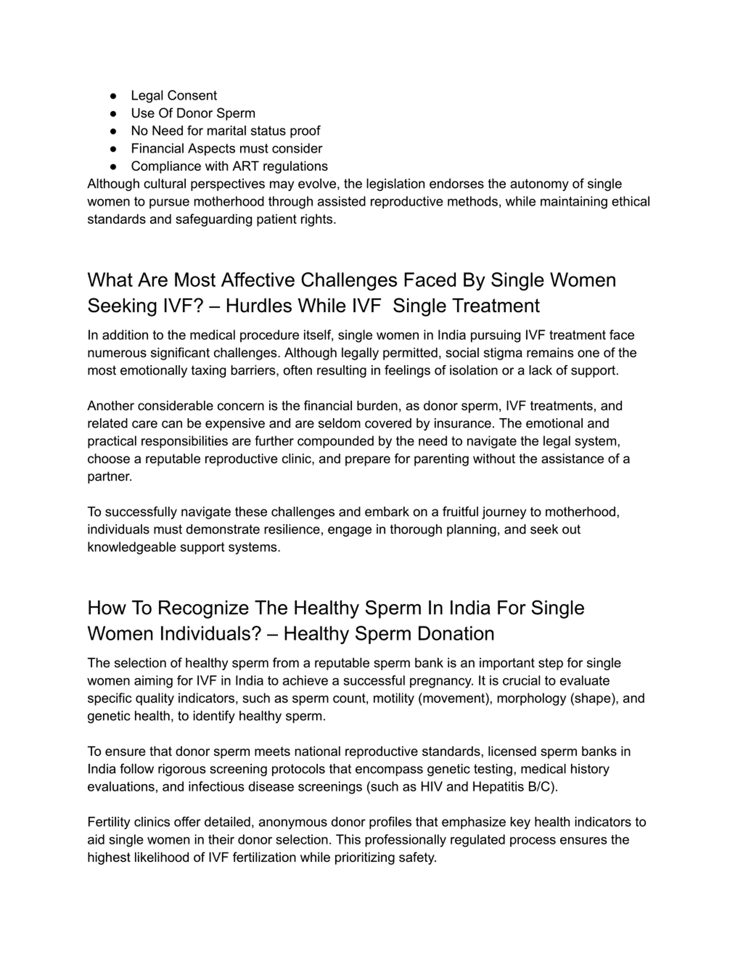 Legal Consent Use Of Donor Sperm No Need for marital status proof Financial Aspects must consider Compliance with ART regulations Although cultural perspectives may evolve, the legislation endorses the autonomy of single women to pursue motherhood through assisted reproductive methods, while maintaining ethical standards and safeguarding patient rights. What Are Most Affective Challenges Faced By Single Women Seeking IVF? Hurdles While IVF Single Treatment In addition to the medical procedure itself, single women in India pursuing IVF treatment face numerous significant challenges. Although legally permitted, social stigma remains one of the most emotionally taxing barriers, often resulting in feelings of isolation or a lack of support. Another considerable concern is the financial burden, as donor sperm, IVF treatments, and related care can be expensive and are seldom covered by insurance. The emotional and practical responsibilities are further compounded by the need to navigate the legal system, choose a reputable reproductive clinic, and prepare for parenting without the assistance of a partner. To successfully navigate these challenges and embark on a fruitful journey to motherhood, individuals must demonstrate resilience, engage in thorough planning, and seek out knowledgeable support systems. How To Recognize The Healthy Sperm In India For Single Women Individuals? Healthy Sperm Donation The selection of healthy sperm from a reputable sperm bank is an important step for single women aiming for IVF in India to achieve a successful pregnancy. It is crucial to evaluate specific quality indicators, such as sperm count, motility (movement), morphology (shape), and genetic health, to identify healthy sperm. To ensure that donor sperm meets national reproductive standards, licensed sperm banks in India follow rigorous screening protocols that encompass genetic testing, medical history evaluations, and infectious disease screenings (such as HIV and Hepatitis B/C). Fertility clinics offer detailed, anonymous donor profiles that emphasize key health indicators to aid single women in their donor selection. This professionally regulated process ensures the highest likelihood of IVF fertilization while prioritizing safety.