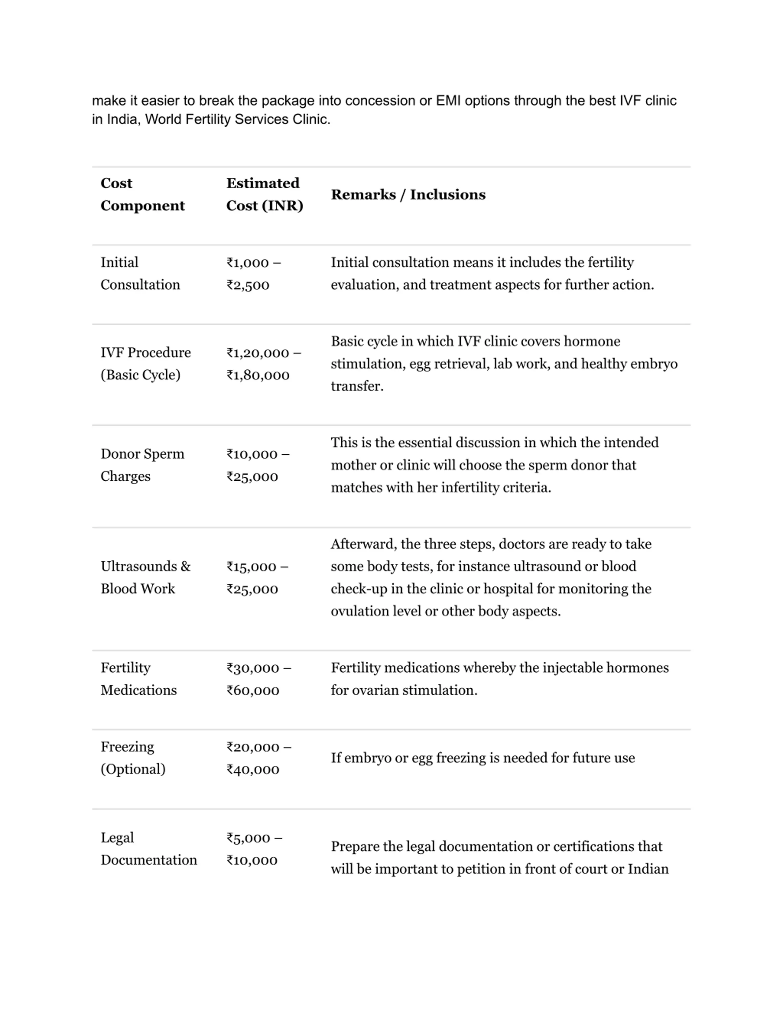 make it easier to break the package into concession or EMI options through the best IVF clinic in India, World Fertility Services Clinic. Cost Component Estimated Cost (INR) Remarks / Inclusions Initial Consultation 1,000 2,500 Initial consultation means it includes the fertility evaluation, and treatment aspects for further action. Basic cycle in which IVF clinic covers hormone stimulation, egg retrieval, lab work, and healthy embryo transfer. IVF Procedure (Basic Cycle) 1,20,000 1,80,000 This is the essential discussion in which the intended mother or clinic will choose the sperm donor that matches with her infertility criteria. Donor Sperm Charges 10,000 25,000 Afterward, the three steps, doctors are ready to take some body tests, for instance ultrasound or blood check-up in the clinic or hospital for monitoring the ovulation level or other body aspects. Ultrasounds & Blood Work 15,000 25,000 Fertility Medications 30,000 60,000 Fertility medications whereby the injectable hormones for ovarian stimulation. Freezing (Optional) 20,000 40,000 If embryo or egg freezing is needed for future use Legal Documentation 5,000 10,000 Prepare the legal documentation or certifications that will be important to petition in front of court or Indian