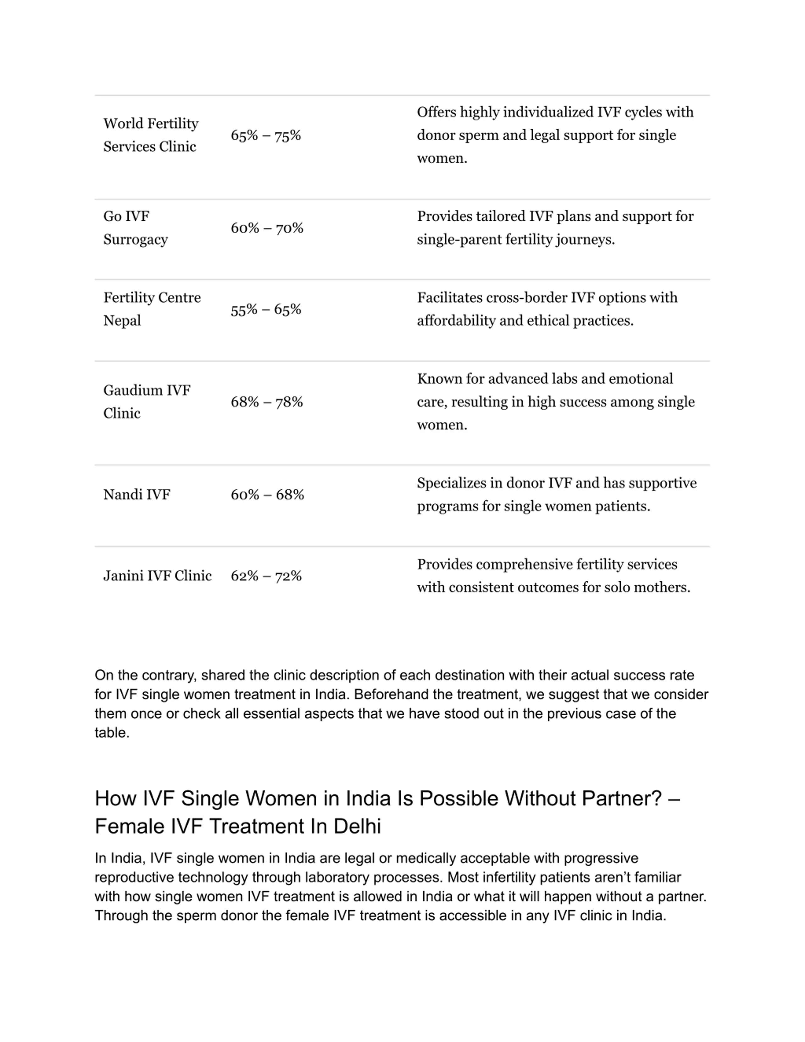 Offers highly individualized IVF cycles with donor sperm and legal support for single women. World Fertility Services Clinic 65% 75% Go IVF Surrogacy Provides tailored IVF plans and support for single-parent fertility journeys. 60% 70% Fertility Centre Nepal Facilitates cross-border IVF options with affordability and ethical practices. 55% 65% Known for advanced labs and emotional care, resulting in high success among single women. Gaudium IVF Clinic 68% 78% Specializes in donor IVF and has supportive programs for single women patients. Nandi IVF 60% 68% Provides comprehensive fertility services with consistent outcomes for solo mothers. Janini IVF Clinic 62% 72% On the contrary, shared the clinic description of each destination with their actual success rate for IVF single women treatment in India. Beforehand the treatment, we suggest that we consider them once or check all essential aspects that we have stood out in the previous case of the table. How IVF Single Women in India Is Possible Without Partner? Female IVF Treatment In Delhi In India, IVF single women in India are legal or medically acceptable with progressive reproductive technology through laboratory processes. Most infertility patients aren t familiar with how single women IVF treatment is allowed in India or what it will happen without a partner. Through the sperm donor the female IVF treatment is accessible in any IVF clinic in India.