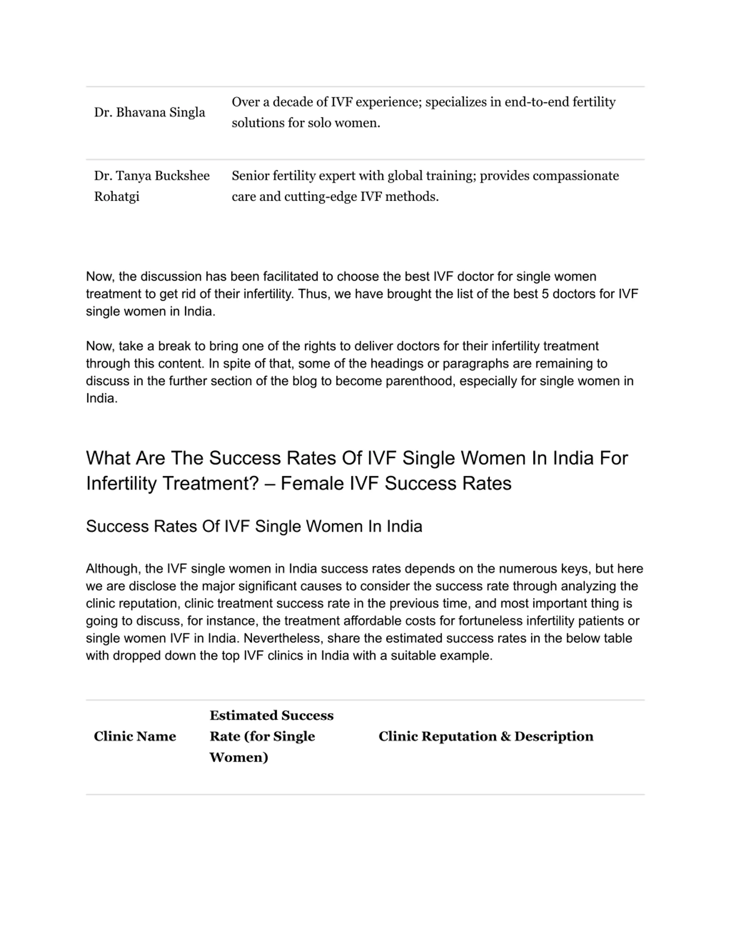 Over a decade of IVF experience; specializes in end-to-end fertility solutions for solo women. Dr. Bhavana Singla Dr. Tanya Buckshee Rohatgi Senior fertility expert with global training; provides compassionate care and cutting-edge IVF methods. Now, the discussion has been facilitated to choose the best IVF doctor for single women treatment to get rid of their infertility. Thus, we have brought the list of the best 5 doctors for IVF single women in India. Now, take a break to bring one of the rights to deliver doctors for their infertility treatment through this content. In spite of that, some of the headings or paragraphs are remaining to discuss in the further section of the blog to become parenthood, especially for single women in India. What Are The Success Rates Of IVF Single Women In India For Infertility Treatment? Female IVF Success Rates Success Rates Of IVF Single Women In India Although, the IVF single women in India success rates depends on the numerous keys, but here we are disclose the major significant causes to consider the success rate through analyzing the clinic reputation, clinic treatment success rate in the previous time, and most important thing is going to discuss, for instance, the treatment affordable costs for fortuneless infertility patients or single women IVF in India. Nevertheless, share the estimated success rates in the below table with dropped down the top IVF clinics in India with a suitable example. Estimated Success Rate (for Single Women) Clinic Name Clinic Reputation & Description