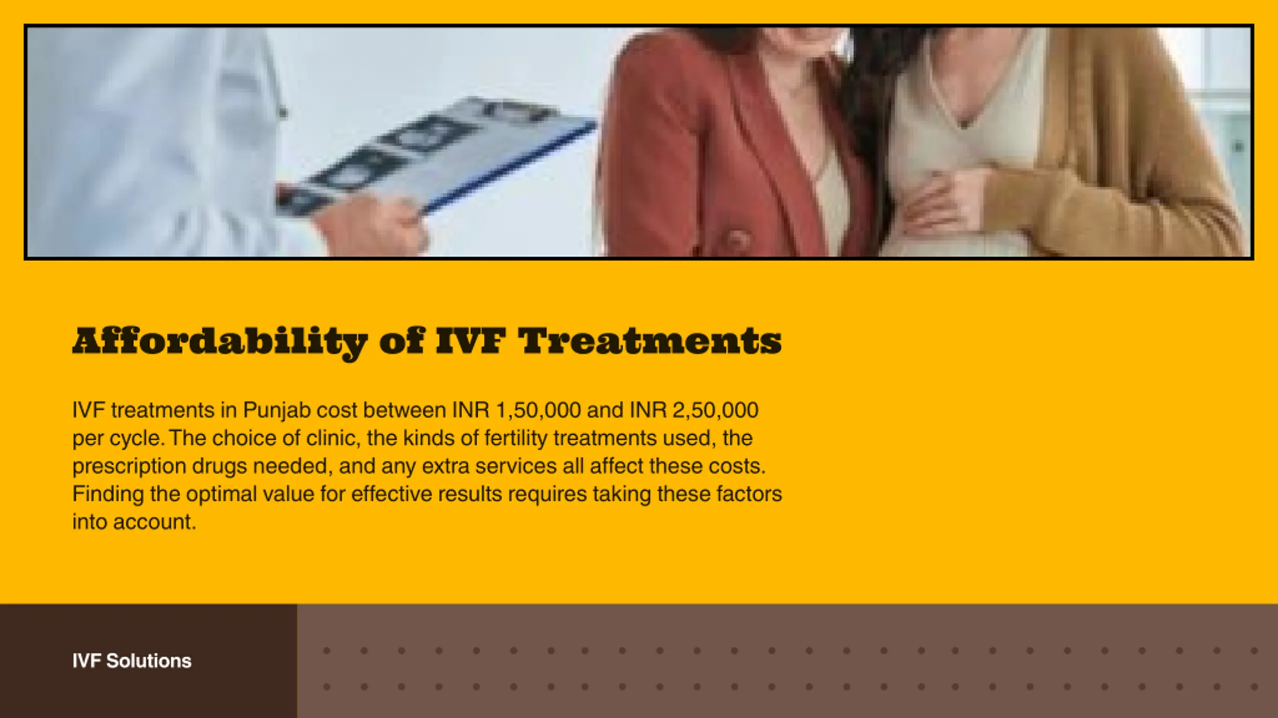Affordability of IVF Treatments IVF treatments in Punjab cost between INR 1,50,000 and INR 2,50,000 per cycle. The choice of clinic, the kinds of fertility treatments used, the prescription drugs needed, and any extra services all affect these costs. Finding the optimal value for effective results requires taking these factors into account. IVF Solutions