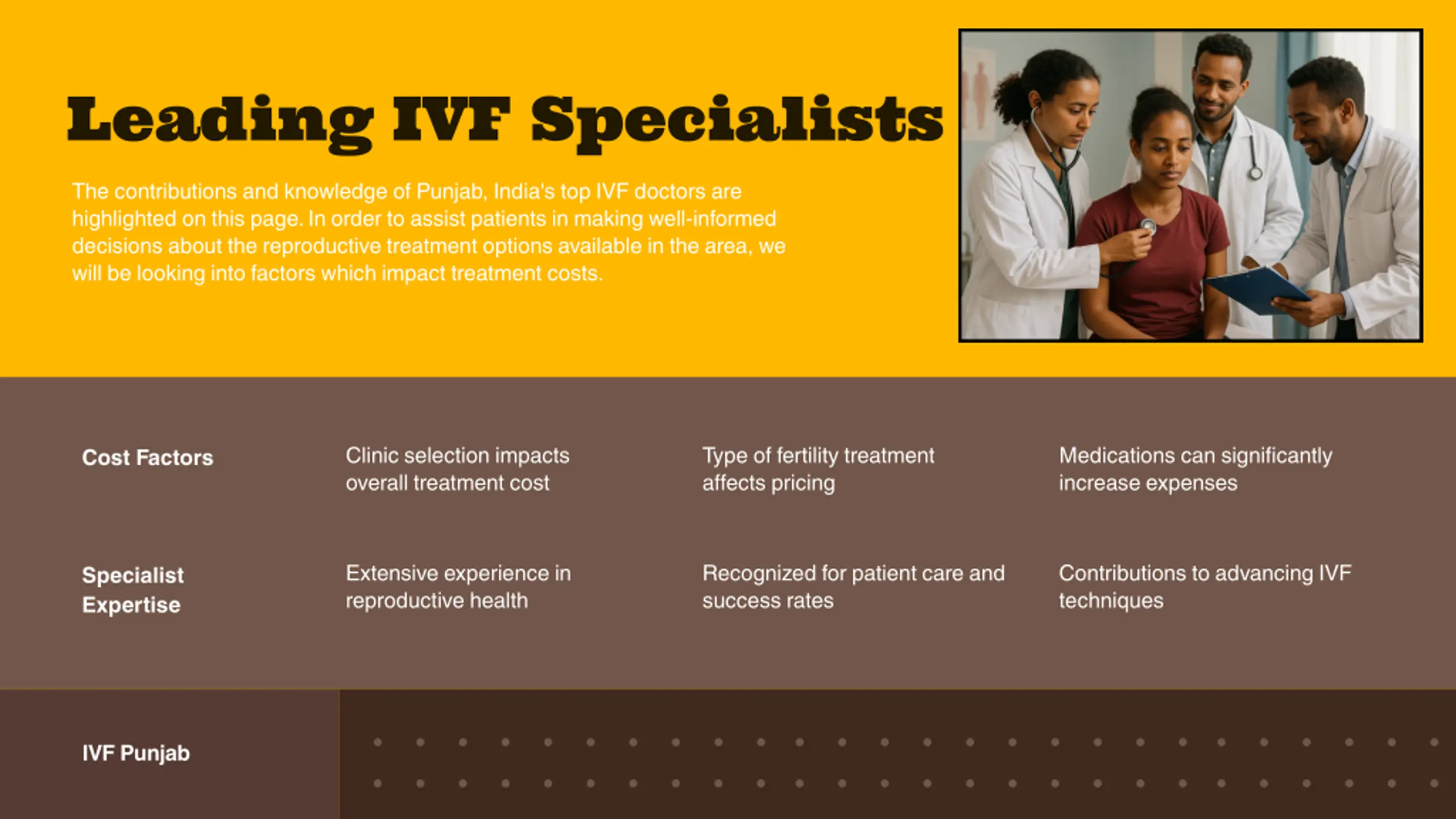 Leading IVF Specialists The contributions and knowledge of Punjab, India's top IVF doctors are highlighted on this page. In order to assist patients in making well-informed decisions about the reproductive treatment options available in the area, we will be looking into factors which impact treatment costs. Cost Factors Clinic selection impacts overall treatment cost Type of fertility treatment affects pricing Medications can significantly increase expenses Specialist Expertise Extensive experience in reproductive health Recognized for patient care and success rates Contributions to advancing IVF techniques IVF Punjab