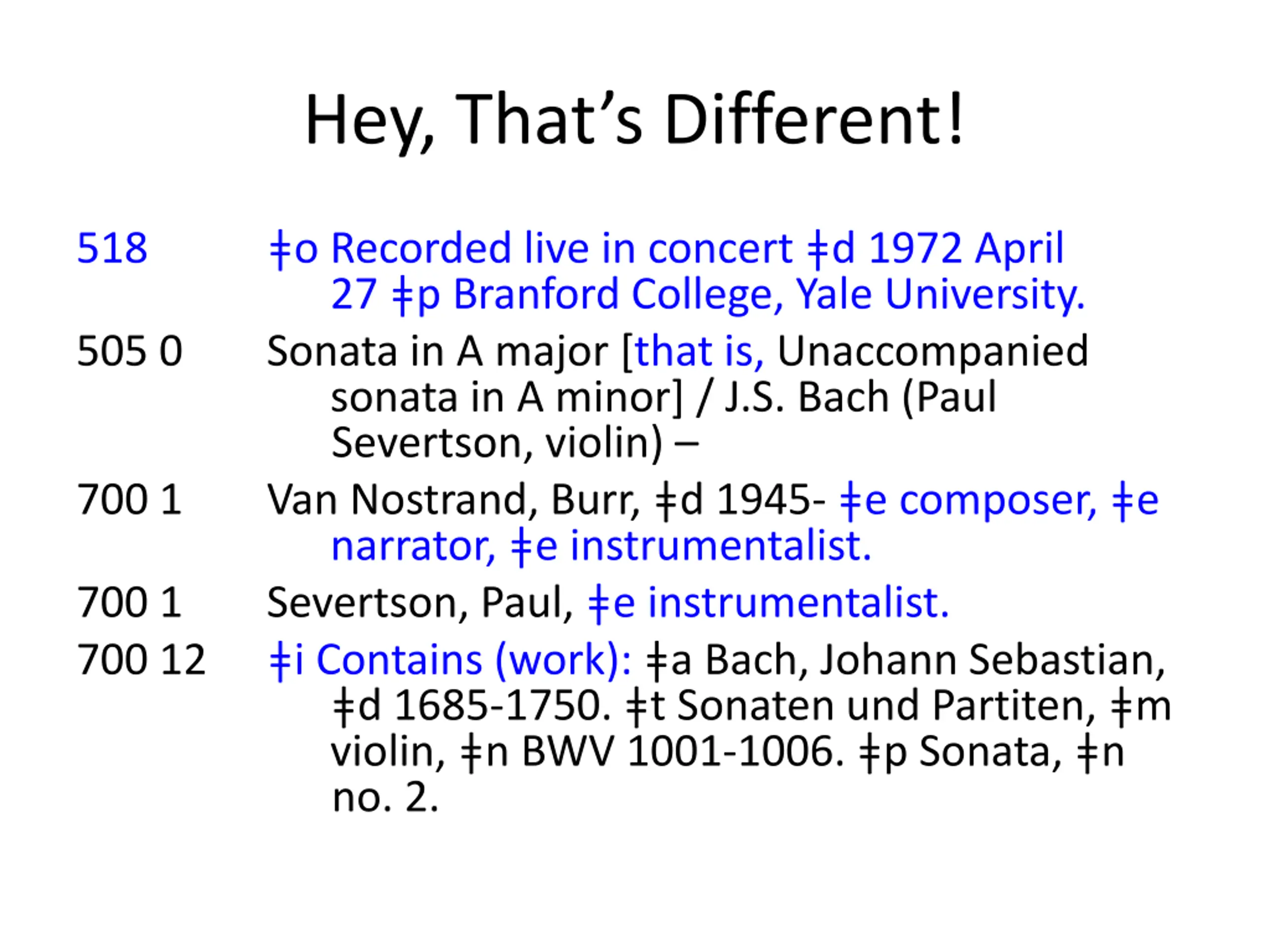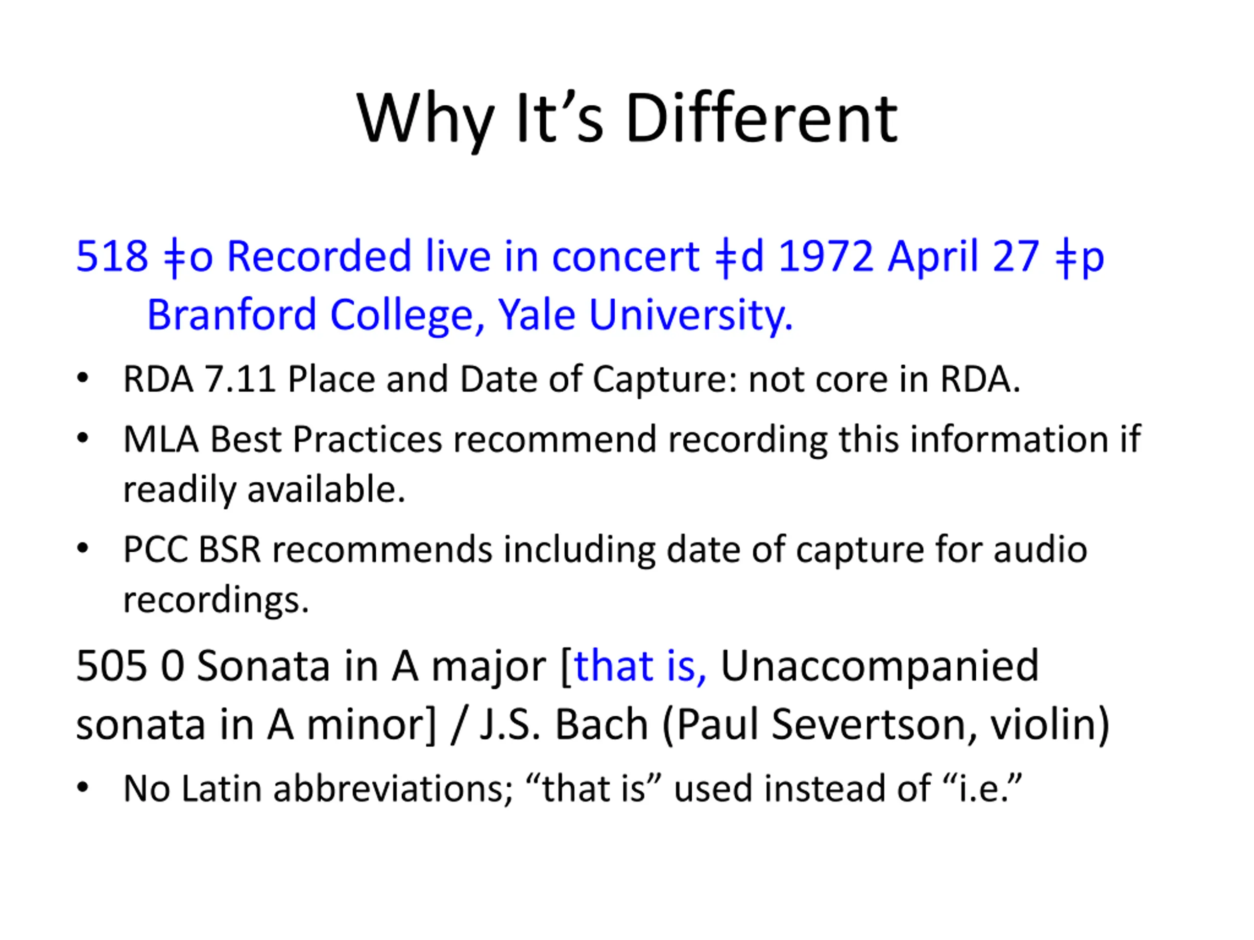 Why Its Different 518 o Recorded live in concert d 1972 April 27 p Branford College, Yale University. RDA 7.11 Place and Date of Capture: not core in RDA. MLA Best Practices recommend recording this information if readily available. PCC BSR recommends including date of capture for audio recordings. 505 0 Sonata in A major [that is, Unaccompanied sonata in A minor] / J.S. Bach (Paul Severtson, violin) No Latin abbreviations; that is used instead of i.e.