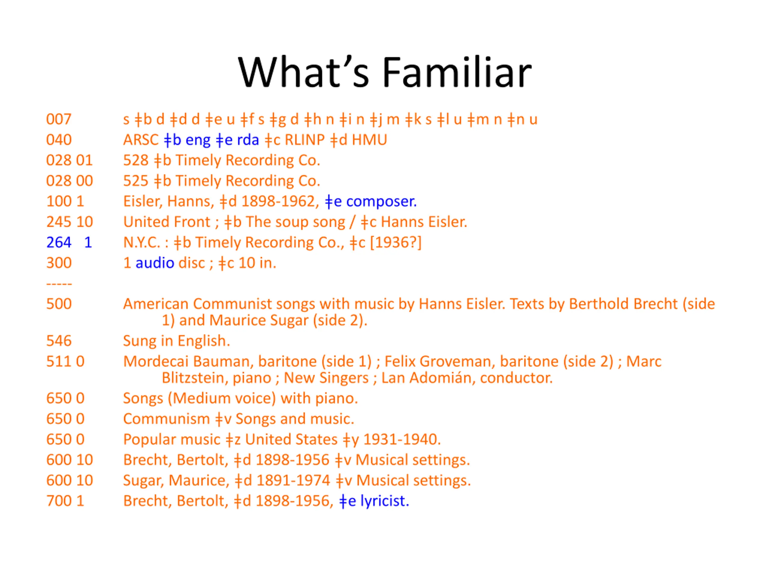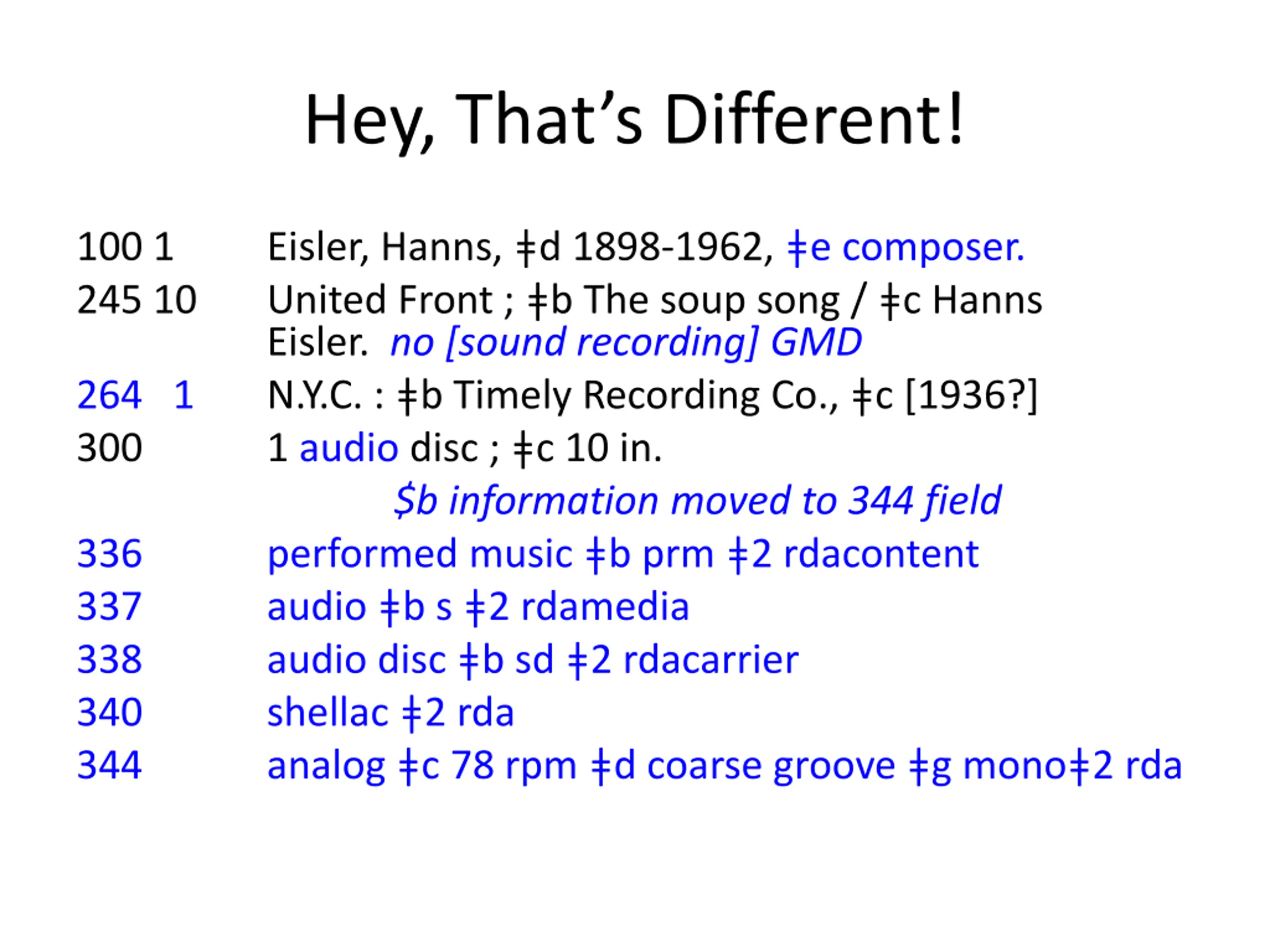 Hey, Thats Different! 100 1 245 10 Eisler, Hanns, d 1898-1962, e composer. United Front ; b The soup song / c Hanns Eisler. no [sound recording] GMD N.Y.C. : b Timely Recording Co., c [1936?] 1 audio disc ; c 10 in. $b information moved to 344 field performed music b prm 2 rdacontent audio b s 2 rdamedia audio disc b sd 2 rdacarrier shellac 2 rda analog c 78 rpm d coarse groove g mono 2 rda 264 1 300 336 337 338 340 344