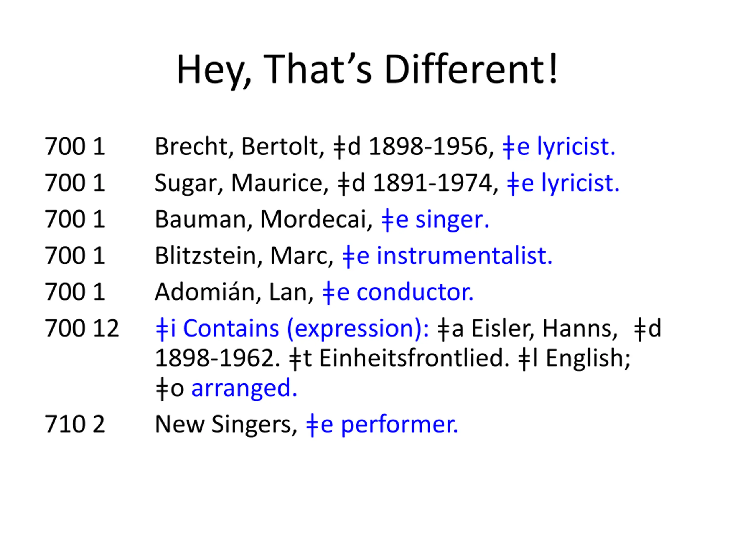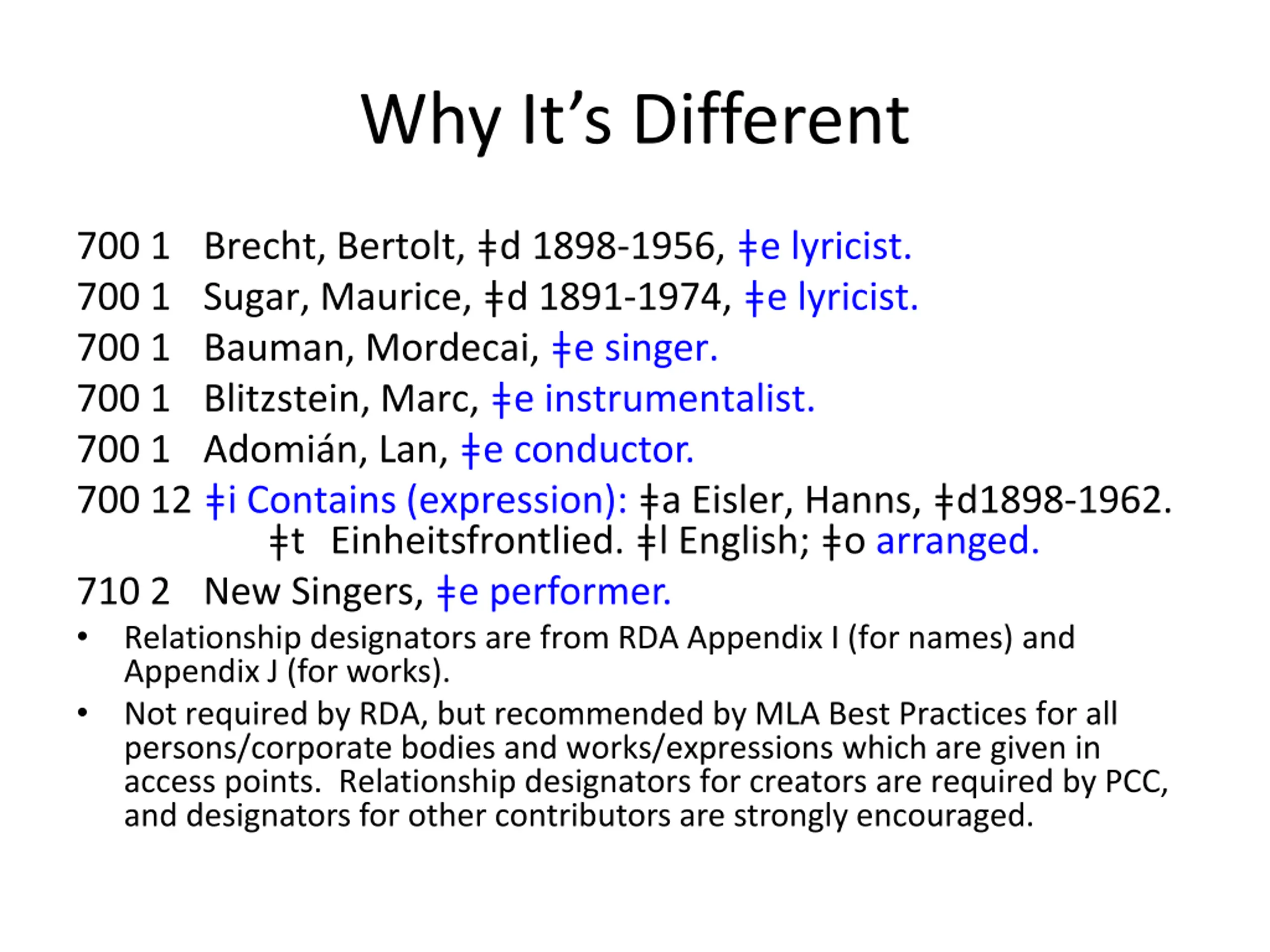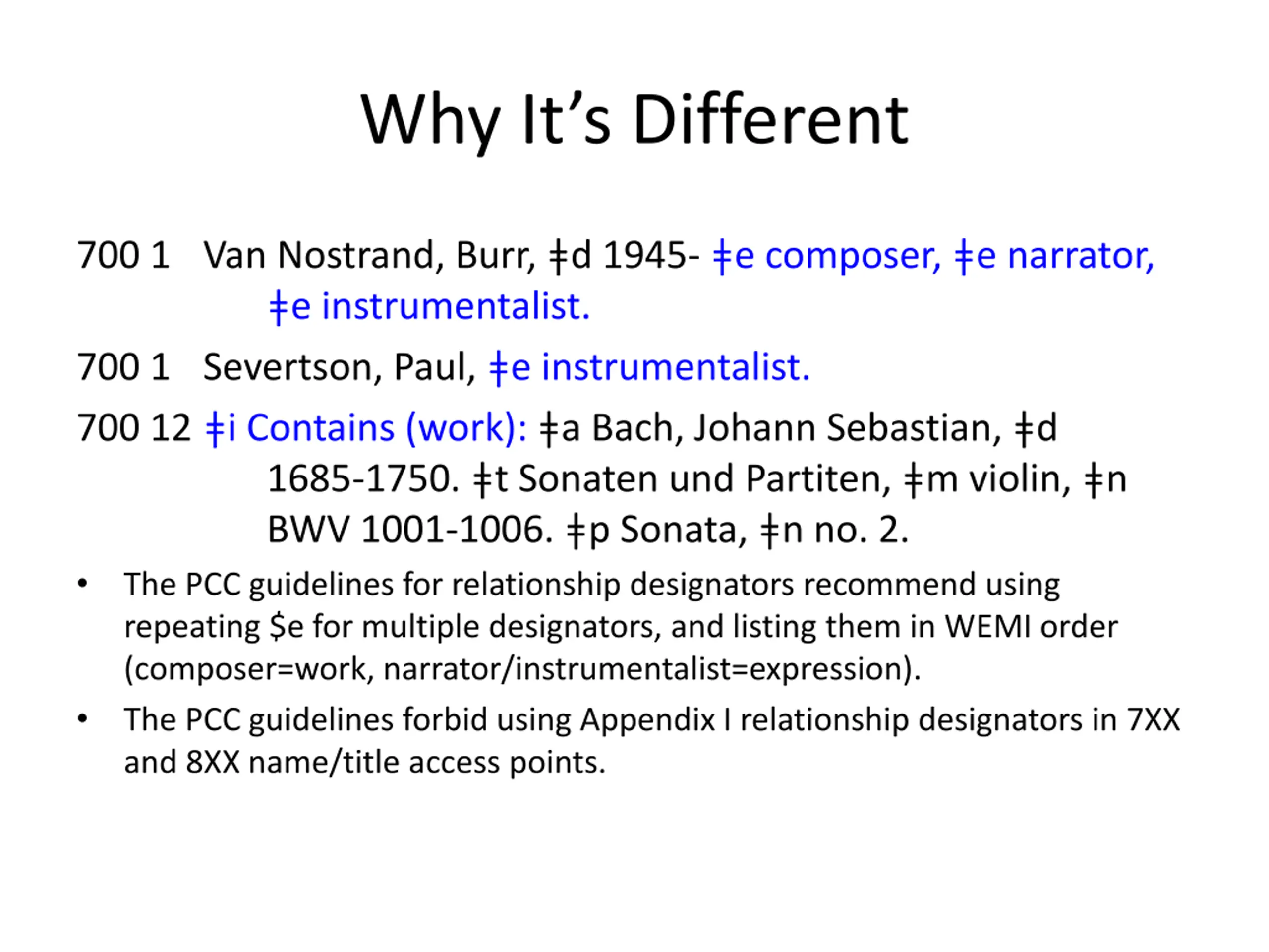 Why Its Different 700 1 Van Nostrand, Burr, d 1945- e composer, e narrator, e instrumentalist. 700 1 Severtson, Paul, e instrumentalist. 700 12 i Contains (work): a Bach, Johann Sebastian, d 1685-1750. t Sonaten und Partiten, m violin, n BWV 1001-1006. p Sonata, n no. 2. The PCC guidelines for relationship designators recommend using repeating $e for multiple designators, and listing them in WEMI order (composer=work, narrator/instrumentalist=expression). The PCC guidelines forbid using Appendix I relationship designators in 7XX and 8XX name/title access points.