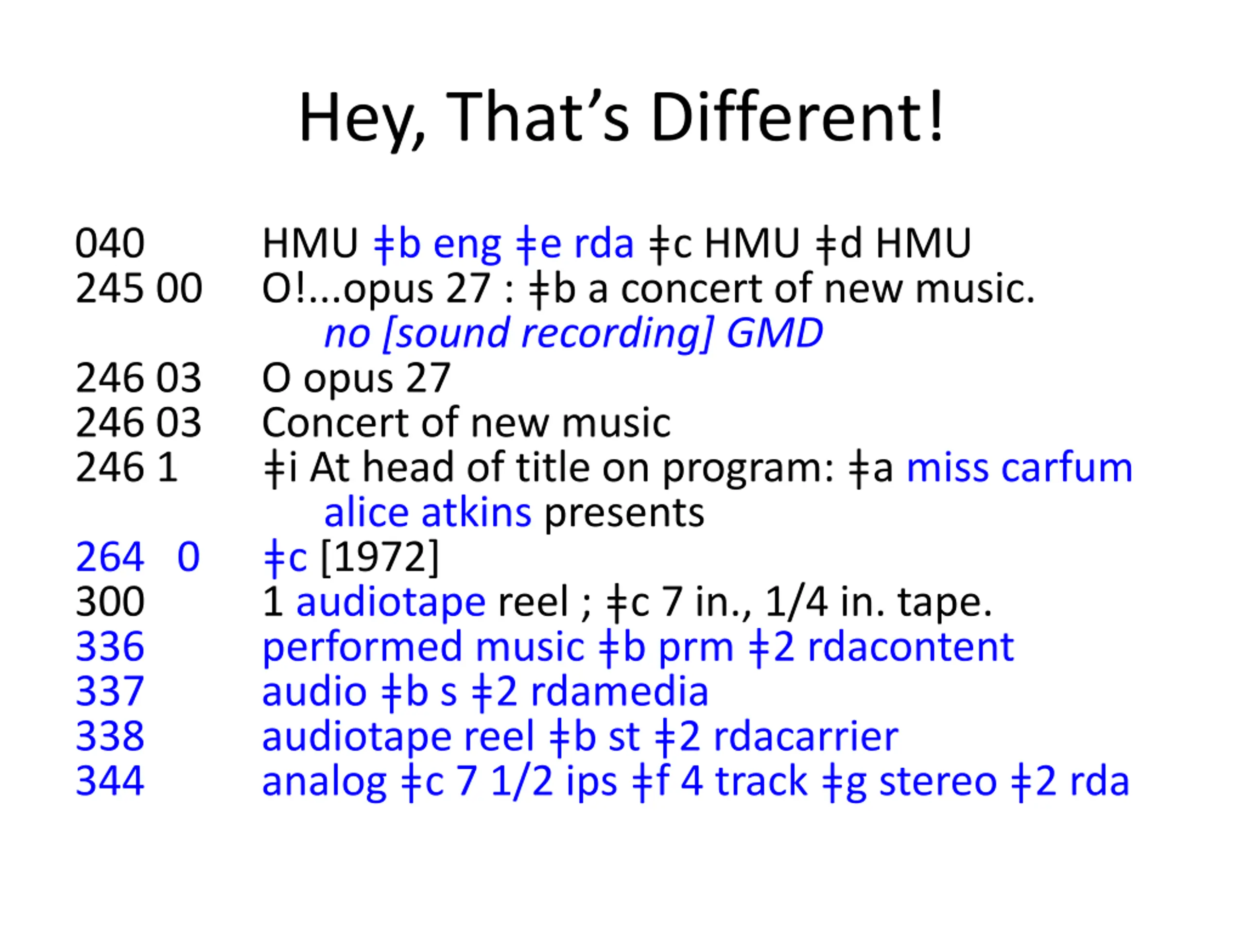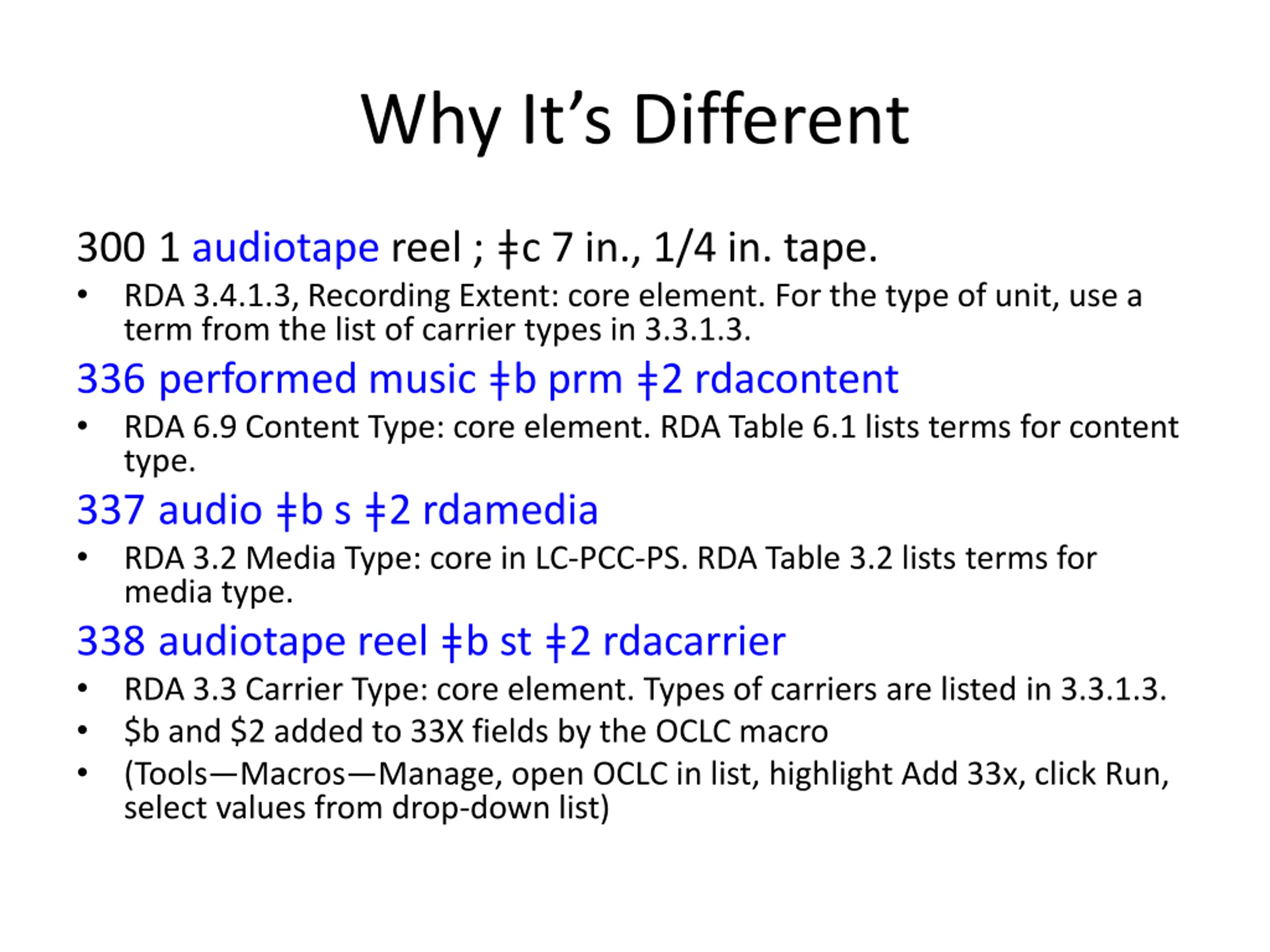 Why Its Different 300 1 audiotape reel ; c 7 in., 1/4 in. tape. RDA 3.4.1.3, Recording Extent: core element. For the type of unit, use a term from the list of carrier types in 3.3.1.3. 336 performed music b prm 2 rdacontent RDA 6.9 Content Type: core element. RDA Table 6.1 lists terms for content type. 337 audio b s 2 rdamedia RDA 3.2 Media Type: core in LC-PCC-PS. RDA Table 3.2 lists terms for media type. 338 audiotape reel b st 2 rdacarrier RDA 3.3 Carrier Type: core element. Types of carriers are listed in 3.3.1.3. $b and $2 added to 33X fields by the OCLC macro (Tools Macros Manage, open OCLC in list, highlight Add 33x, click Run, select values from drop-down list)