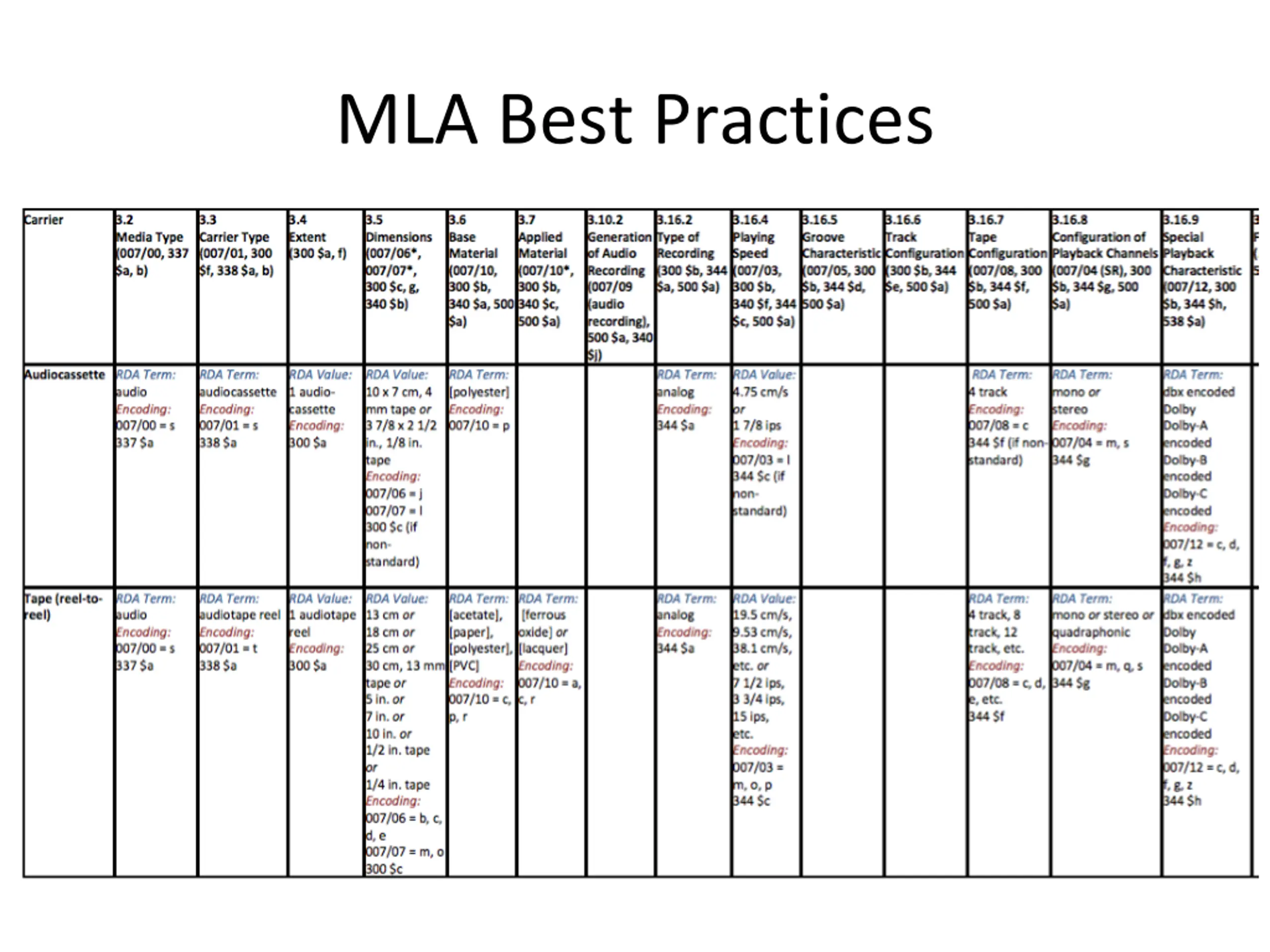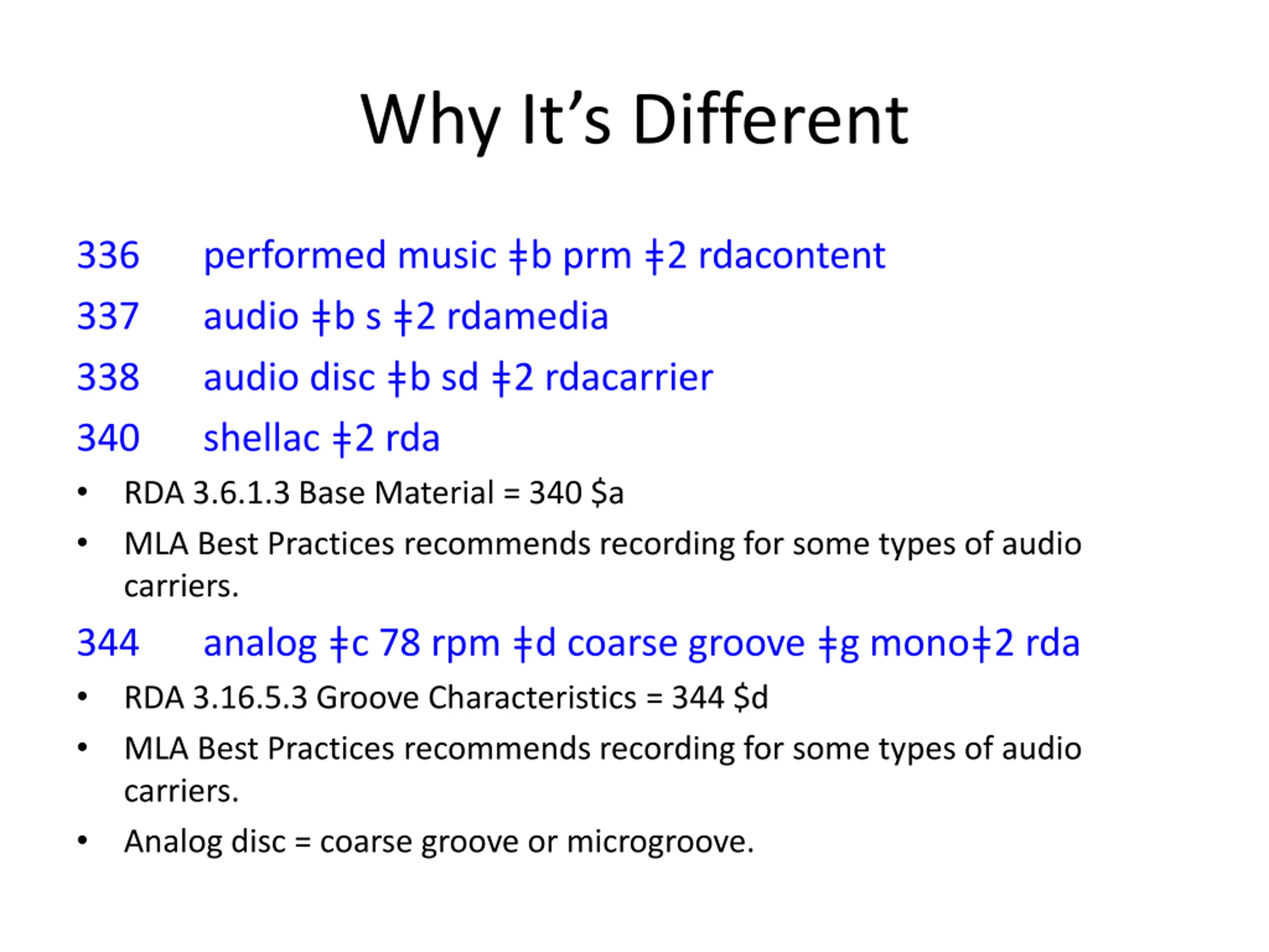 Why Its Different 336 337 338 340 performed music b prm 2 rdacontent audio b s 2 rdamedia audio disc b sd 2 rdacarrier shellac 2 rda RDA 3.6.1.3 Base Material = 340 $a MLA Best Practices recommends recording for some types of audio carriers. 344 analog c 78 rpm d coarse groove g mono 2 rda RDA 3.16.5.3 Groove Characteristics = 344 $d MLA Best Practices recommends recording for some types of audio carriers. Analog disc = coarse groove or microgroove.