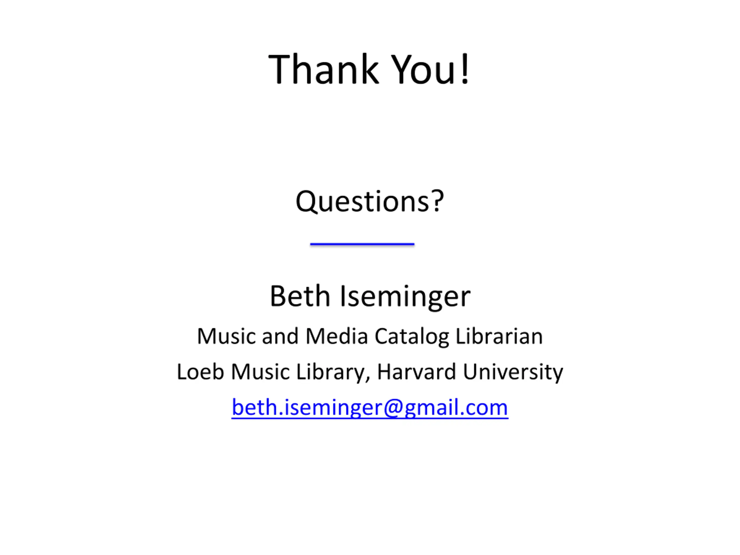 Thank You! Questions? Beth Iseminger Music and Media Catalog Librarian Loeb Music Library, Harvard University beth.iseminger@gmail.com