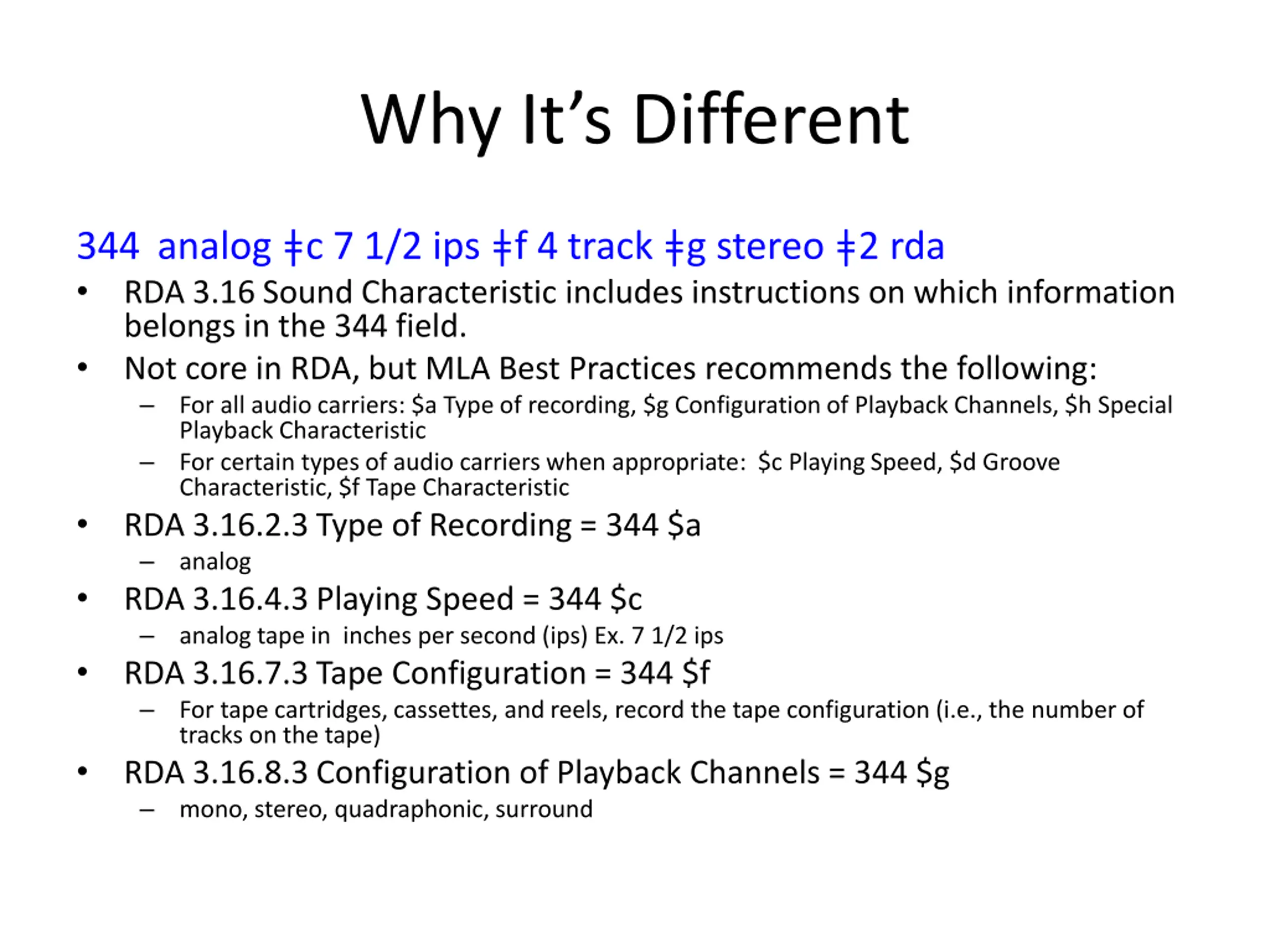Why Its Different 344 analog c 7 1/2 ips f 4 track g stereo 2 rda RDA 3.16 Sound Characteristic includes instructions on which information belongs in the 344 field. Not core in RDA, but MLA Best Practices recommends the following: For all audio carriers: $a Type of recording, $g Configuration of Playback Channels, $h Special Playback Characteristic For certain types of audio carriers when appropriate: $c Playing Speed, $d Groove Characteristic, $f Tape Characteristic RDA 3.16.2.3 Type of Recording = 344 $a analog RDA 3.16.4.3 Playing Speed = 344 $c analog tape in inches per second (ips) Ex. 7 1/2 ips RDA 3.16.7.3 Tape Configuration = 344 $f For tape cartridges, cassettes, and reels, record the tape configuration (i.e., the number of tracks on the tape) RDA 3.16.8.3 Configuration of Playback Channels = 344 $g mono, stereo, quadraphonic, surround